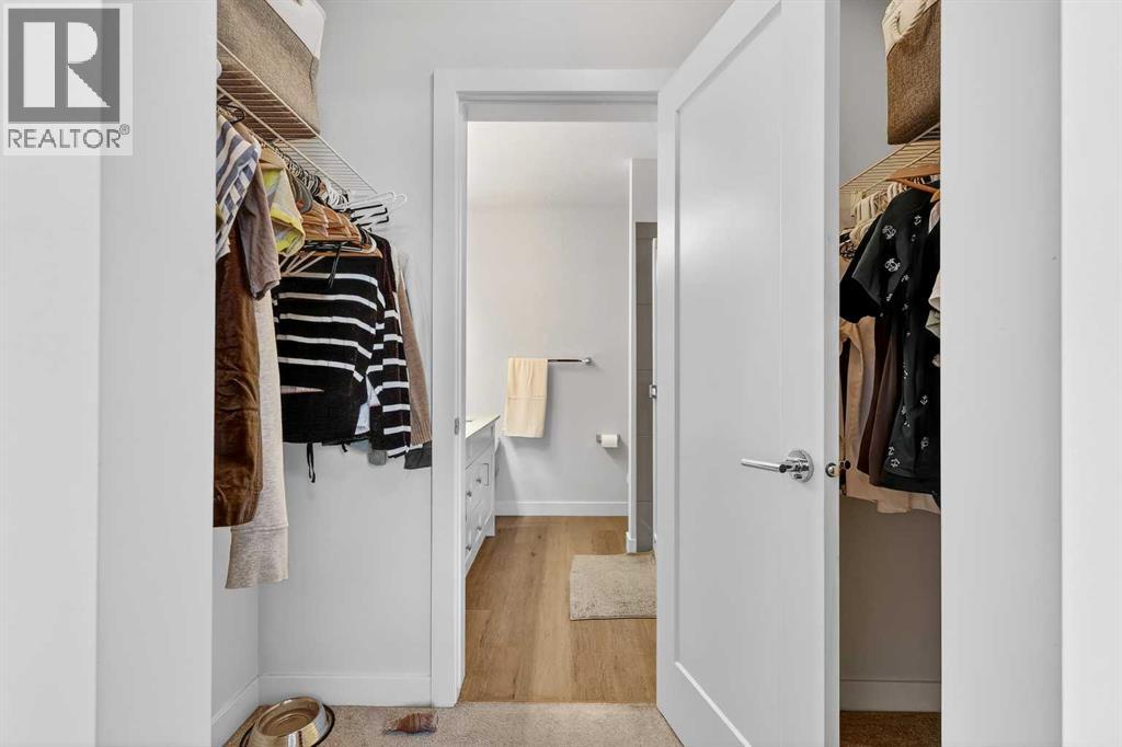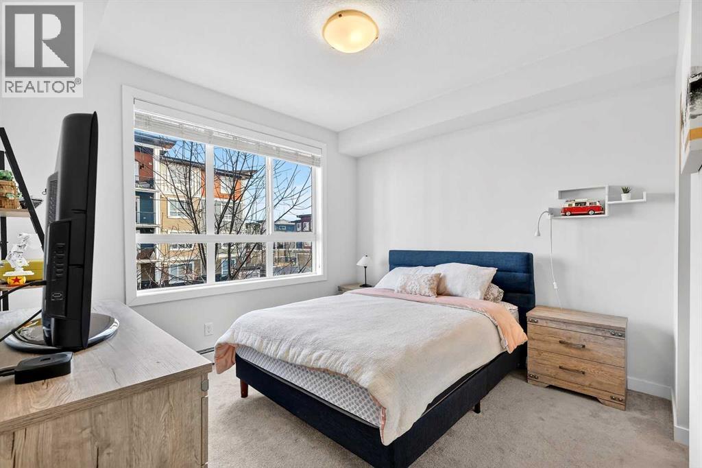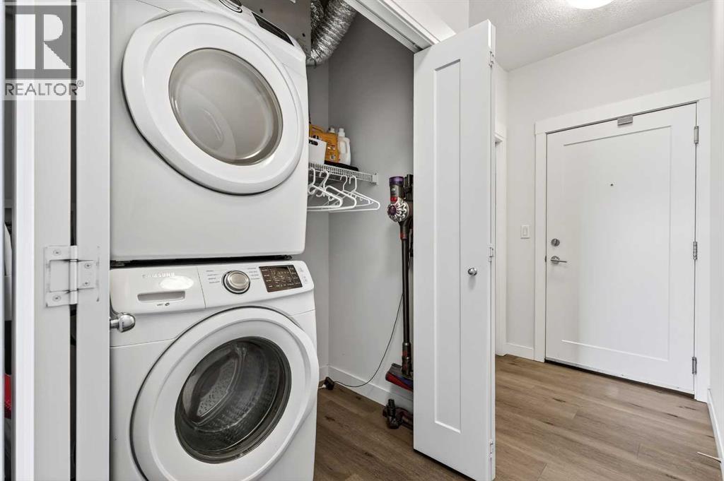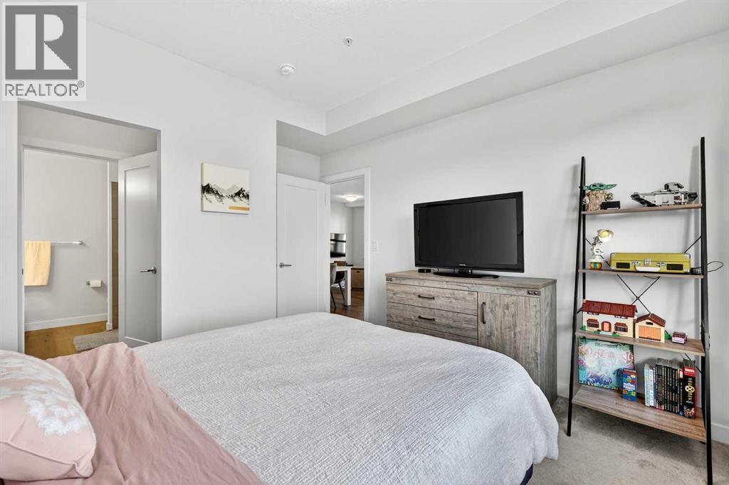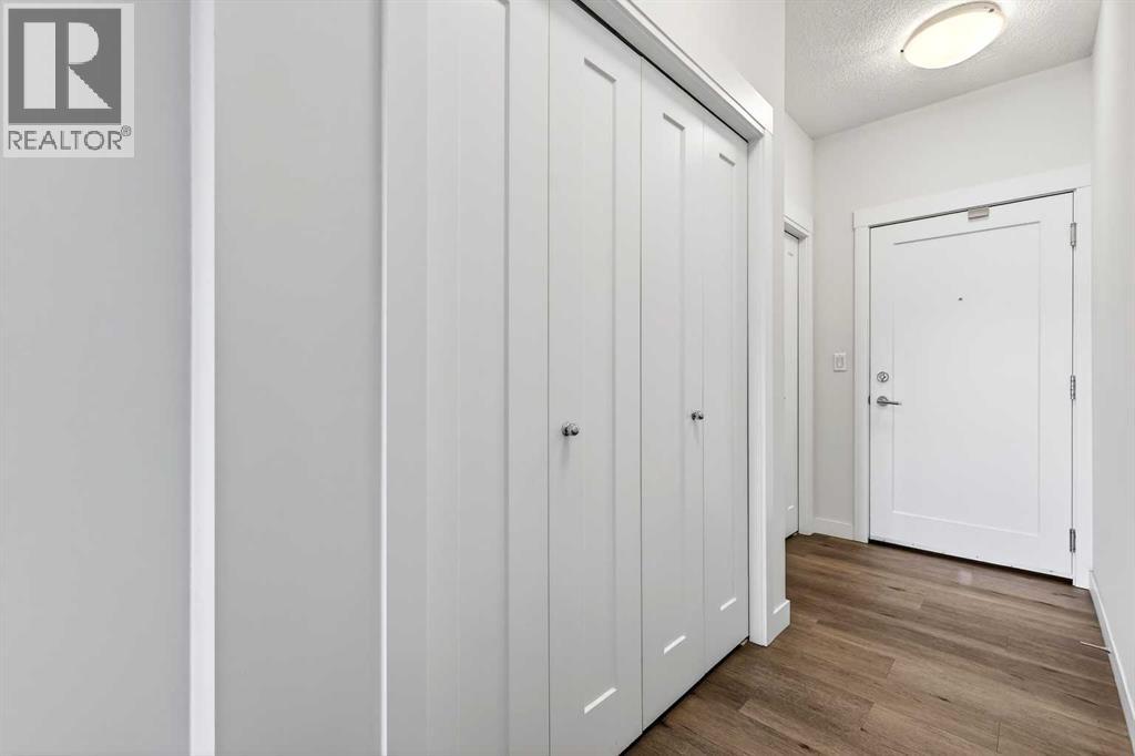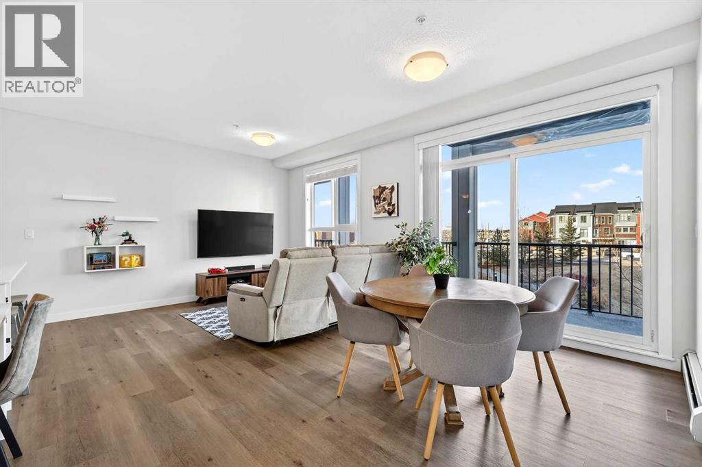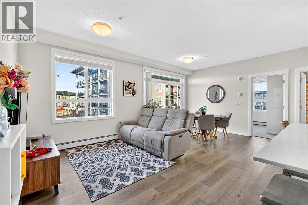 Welcome to this immaculate corner unit featuring TWO TITLED PARKING STALLS (one above ground and the other in the parkade). As you enter, you’re greeted by 9-foot ceilings, an abundance of natural light and a bright open-concept layout with durable luxury vinyl plank flooring throughout the main living space. The modern kitchen showcases modern shaker-style cabinetry with soft close drawers, quartz countertops, upgraded stainless steel appliances with a Samsung French-door refrigerator with ice maker, a sleek chimney hood fan, and a stunning marble herringbone tile backsplash. The extended island provides ample seating and is complemented by stylish pendant lighting, while a convenient pantry with built-in microwave adds extra functionality. The spacious primary bedroom features a walkthrough closet leading to a private ensuite with dual vanities. A second bedroom and full four-piece bathroom offer flexibility for guests, family, or a home office. Step outside to enjoy the generous wrap-around corner balcony complete with a BBQ gas line—perfect for entertaining or relaxing. Ideally located minutes from shopping, dining, and everyday amenities, with easy access to Macleod Trail for a quick commute. Don’t miss this exceptional opportunity—call your favourite realtor to book your private showing today. (id:63190)