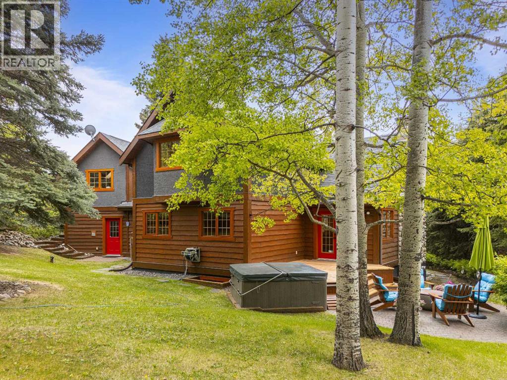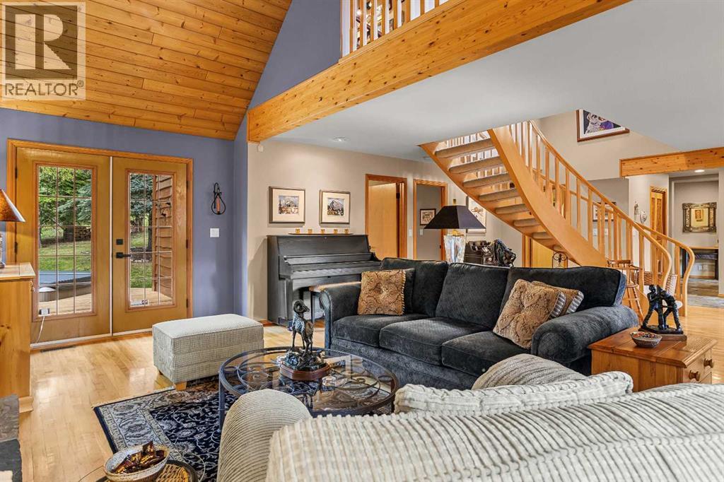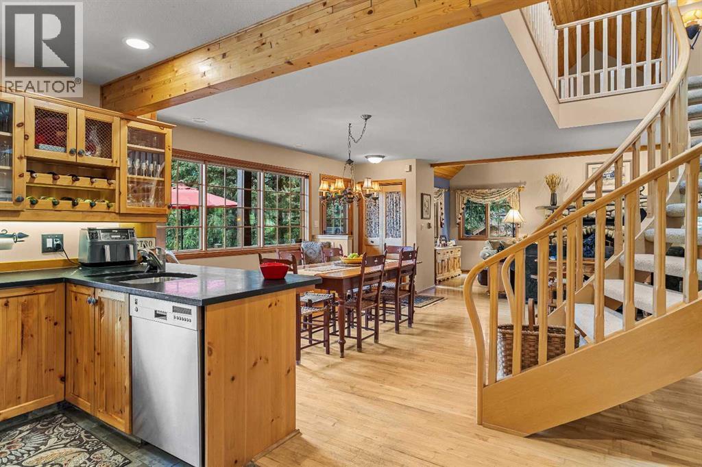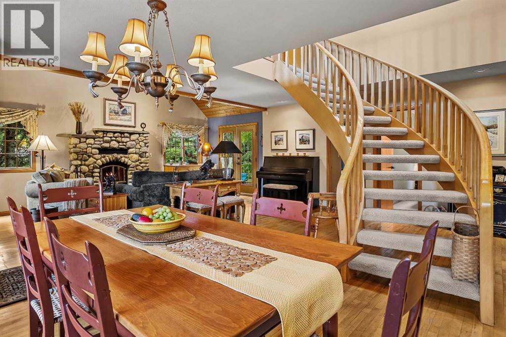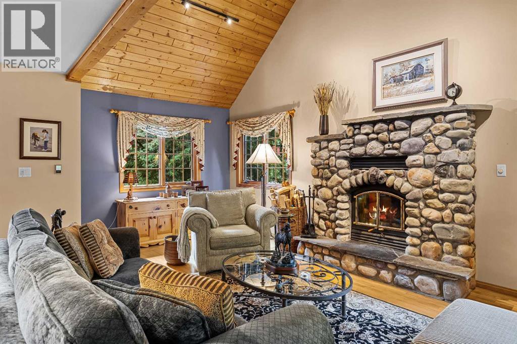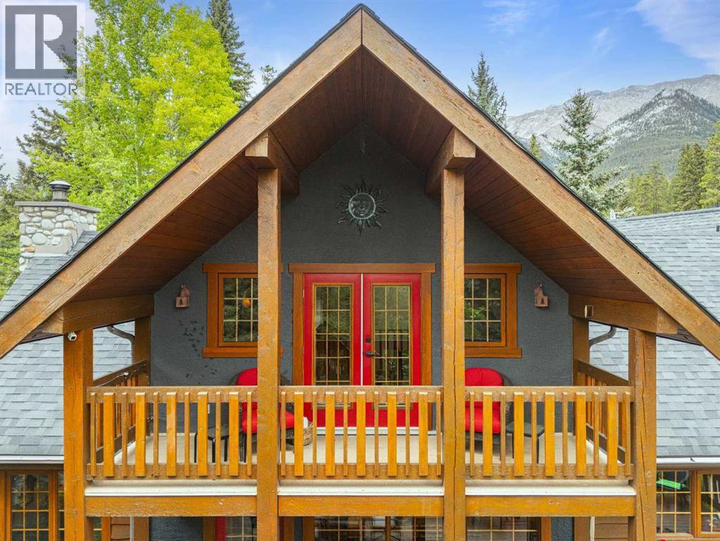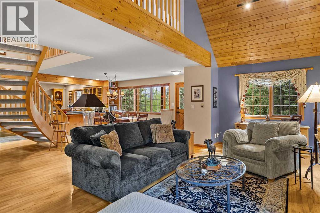 Exempt from the foreign buyer ban, this exquisite mountain estate is quietly nestled in the serene hamlet of Harvie Heights, just minutes from the heart of Canmore. Set on a beautifully landscaped 11,250+ sq.ft. lot and surrounded by mature trees and mountain vistas, this is a rare opportunity to own a private alpine escape. Blending rustic charm with refined comfort, the home features vaulted ceilings, rich hardwood floors, and a spiral staircase that adds architectural elegance to the warm, wood-accented interior. The thoughtful layout includes 4 bedrooms and 3 bathrooms, plus a spacious lower-level family room, and additional storage — ideal for future customization. Four sun-drenched sundecks invite you to relax and take in the sweeping views, while a tandem double garage provides ample space for vehicles and gear. One of the few properties still eligible for foreign ownership, this mountain sanctuary is a truly rare offering in today’s market. (id:63190)