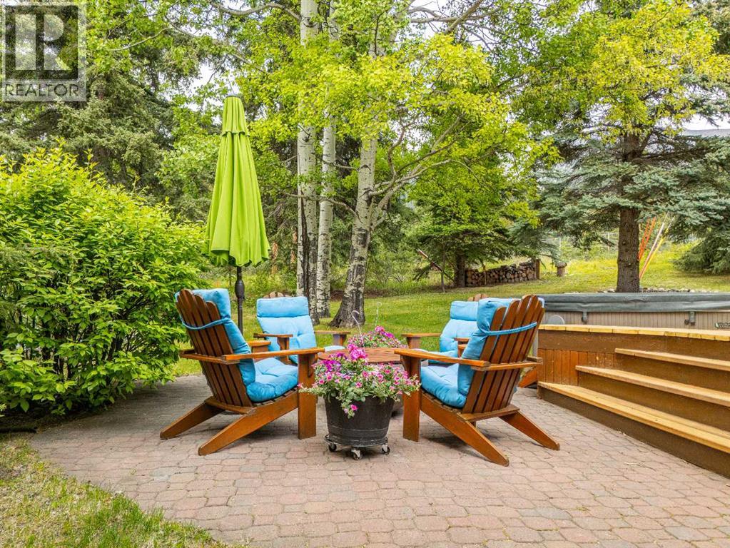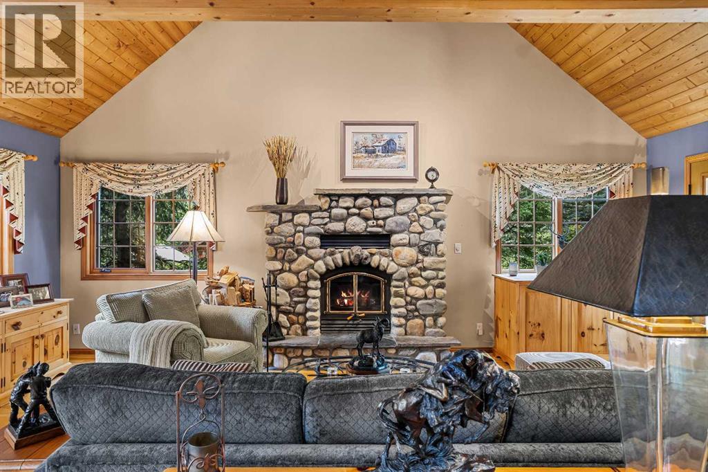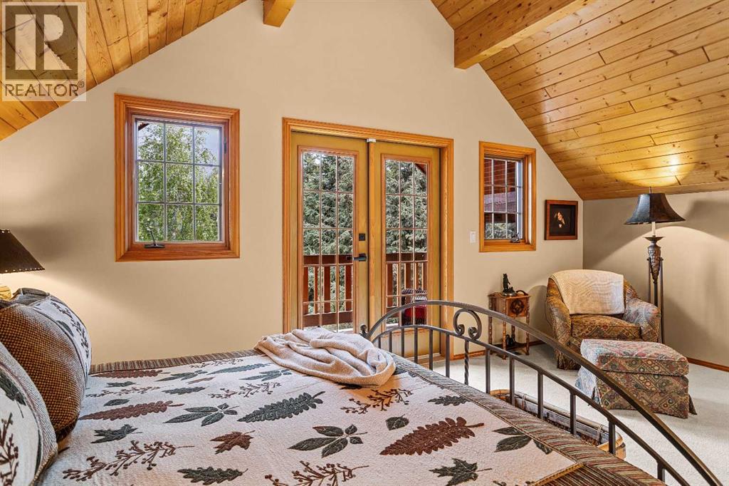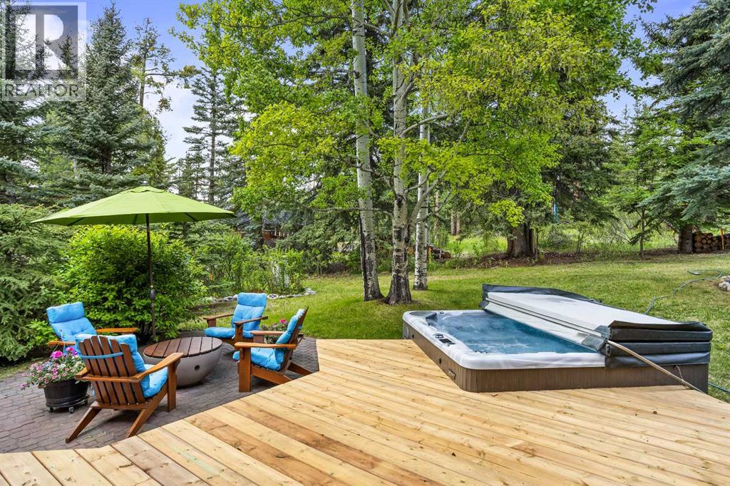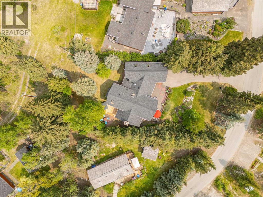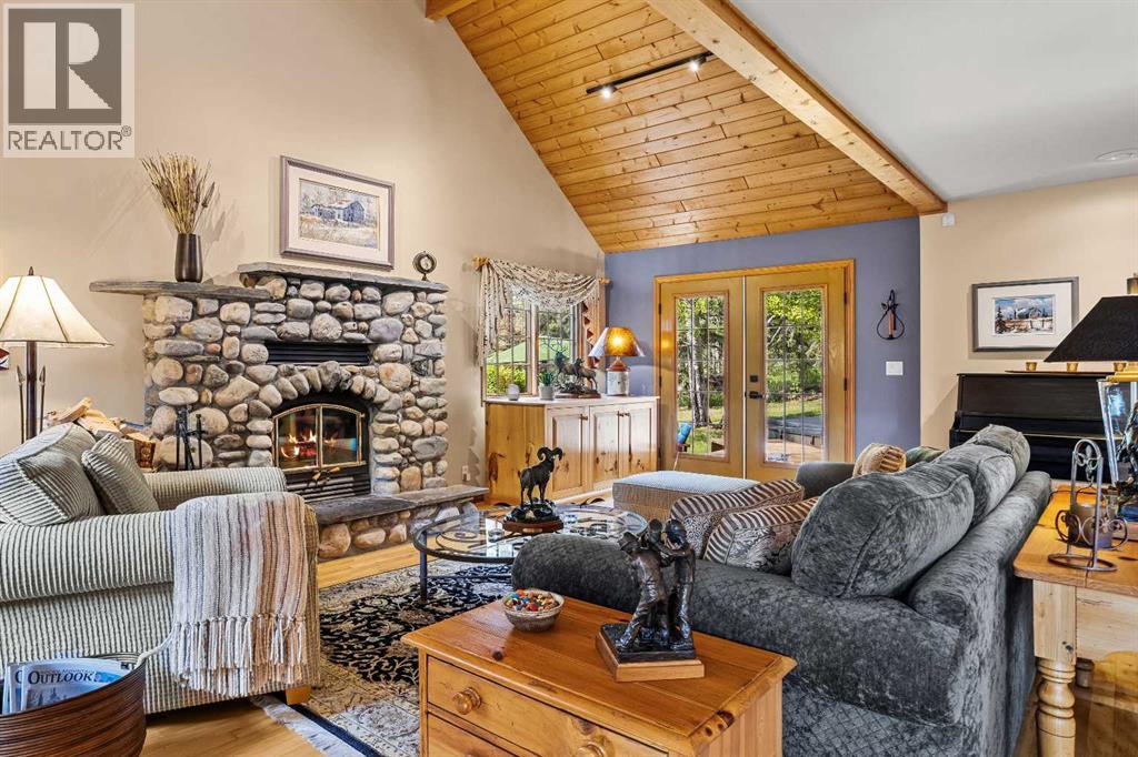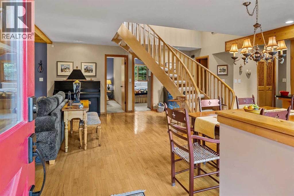 Exempt from the foreign buyer ban, this exquisite mountain estate is quietly nestled in the serene hamlet of Harvie Heights, just minutes from the heart of Canmore. Set on a beautifully landscaped 11,250+ sq.ft. lot and surrounded by mature trees and mountain vistas, this is a rare opportunity to own a private alpine escape. Blending rustic charm with refined comfort, the home features vaulted ceilings, rich hardwood floors, and a spiral staircase that adds architectural elegance to the warm, wood-accented interior. The thoughtful layout includes 4 bedrooms and 3 bathrooms, plus a spacious lower-level family room, and additional storage — ideal for future customization. Four sun-drenched sundecks invite you to relax and take in the sweeping views, while a tandem double garage provides ample space for vehicles and gear. One of the few properties still eligible for foreign ownership, this mountain sanctuary is a truly rare offering in today’s market. (id:63190)