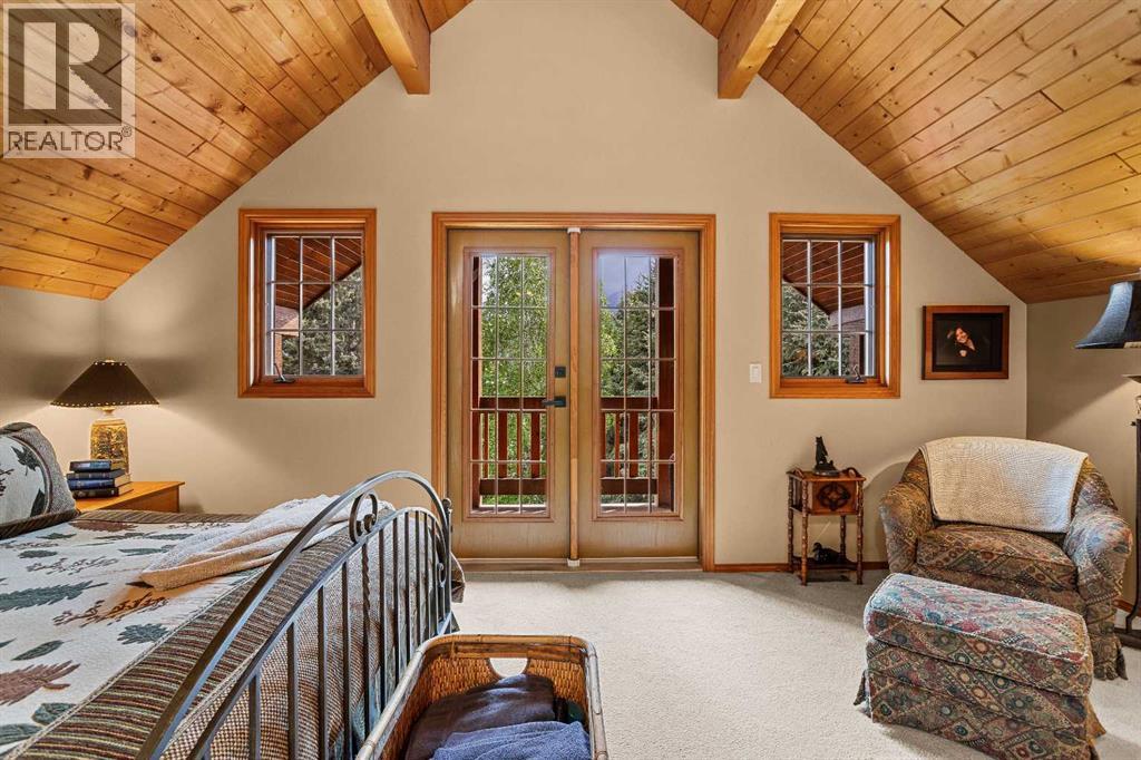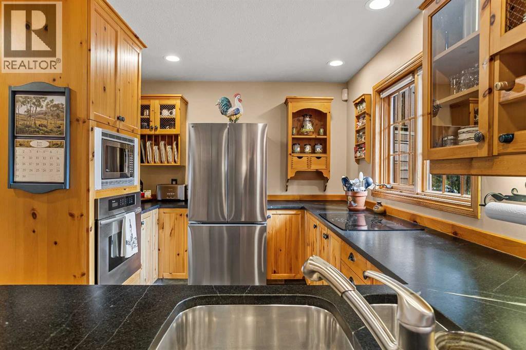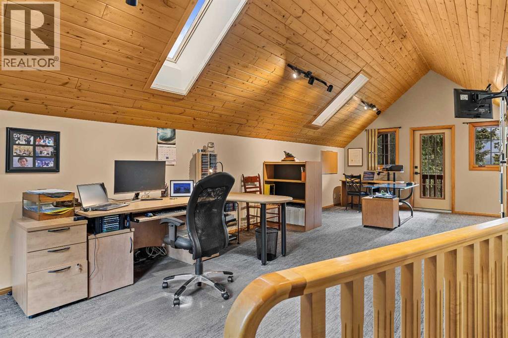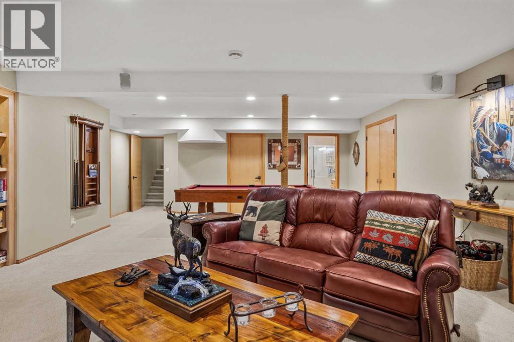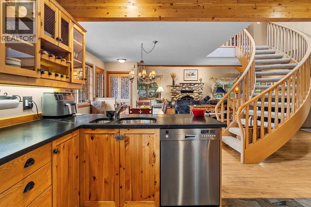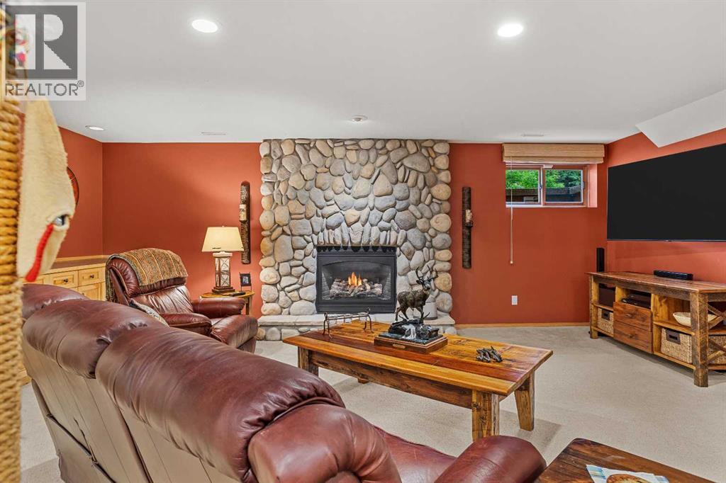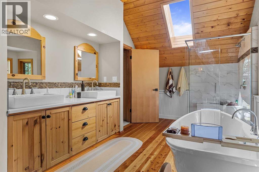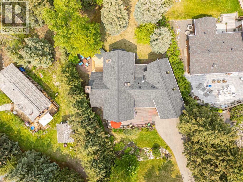Exempt from the foreign buyer ban, this exquisite mountain estate is quietly nestled in the serene hamlet of Harvie Heights, just minutes from the heart of Canmore. Set on a beautifully landscaped 11,250+ sq.ft. lot and surrounded by mature trees and mountain vistas, this is a rare opportunity to own a private alpine escape. Blending rustic charm with refined comfort, the home features vaulted ceilings, rich hardwood floors, and a spiral staircase that adds architectural elegance to the warm, wood-accented interior. The thoughtful layout includes 4 bedrooms and 3 bathrooms, plus a spacious lower-level family room, and additional storage — ideal for future customization. Four sun-drenched sundecks invite you to relax and take in the sweeping views, while a tandem double garage provides ample space for vehicles and gear. One of the few properties still eligible for foreign ownership, this mountain sanctuary is a truly rare offering in today’s market. (id:63190)