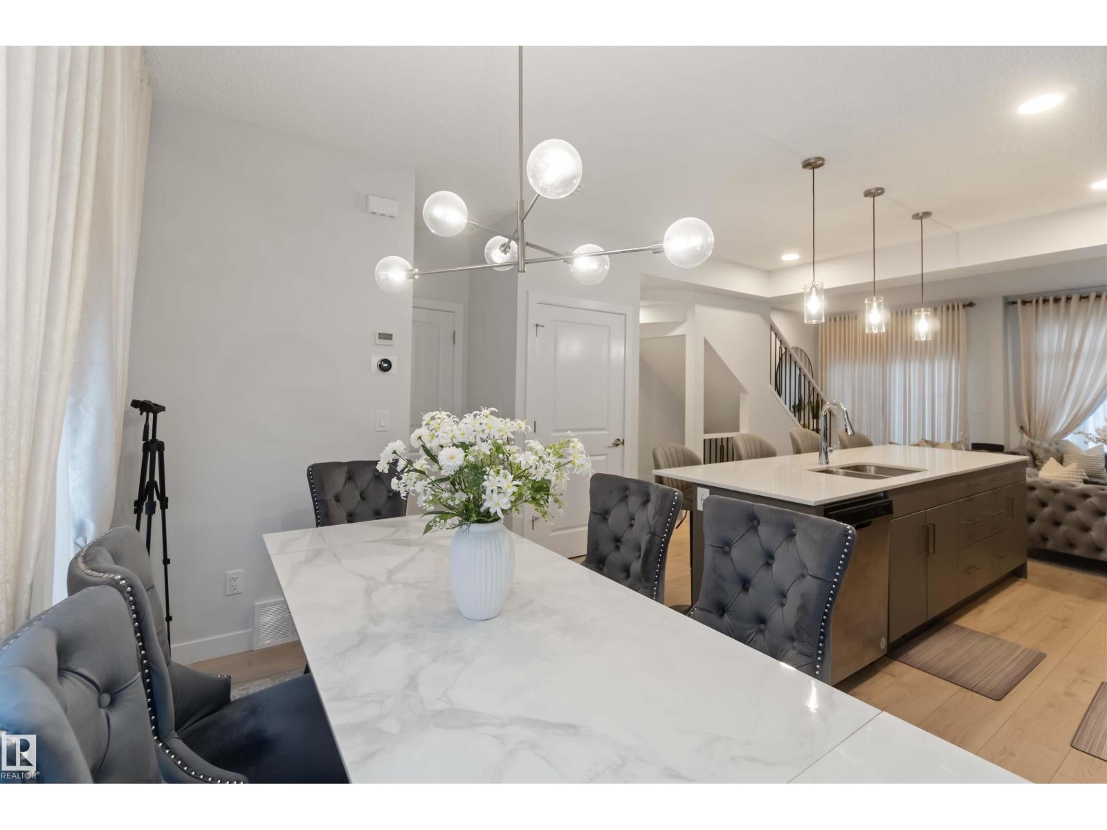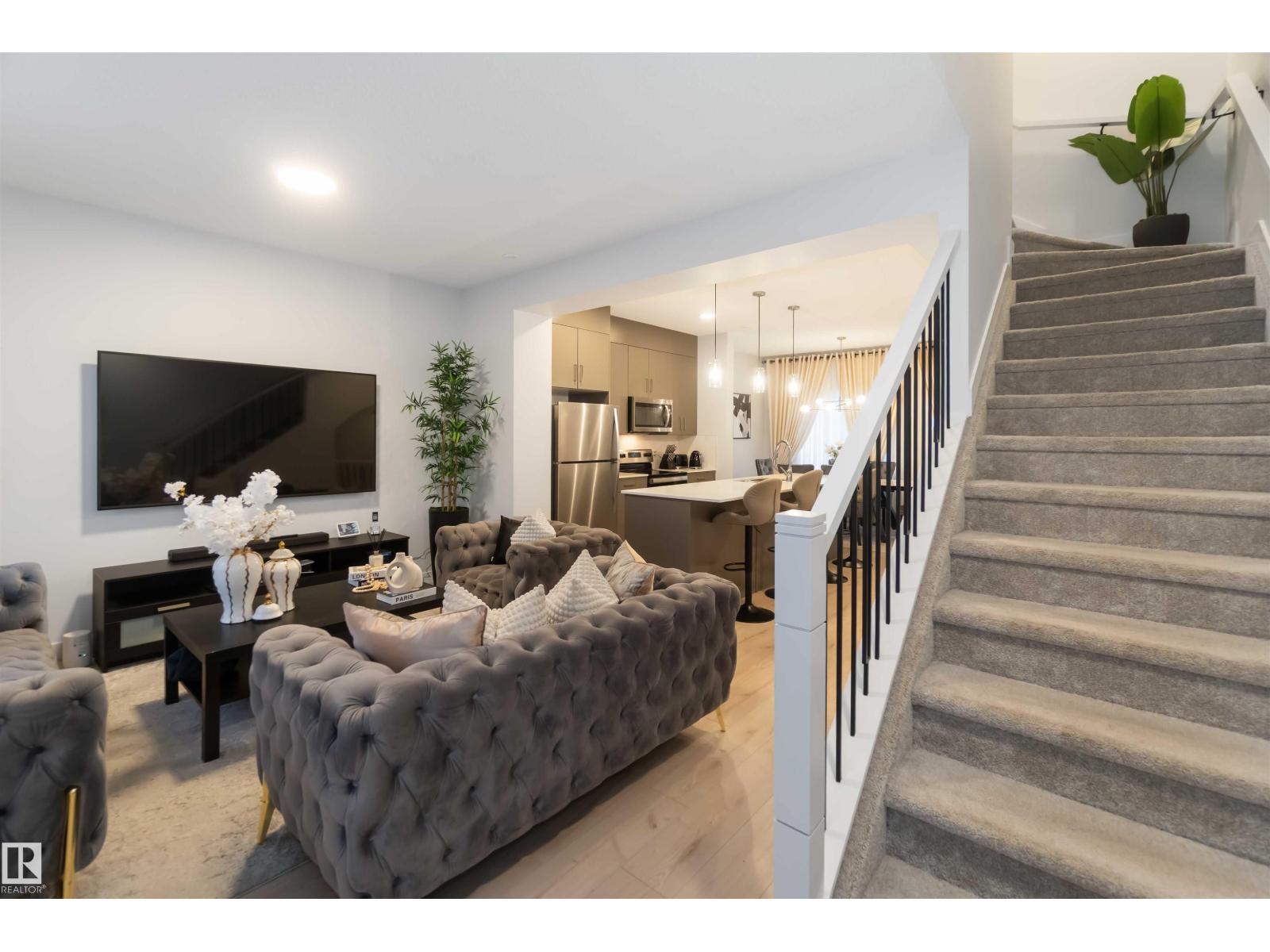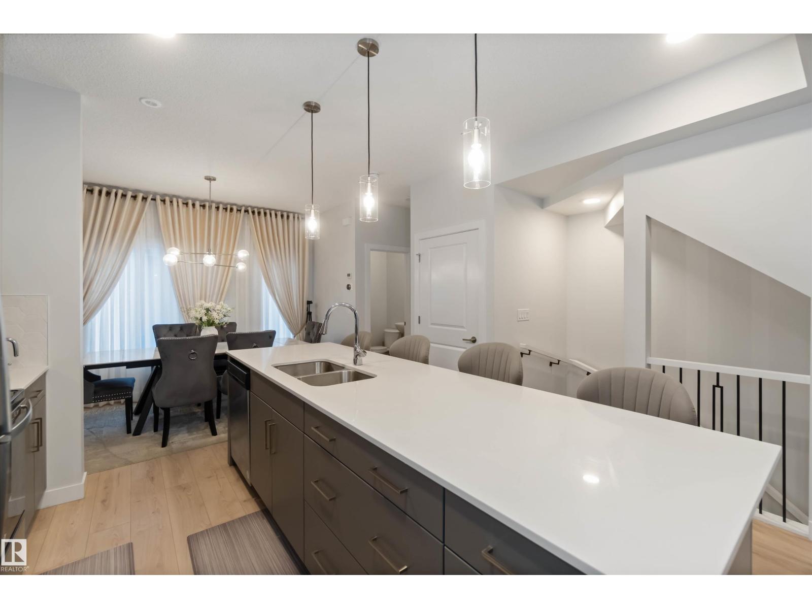 Sophisticated three-storey townhome in the sought-after community of Chappelle, offering 3 bedrooms, 2.5 bathrooms, and a double attached garage. This beautifully appointed home features 9-foot ceilings, quartz countertops throughout, and a stunning modern kitchen with stainless steel appliances, an oversized 10-foot island, pendant lighting, and access to a spacious balcony—ideal for entertaining. A versatile den provides the perfect space for a home office or guest area, while smart-home upgrades include a Nest thermostat, SkyBell doorbell camera, and keyless entry. Enjoy maintenance-free living with landscaping and snow removal included. Surrounded by wetlands, parks, and green space, and offering over 9.8 km of walking and biking trails, this exceptional home blends luxury, lifestyle, and location. (id:63190)