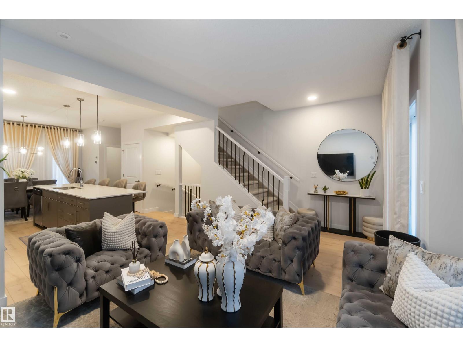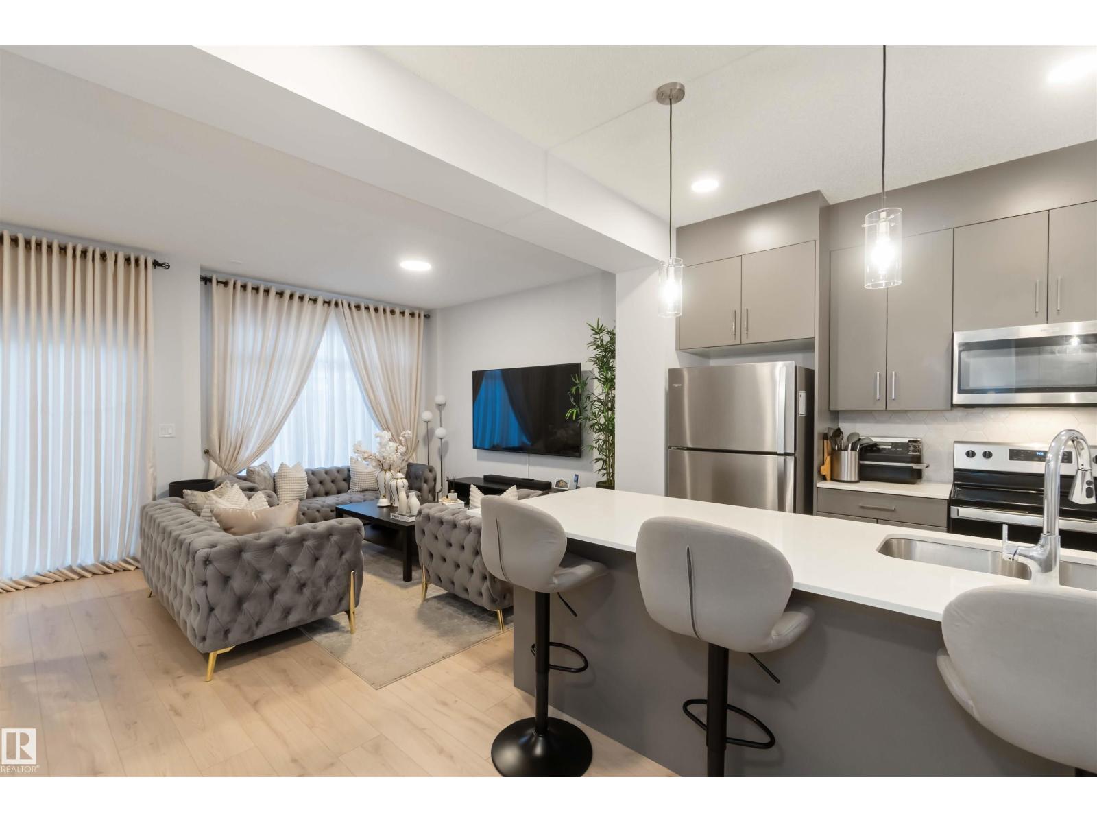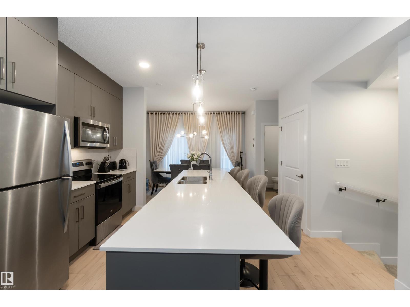 Sophisticated three-storey townhome in the sought-after community of Chappelle, offering 3 bedrooms, 2.5 bathrooms, and a double attached garage. This beautifully appointed home features 9-foot ceilings, quartz countertops throughout, and a stunning modern kitchen with stainless steel appliances, an oversized 10-foot island, pendant lighting, and access to a spacious balcony—ideal for entertaining. A versatile den provides the perfect space for a home office or guest area, while smart-home upgrades include a Nest thermostat, SkyBell doorbell camera, and keyless entry. Enjoy maintenance-free living with landscaping and snow removal included. Surrounded by wetlands, parks, and green space, and offering over 9.8 km of walking and biking trails, this exceptional home blends luxury, lifestyle, and location. (id:63190)