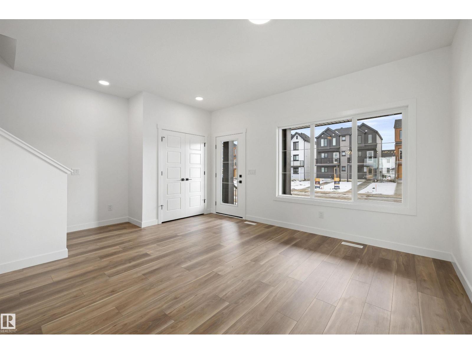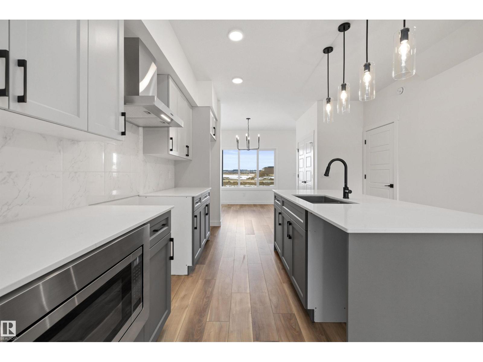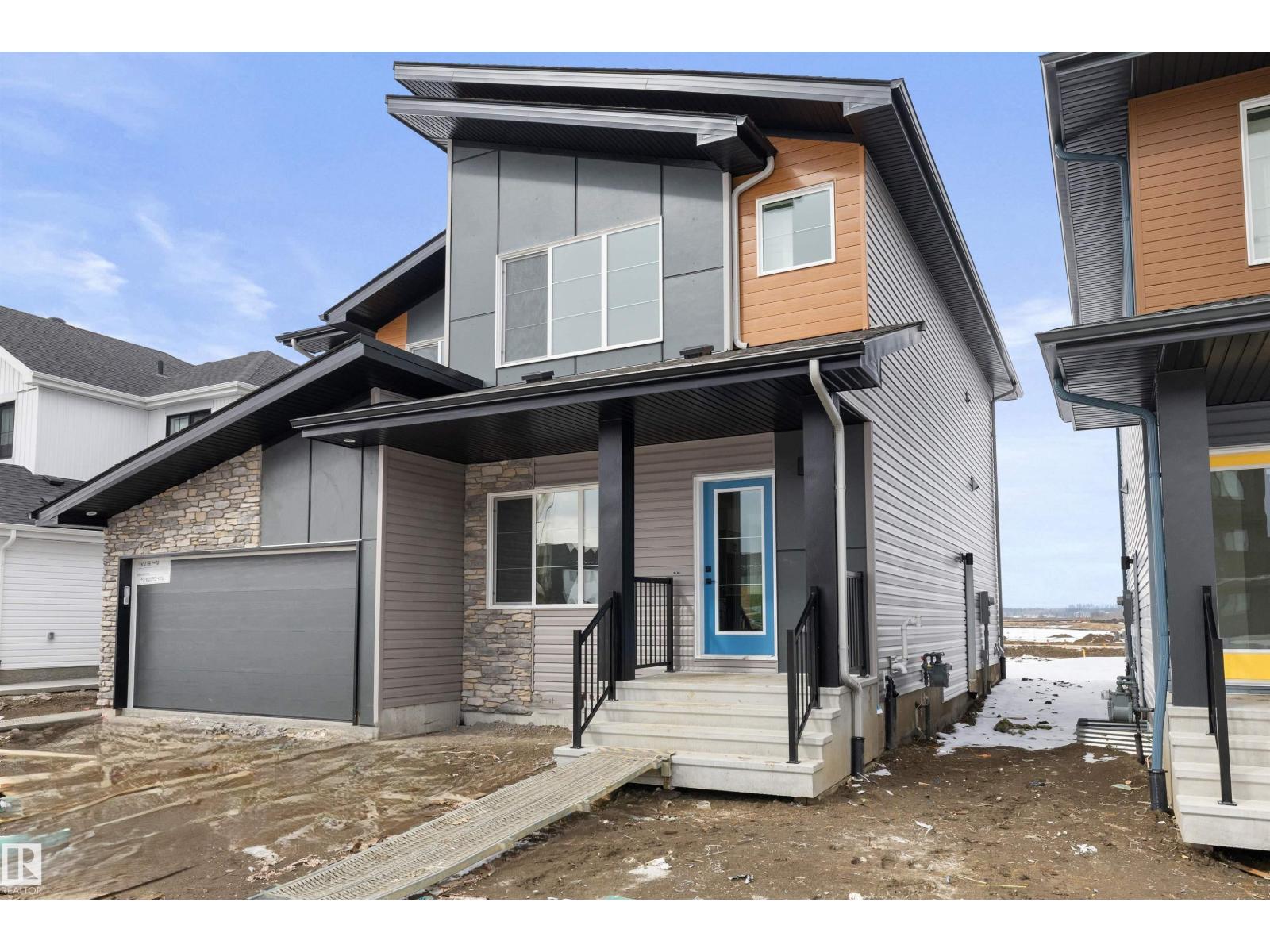 Built by Sterling Homes, this modern duplex in Marquis offers stylish living in a growing northeast community near parks, trails, and future amenities. Triple pane windows and 9’ ceilings create a bright, open main floor with sleek luxury vinyl plank flooring throughout. The kitchen features quartz countertops, a central island with seating, upgraded cabinetry, chimney hood fan, full-height tile backsplash, and built-in microwave. Large rear windows fill the dining nook with natural light, while a nearby pantry and half bath add convenience. A side entrance offers flexibility for future development or separate access. Upstairs, the primary suite includes a walk-in closet and 3-piece ensuite, along with two additional bedrooms, a full bath, upper-floor laundry, and a versatile loft. A backyard parking pad, double attached garage with floor drain, and basement rough-ins complete this well-designed home in a community poised for growth. (id:63190)