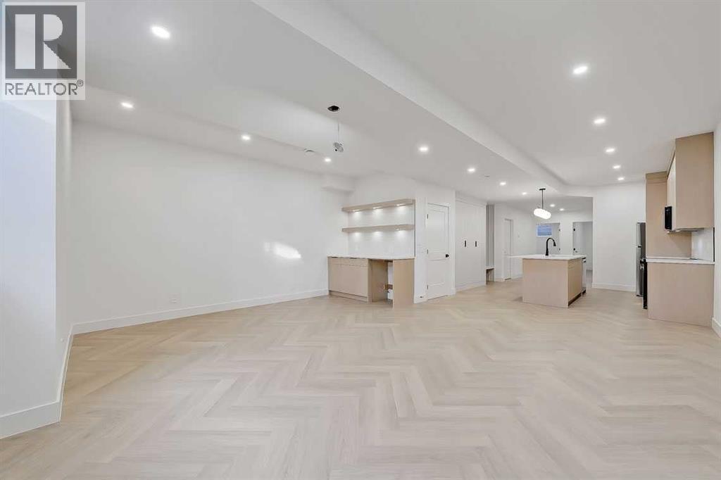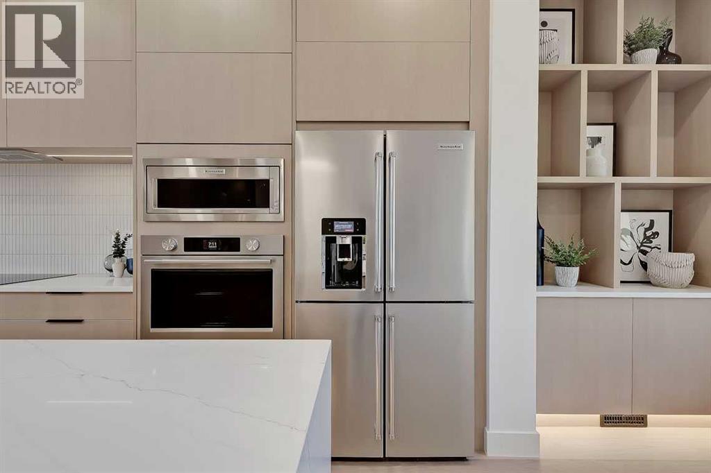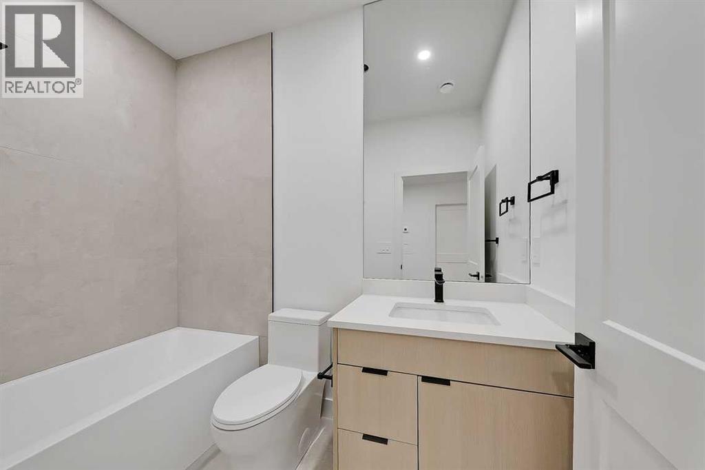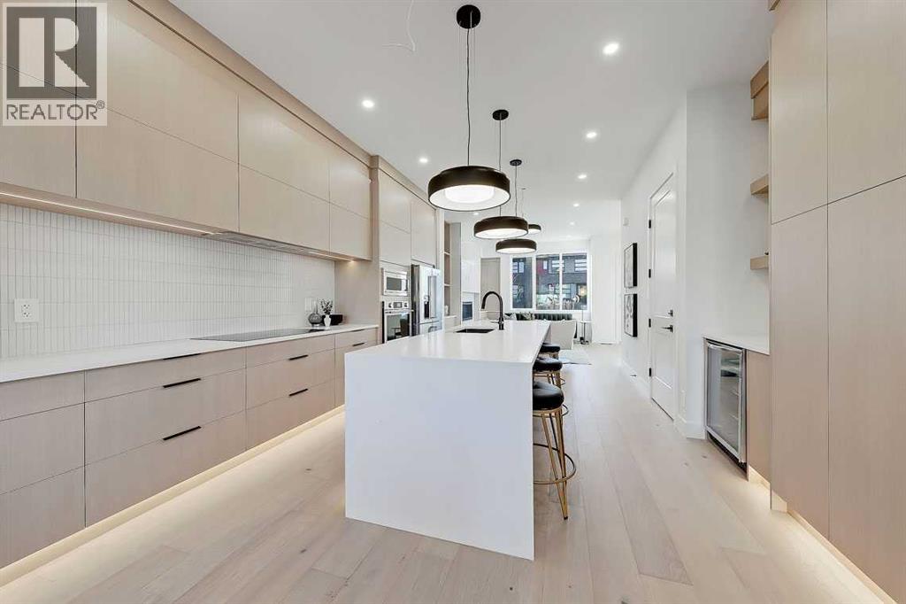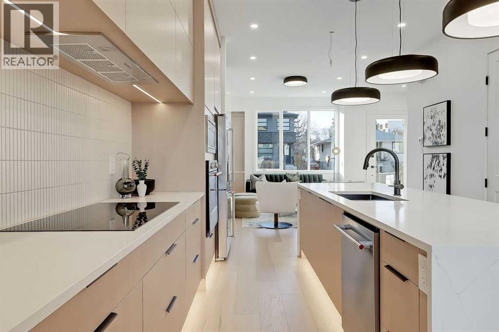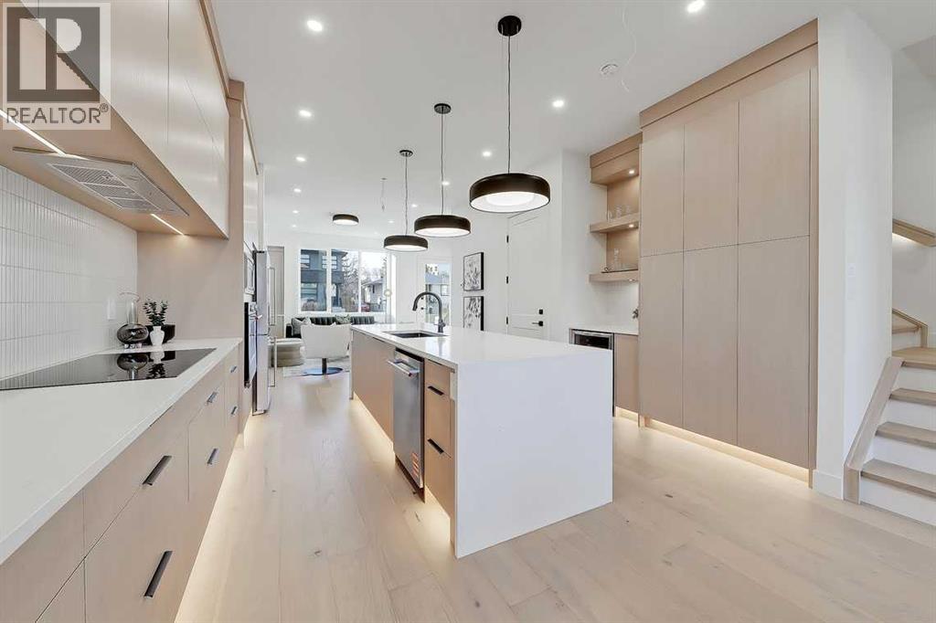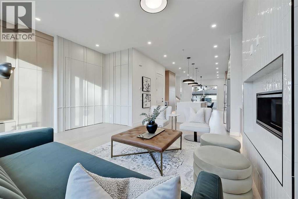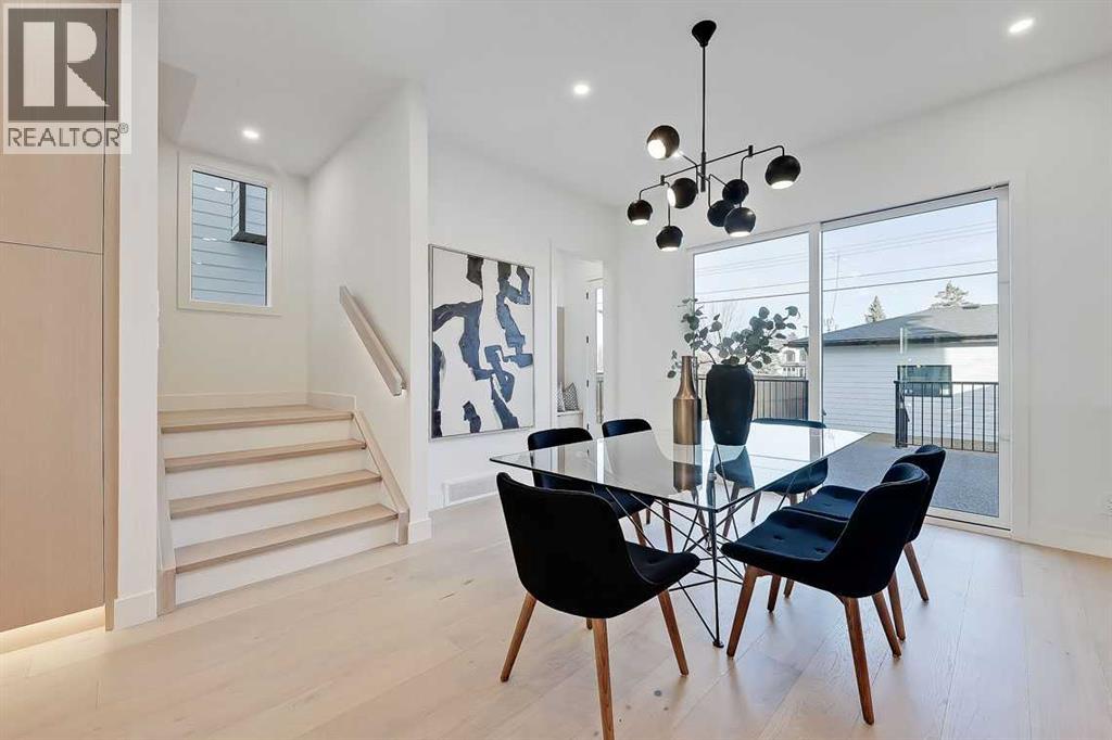 This architecturally striking semi-detached infill in Killarney is a refined expression of modern Scandinavian design, thoughtfully layered with mid-century modern elements. Clean lines, warm wood tones, minimalist detailing, and intentional functionality come together in a home that feels both sophisticated and welcoming. With three fully finished levels and an RARE EXTENDED BASEMENT featuring a legal 2-bedroom suite, this residence offers elevated design, smart versatility, and exceptional income potential in one of Calgary’s most desirable inner-city communities.Step inside to a bright, airy foyer where clean millwork and a built-in bench create an organized and understated welcome. A discreet, hidden door conceals the powder room, maintaining the seamless, minimalist aesthetic that defines the main floor. The open-concept layout is enhanced by 10-foot ceilings, oversized windows, and warm natural finishes that reflect Scandinavian simplicity while mid-century inspired lighting and architectural detailing add depth and character.The living room is anchored by a sleek fireplace and flows effortlessly into the kitchen — a space designed as beautifully as it performs. Quartz countertops, full-height custom cabinetry, a built-in pantry & coffee station, and stainless steel appliances offer both style and functionality. The oversized island invites gathering & connection.The dining area is a standout architectural feature, complete with a built-in decorative buffet showcasing full-length shelving with integrated lighting & elegant fluted glass cabinetry. This thoughtfully designed focal point adds warmth, texture, and curated display space while enhancing the home’s cohesive Scandinavian aesthetic. Expansive sliding doors open from the dining space, seamlessly extending the living area onto the rear deck and backyard — creating effortless indoor-outdoor flow ideal for entertaining and everyday living.At the back of the home, a mudroom with sleek built-in stora ge & bench seating adds everyday convenience without compromising the streamlined design.Upstairs, the primary retreat offers a vaulted ceiling, private WEST facing balcony, and a spa-inspired ensuite with dual vanities, a soaker tub, and glass-enclosed tiled shower with body jets. Two additional bedrooms, a full bath, and upper laundry complete the level.The extended basement is fully developed into a self-contained legal 2-bedroom suite featuring HERRINGBONE floors, a full kitchen with quartz counters, island with seating, separate laundry, a 4-piece bath, and an oversized living & dining area that create a space that feels open, comfortable, and far above typical lower-level living.Walking distance to Shaganappi LRT, local amenities, schools, parks, and the Killarney Aquatic Centre — with quick access to downtown & major routes — this home offers the perfect balance of timeless design and everyday functionality. Experience elevated inner-city living in Killarney — book your private showing today. (id:63190)