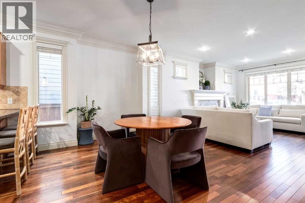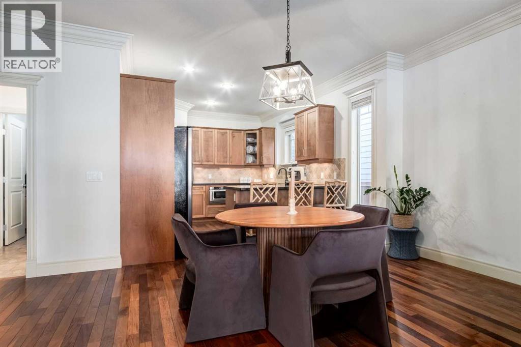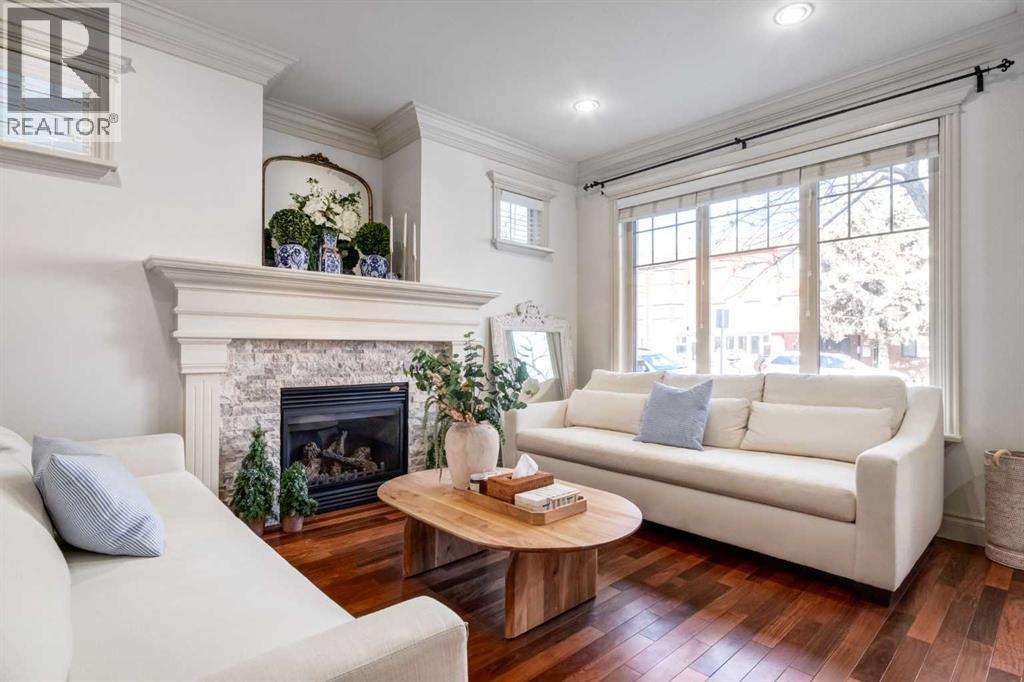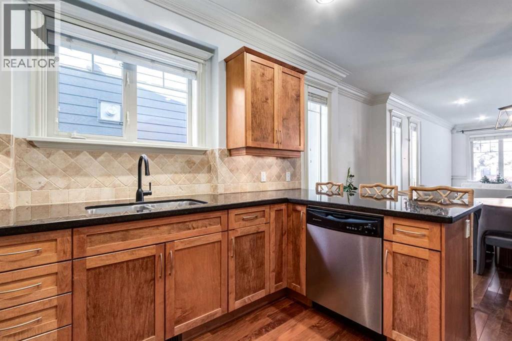 Welcome to the Brownstones of West Hillhurst. Presenting this unique opportunity to own a timeless and traditionally crafted home designed by locally acclaimed architect John Hadden. This highly sought-after location is walking distance to the trendy Kensington district featuring fine cafes, restaurants and retail shops. Minutes away from the University of Calgary and convenient access to downtown, this home is perfect for all demographics. This exceptional 3-bedroom front unit offers over 2100 square foot of living space, enhanced by luxurious finishes, soaring 9’ ceilings, crown moulding, recessed pot lighting, exquisite trim and hardwood floors. The home opens effortlessly into the living room featuring a cozy stone faced gas fireplace with mantle and overlooks your private north facing fenced patio allowing for abundant sunlight, creating a bright and welcoming atmosphere. Beyond the living room you will find the dedicated dining room which flows into a culinary dream. The impressive gourmet kitchen features a gas range and convection oven, 20 amp outlets, under-cabinet lighting, Frigidaire Gallery stainless steel appliances, built-in drawer microwave, shaker panel stained maple cabinets and rich granite counters. The laundry room with wash sink and 2-piece bathroom complete the main floor. On the upper level, the primary bedroom is detailed with elegant wainscoting, vaulted ceiling with remote operated ceiling fan and walk-in closet with custom organization. The spa inspired 5 piece ensuite features dual vanities, an oversized soaker tub and a standalone glass shower. The second bedroom includes 2 large closets and jack-and-jill 4-piece bathroom. Venture into the fully finished basement, a flexible space ideal for relaxation, entertainment or extra workspace. Here you'll find a generous recreation room featuring a dry bar with bar fridge, wine rack and granite counter top. An additional bedroom with private 4-piece bathroom, large storage room and utility room completes this lower level. Low monthly condo fees take care of all exterior yard maintenance, irrigation, snow removal, garage utilities and more. Welcome to a thoughtfully designed residence that offers a traditional style with an exceptional location —welcome home to the Brownstones. (id:63190)