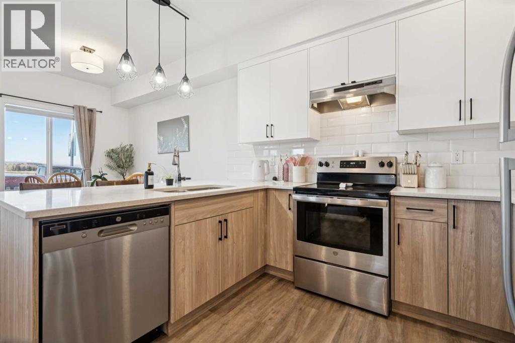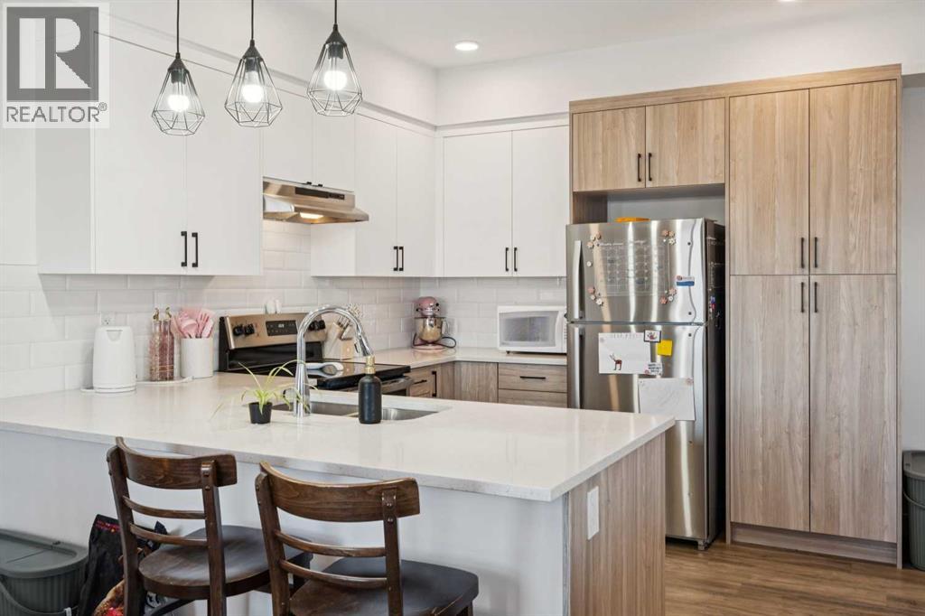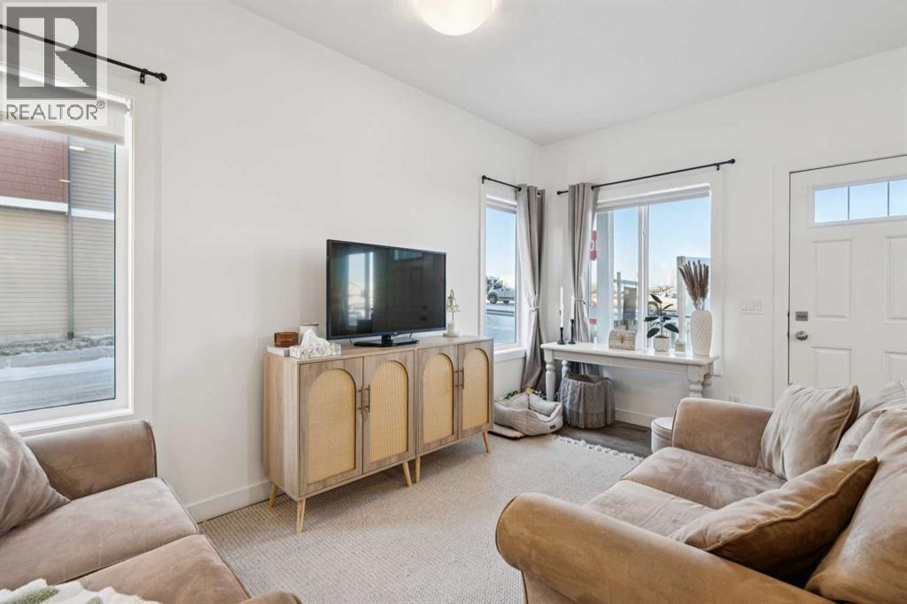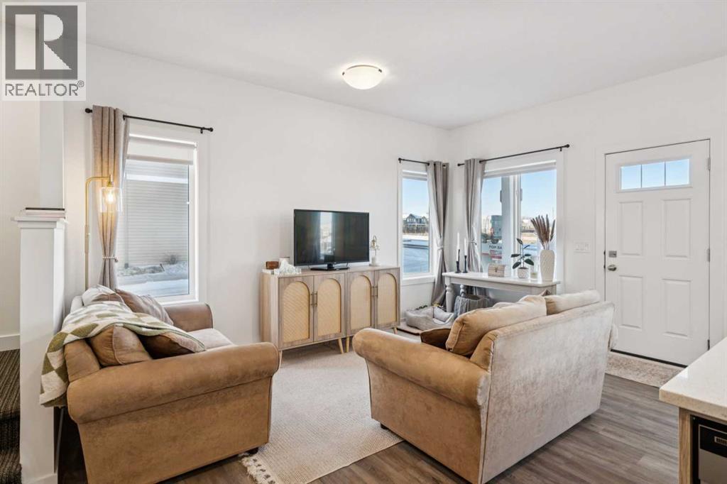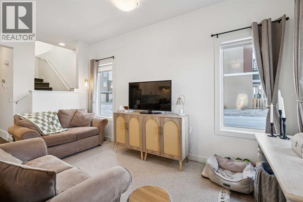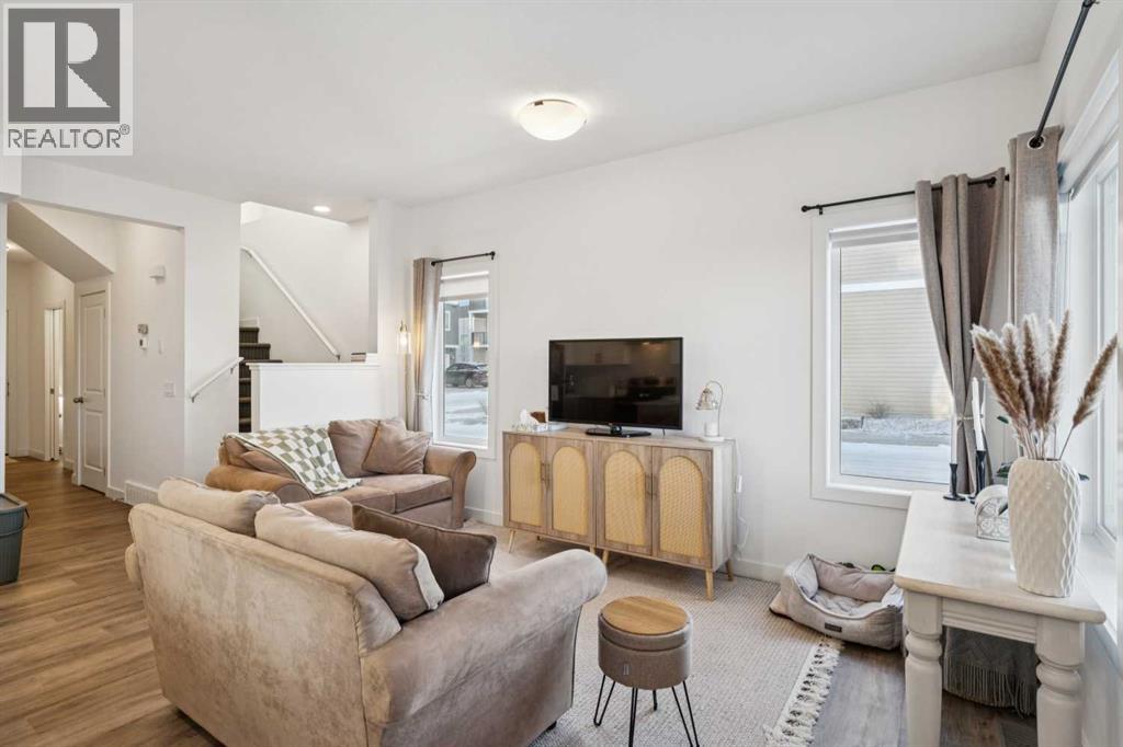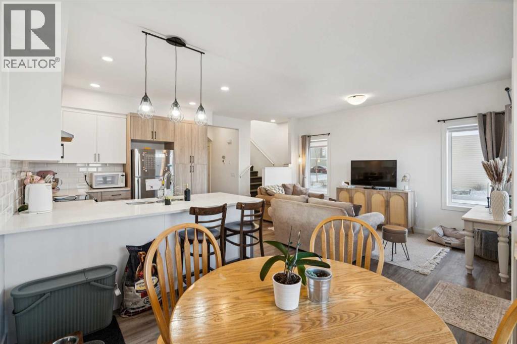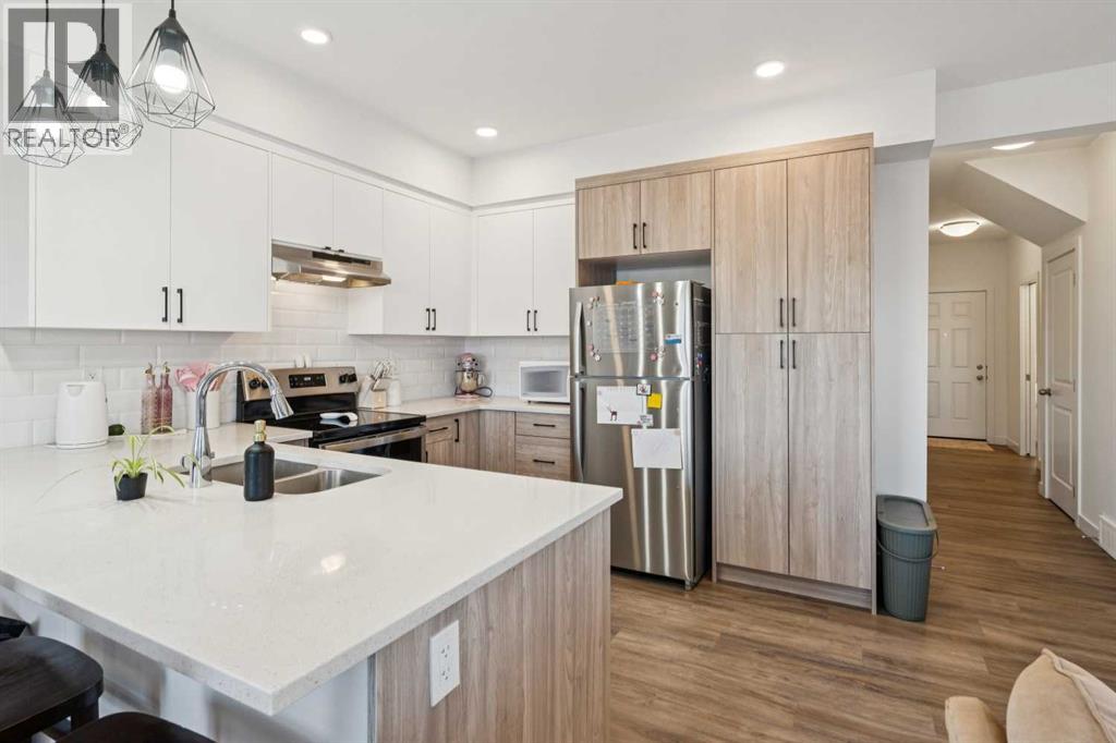Discover the charm of contemporary living in this thoughtfully designed townhome. Filled with natural light from ample windows, the open-concept layout spans three inviting levels and offers beautiful mountain views. The stylish kitchen includes sophisticated cabinetry, quartz counters, a generous island, and stainless steel appliances. Offering 3 bedrooms, 2.5 baths. This home provides flexible living spaces. The primary bedroom boasts ample storage and direct access to the ensuite bath featuring a luxurious deep soaker tub/shower combo. A convenient half bath on the main level enhances functionality. Features include vinyl plank floors, main-level laundry, complete blinds, a single garage, and driveway plus street parking. Enjoy nearby pathways, local shopping, and convenient access to both Calgary and mountain adventures. (id:63190)