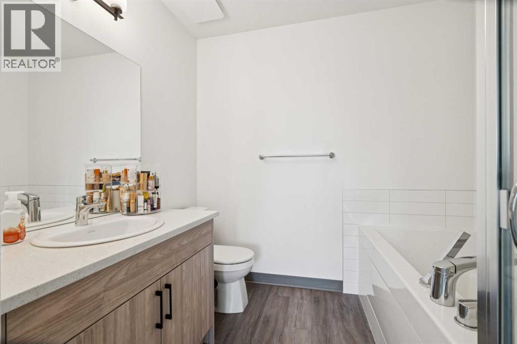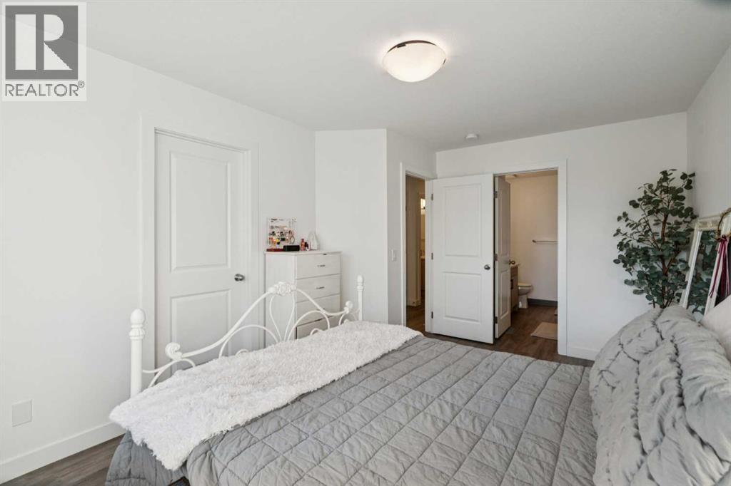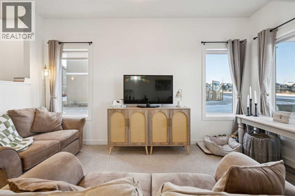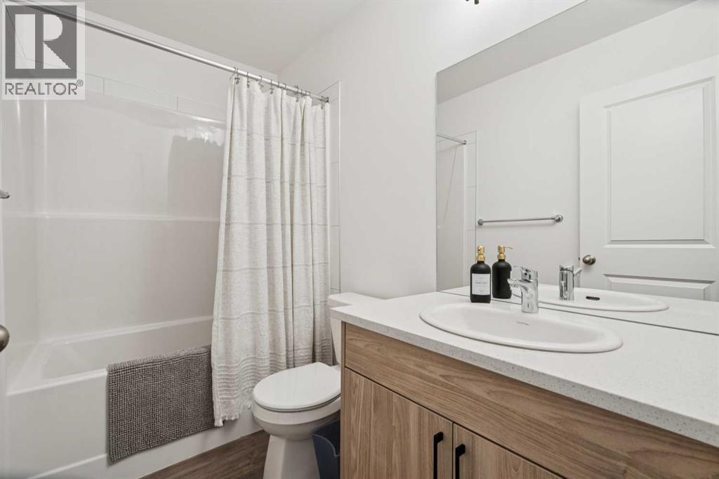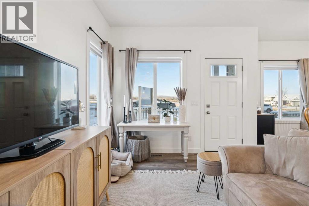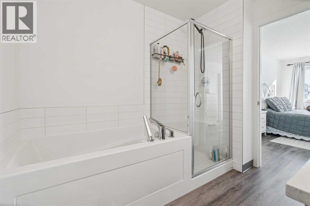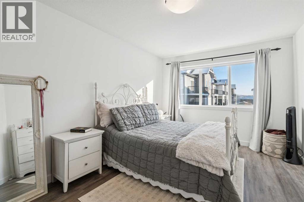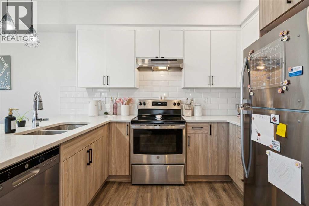 Discover the charm of contemporary living in this thoughtfully designed townhome. Filled with natural light from ample windows, the open-concept layout spans three inviting levels and offers beautiful mountain views. The stylish kitchen includes sophisticated cabinetry, quartz counters, a generous island, and stainless steel appliances. Offering 3 bedrooms, 2.5 baths. This home provides flexible living spaces. The primary bedroom boasts ample storage and direct access to the ensuite bath featuring a luxurious deep soaker tub/shower combo. A convenient half bath on the main level enhances functionality. Features include vinyl plank floors, main-level laundry, complete blinds, a single garage, and driveway plus street parking. Enjoy nearby pathways, local shopping, and convenient access to both Calgary and mountain adventures. (id:63190)