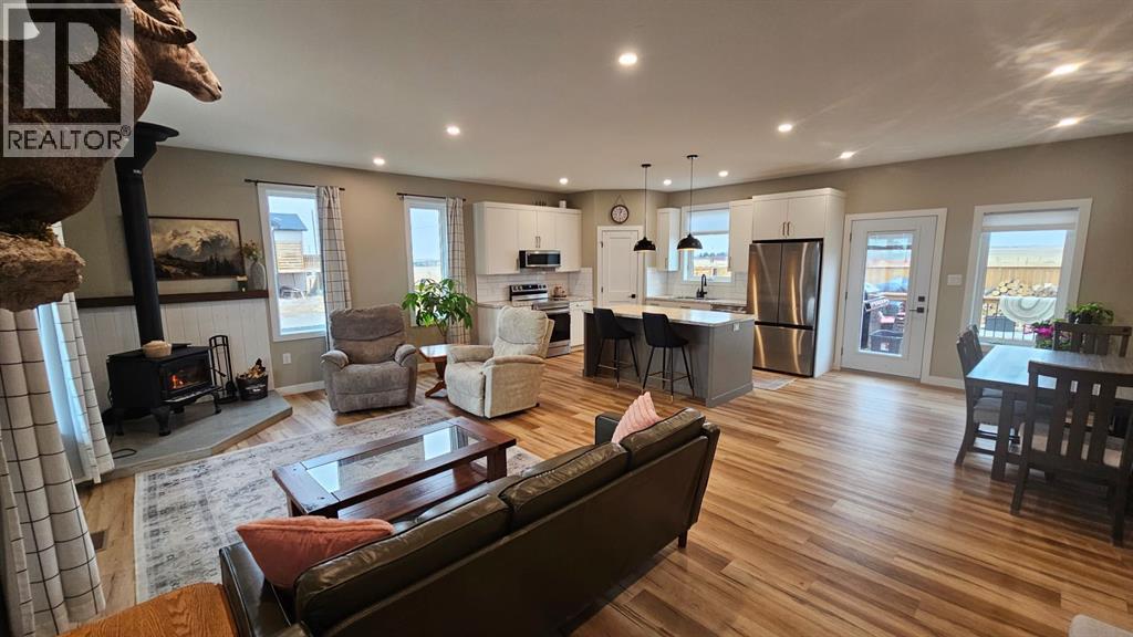 This move-in ready 4 bedroom, 2 bathroom home offers a bright open-concept layout perfect for modern living. The stylish kitchen features white cabinetry, stainless steel appliances, a large island with seating, and pendant lighting, flowing seamlessly into the spacious living area with beautiful flooring and a cozy wood stove. All four bedrooms are well-sized, complemented by two full bathrooms for added convenience. Outside, enjoy attractive curb appeal with a covered front porch, landscaped yard, and a spacious driveway—ideal for comfortable everyday living and easy entertaining. (id:63190)