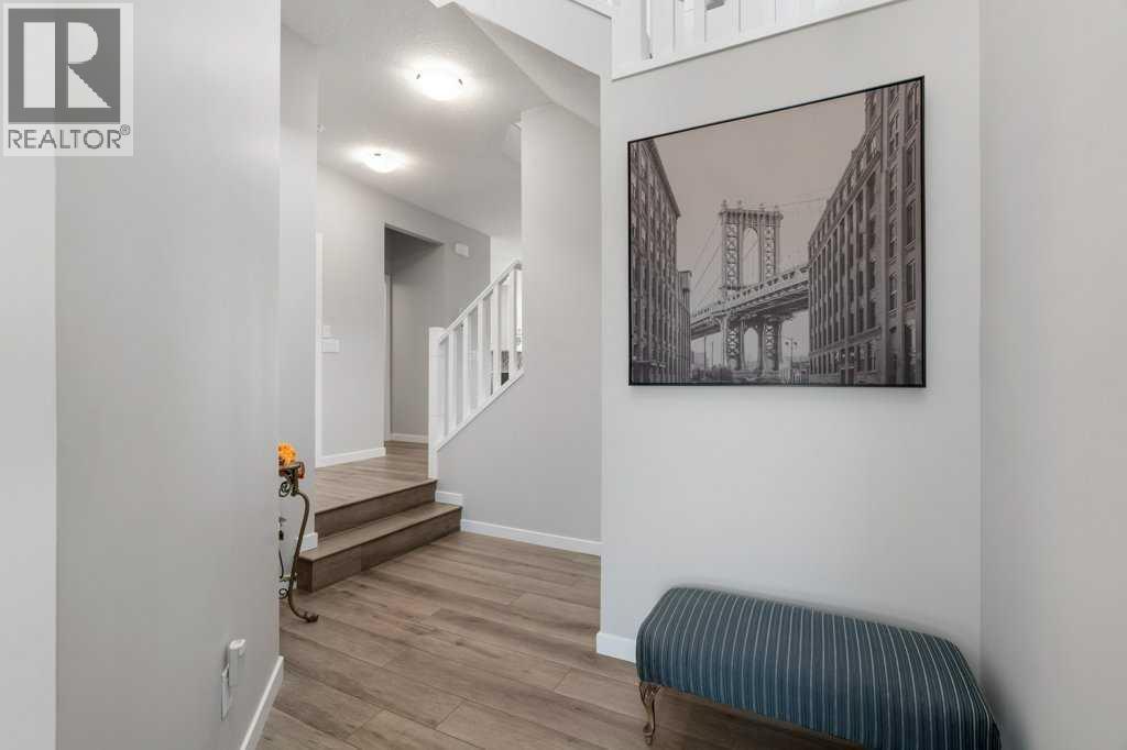 Welcome to this spacious and beautifully appointed 5-bedroom, 3.5-bathroom family home in the desirable NW community of Carrington. With 2,279 sq ft above grade and an additional 918 sq ft in the fully finished basement, this home offers over 3,100 sq ft of thoughtfully designed living space—ideal for large families, multigenerational living, or anyone craving extra room to grow. The main floor welcomes you with a bright, open-concept layout featuring 9’ ceilings and a warm, inviting living room with a gas fireplace. The adjacent dining area opens onto the sunny south-facing backyard via patio doors, extending your living space onto the deck—perfect for outdoor entertaining. The chef-inspired kitchen is a true showstopper, complete with an extra-long granite island, two-tone cabinetry, stainless steel appliances, and a separate spice kitchen with a second gas stove, powerful hood fan, and extra storage—ideal for preparing meals without lingering aromas in your main living space. A private office/den, 2-piece powder room, and a mudroom additional storage complete the main floor. Upstairs, you'll find a thoughtfully designed layout with a central bonus room, perfect for family movie nights or a kids’ play area. The primary suite is a serene retreat with a walk-in closet and a luxurious 5-piece ensuite featuring dual vanities, a deep soaker tub, and a separate shower. Three additional bedrooms share a 4-piece bathroom, and the convenient upper-floor laundry makes daily chores a breeze. The fully finished basement offers incredible flexibility with a large recreation room, 5th bedroom, another 4-piece bathroom, and plenty of storage. The 9’ ceilings and plumbing rough-ins provide the potential for a future basement suite (subject to approval and permitting by the city/municipality) or second kitchen. Enjoy the sunny, south-facing backyard that backs onto green space and a walking path, providing privacy and a peaceful backdrop. The low-maintenance landscaping, iron fro nt and back railings, upgraded spindles, and central A/C add function and style to this impressive home. Ideally located in Carrington, you're just minutes from NW Calgary’s best amenities, including shopping and dining, the Vivo and YMCA recreation centres, schools, playgrounds, theatres, and easy access to major routes like Stoney Trail. This is the total package—space, comfort, and convenience, all in a family-friendly community. (id:63190)