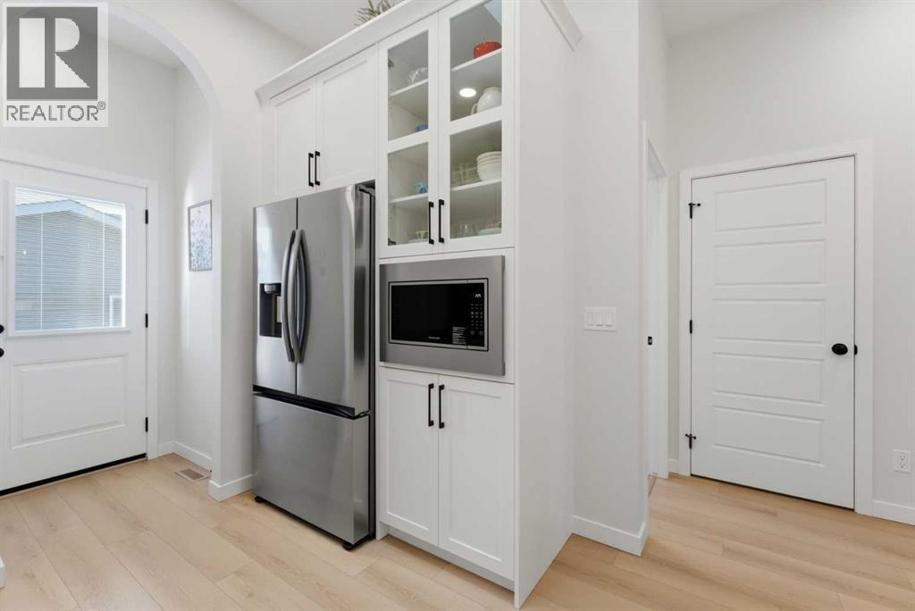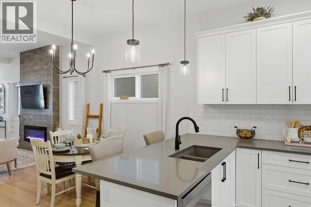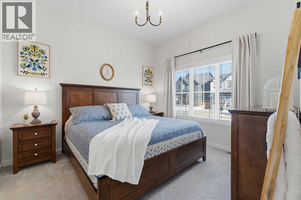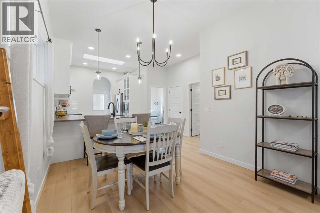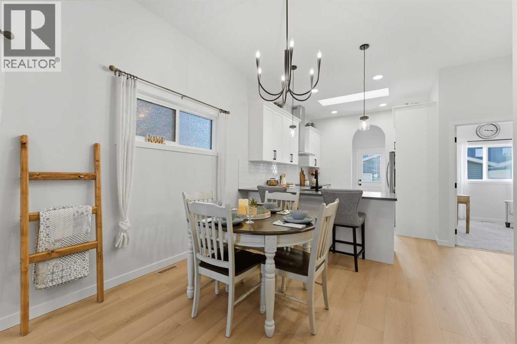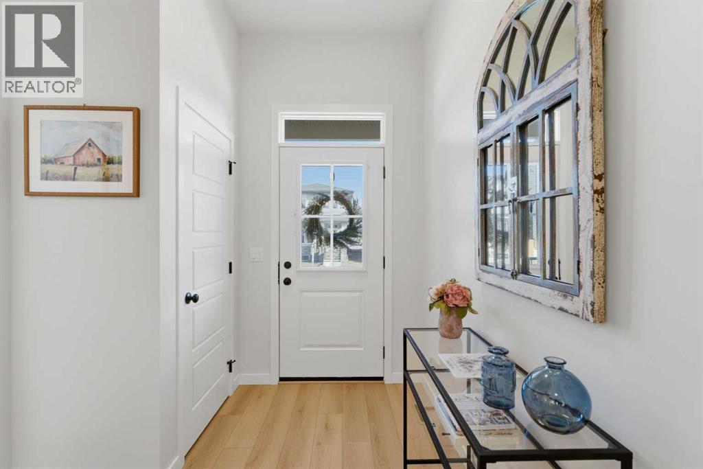 Welcome to an exceptional laned bungalow tucked into the award-winning community of Coopers Crossing in Airdrie where timeless design meets modern comfort in all the right ways.From the moment you arrive, this home makes a statement. Its charming laned configuration allows for a clean, welcoming front façade, while the rear double garage keeps the streetscape elegant and uncluttered. The low-maintenance landscaping frames the property beautifully, offering year-round curb appeal without demanding your weekends. Thoughtfully designed pathways and tidy greenery create a polished first impression that only gets better once you step inside.Open the front door and you’re greeted by soaring 10-foot ceilings on the main floor—an architectural feature that instantly enhances the sense of space and light. The expansive height amplifies every detail, from the modern lighting fixtures to the oversized windows that bathe the home in natural sunshine. The result is an airy, uplifting atmosphere that feels both luxurious and inviting.A Kitchen Designed to Impress. At the heart of the home lies a custom kitchen crafted for both everyday living and memorable entertaining. Beautiful cabinetry, sleek countertops, and thoughtful storage solutions combine style with functionality. A full set of appliances ensures you’re ready to host everything from intimate dinners to holiday gatherings. Whether you’re preparing a quiet morning coffee or a gourmet feast, this kitchen is as inspiring as it is practical.Above, a skylight draws in streams of natural light, adding warmth and brightness throughout the day. It’s the kind of detail that subtly transforms the mood of the entire living space—sunshine by day, soft stargazing ambiance by night.Comfortable & Cozy Living SpacesThe living area is anchored by a striking electric fireplace, offering both visual charm and effortless warmth. It’s the perfect focal point—ideal for cozy winter evenings or simply adding a touch of elegance to the ro om year-round.To ensure comfort in every season, the home is equipped with a central AC unit, keeping the interior refreshingly cool during Alberta’s warm summer months. Combined with the home’s thoughtful design, this creates an environment that feels just right, no matter the weather outside.Thoughtful Bedroom & Bathroom LayoutThis bungalow features 2 spacious bedrooms and 2 full bathrooms, all conveniently located on the main level for easy living.The primary suite is a private retreat—generous in size and designed for relaxation. Large windows provide natural light, while the adjoining full ensuite offers a spa-like experience with quality finishes and ample space to unwind.The second bedroom is perfect for guests, family, or even a stylish home office. A second full bathroom ensures comfort and privacy for everyone.Outdoor Living at Its FinestStep outside to discover a large rear deck—an extension of your living space that’s ideal for summer barbecues, morning coffee rituals, or quiet evenings (id:63190)