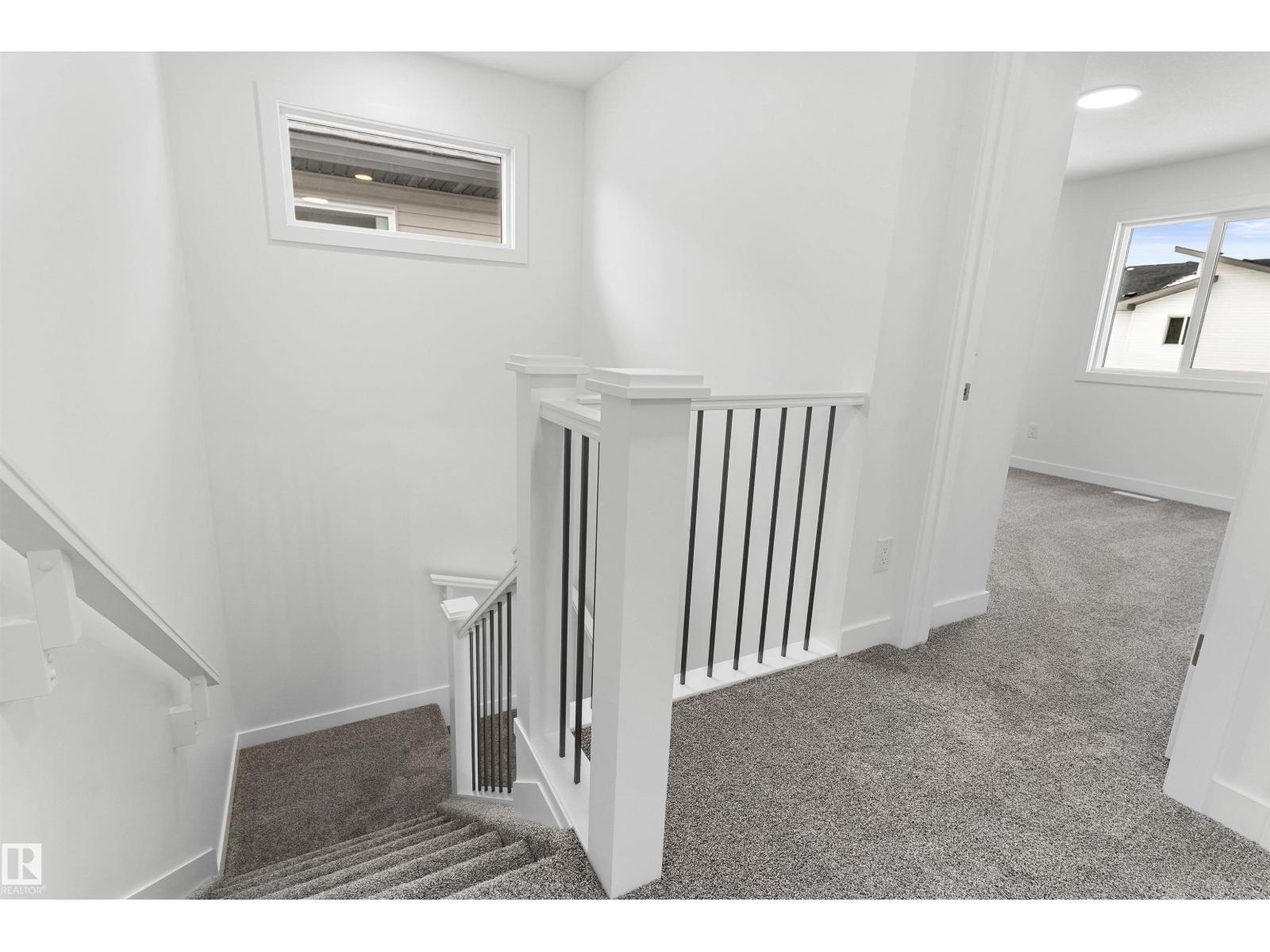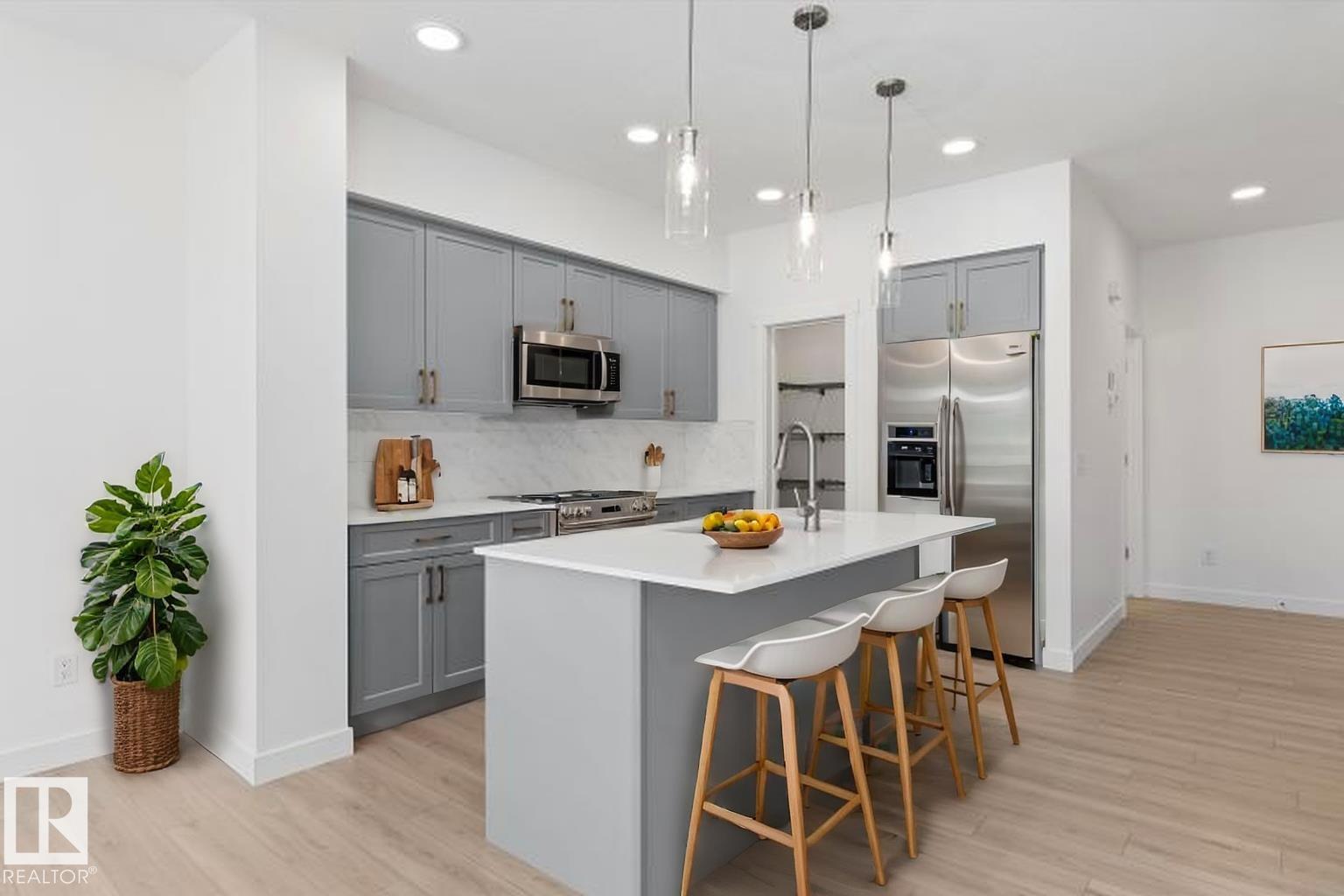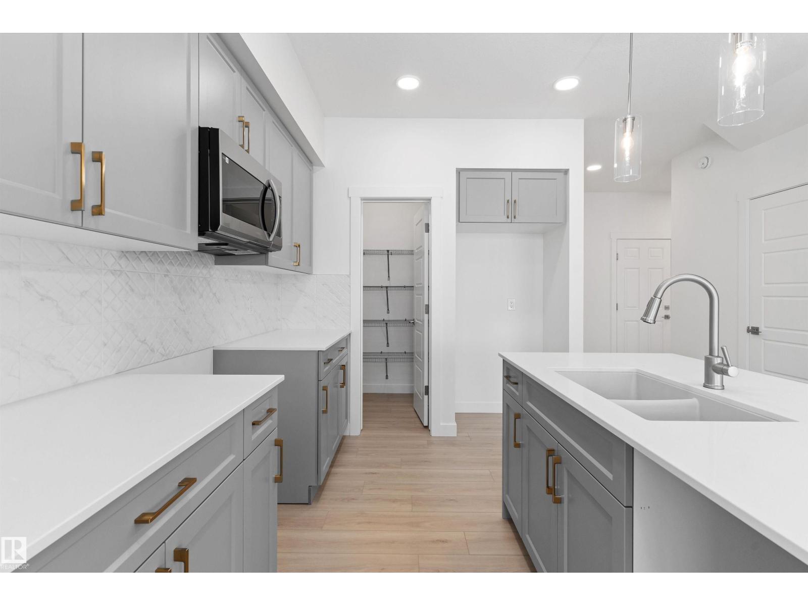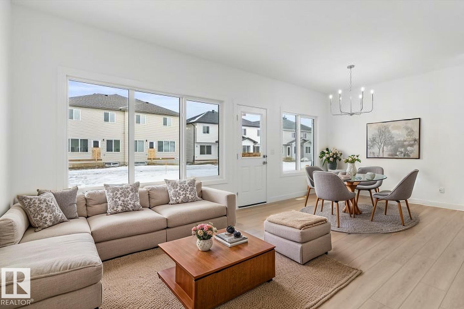 Built by Sterling Homes, this beautifully finished duplex in Aster offers bright, modern living in a Southeast Edmonton community close to schools, parks, and family-friendly amenities. Triple-pane windows and 9’ ceilings fill the main floor with natural light, creating a warm, welcoming feel. The kitchen features quartz countertops, a central island with seating, upgraded cabinetry, a corner pantry, full-height tile backsplash, and an over-the-range microwave—perfect for daily living and entertaining. Open dining and living areas feature large windows and a patio door leading to the future deck and backyard. Upstairs, a versatile bonus room adds extra space, while the primary suite includes a walk-in closet and 3-piece ensuite. Two additional bedrooms, a full bath, upper-floor laundry, luxury vinyl plank flooring, a separate side entrance, double attached garage with floor drain, and basement rough-ins complete this thoughtfully designed home. (id:63190)