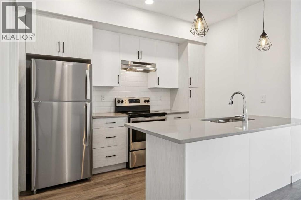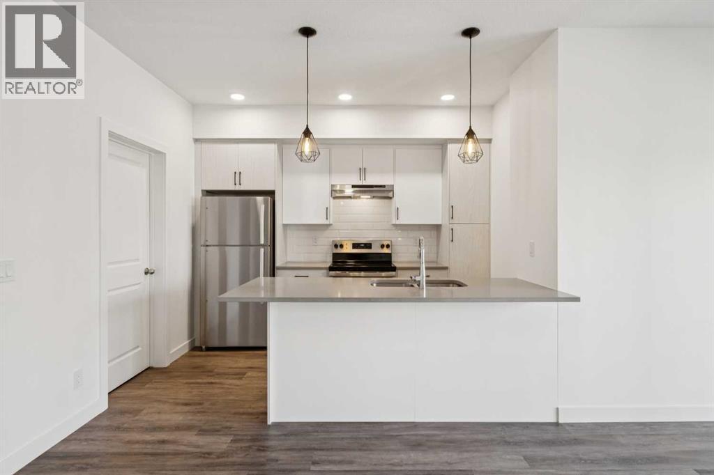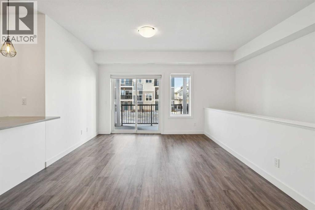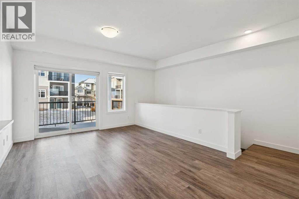 Discover the charm of contemporary living in this thoughtfully designed townhome. Filled with natural light from ample windows, the open-concept layout spans three inviting levels and offers beautiful mountain views. The stylish kitchen includes sophisticated white cabinetry, quartz counters, a generous island, and stainless steel appliances. Offering 1 bedroom, 1 bath, and a cheerful, versatile den, this home provides flexible living spaces. The primary bedroom boasts ample storage and direct access to the main bath featuring a luxurious 4 piece bathroom. Features include vinyl plank floors, upper-level laundry, complete blinds, a single garage, and driveway plus street parking. Enjoy nearby pathways, local shopping, and convenient access to both Calgary and mountain adventures. (id:63190)