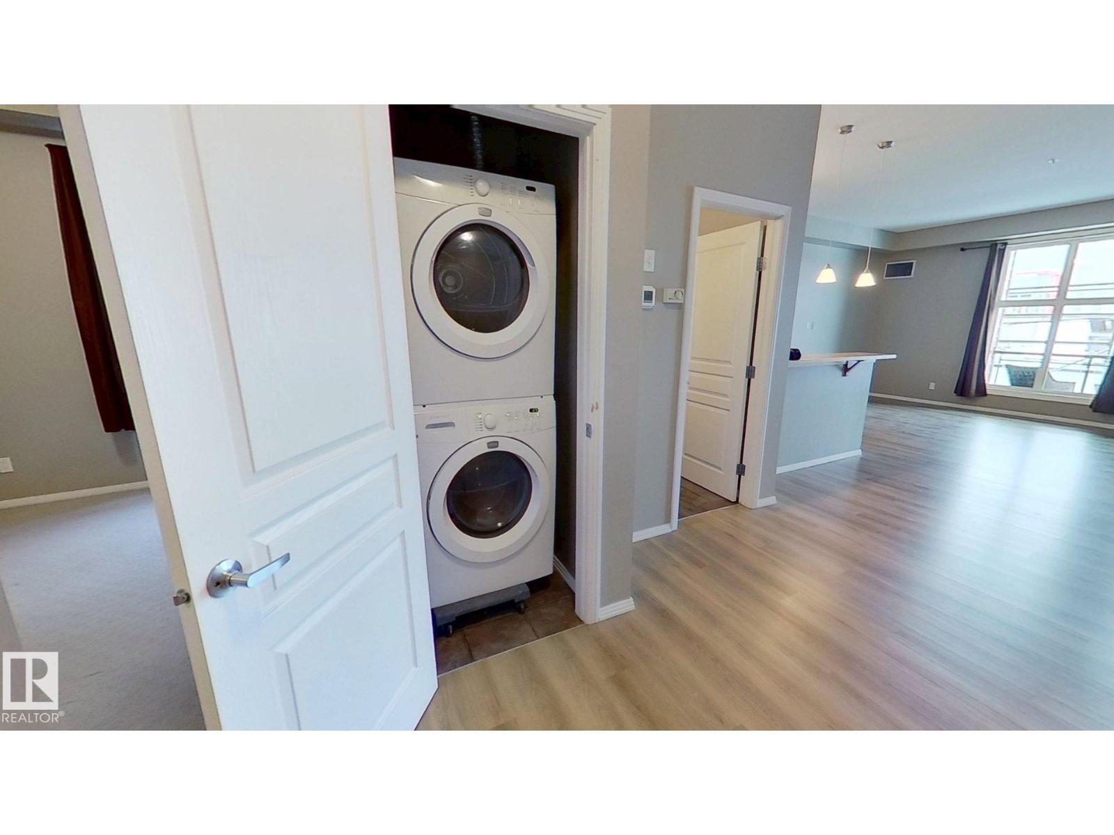 Luxury 1 bedroom, 1 bathroom downtown condo with 1 underground parking stall and small storage cage incl. Condo unit is approximately 850 square feet with an open floor plan and high ceilings, with a large balcony that has a hookup for natural gas BBQ with city view. New plank flooring, Interior walls professionally painted, Insuite washer/dryer, electric range/oven, microwave w/hood fan, refrigerator & dishwasher included. Small pets may be approved by the Condo Board. The 4 story building has 2 elevators and a security system with fobs, intercom and video surveillance cameras. The condo unit is within walking distance to MacEwan University, Roger's Arena and the Brewery District with stores, pubs and restaurants. The condo is approximately 1 block away from the future LRT expansion from downtown to West Edmonton Mall, and access to Edmonton Transit buses within 1 block. Each condo unit is self contained with its own hot water tank and natural gas furnace, so utilities are not included in the condo fees. (id:63190)