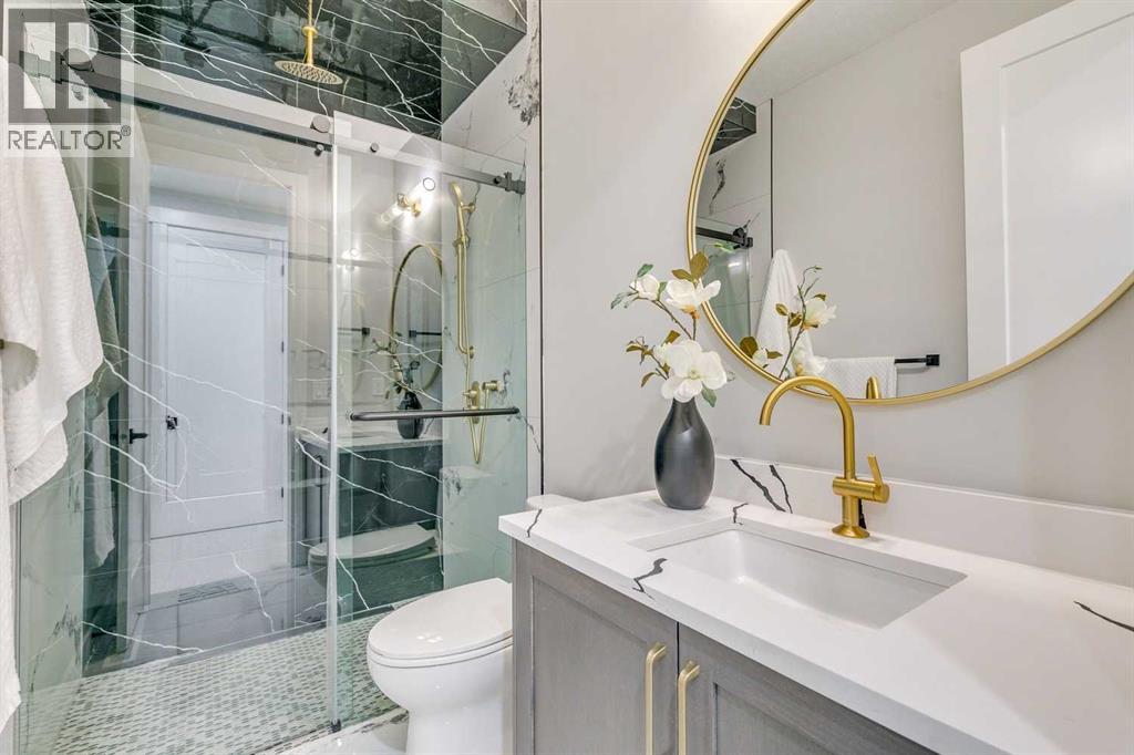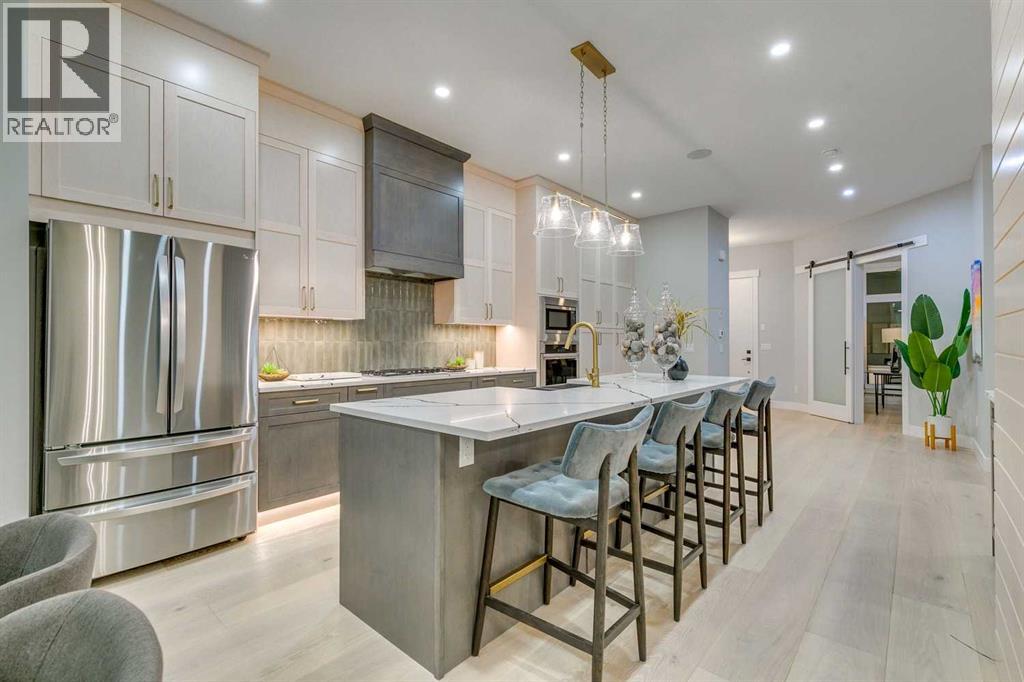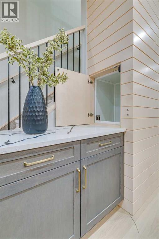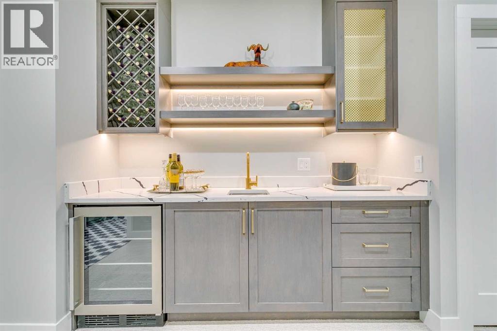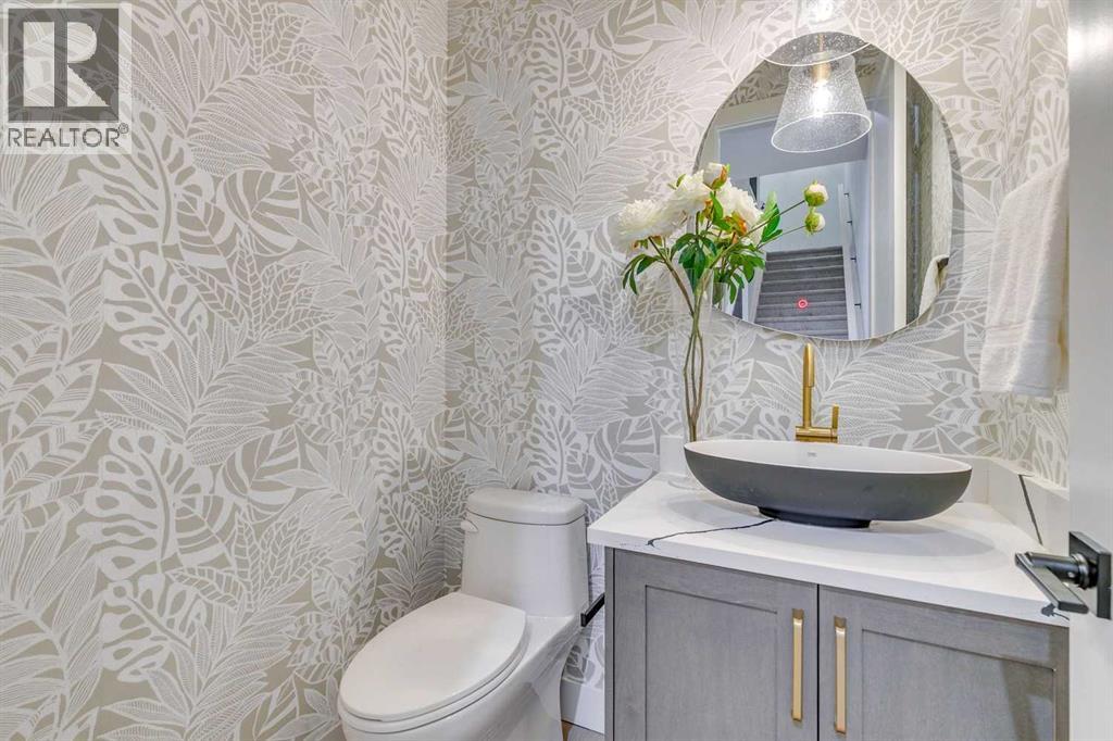 Experience refined inner-city living at 1413 27 Street SW. This meticulously crafted, never-lived-in modern residence offers over 3,000 sq ft of thoughtfully designed living space, blending high-end finishes, rare upgrades, and everyday functionality — all just minutes to Downtown, 17th Avenue, and Shaganappi Golf Course. Immediate possession available. The main floor impresses with soaring 10-foot ceilings, rich hardwood flooring, and expansive floor-to-ceiling windows that flood the space with natural light. A bright front den with oversized picture windows provides the perfect home office, study, or reading retreat. At the heart of the home, the gourmet kitchen is both striking and functional, featuring: Quartz countertops Shaker-style cabinetry with under-cabinet lighting Fireclay farmhouse sink Built-in spice racks Oversized island with concealed electrical outlets Premium built-in gas range and appliance package A rare and highly practical dumbwaiter elevator connects the garage and lower level directly to the kitchen — an exceptional feature seldom found in Calgary infills. The powder room is a true design statement, showcasing custom wallpaper accents, a gold-leaf ceiling, floating vanity, and backlit mirror — an unforgettable touch of luxury. Upstairs, the primary retreat offers a spa-inspired escape with floating dual vanities, ambient shelf lighting, oval mirrors, designer fixtures, a custom-tiled oversized shower, and a freestanding soaker tub. Two additional bedrooms, a versatile bonus lounge, and a full laundry room complete the upper level. The professionally finished basement is designed for entertaining, featuring a striking custom bar with black-and-gold detailing, a wine display wall, spacious recreation room, full bathroom, and additional storage. Outside, enjoy a private, low-maintenance yard and large patio — perfect for relaxing evenings or hosting guests. This is modern luxury without compromise — crafted for thos e who appreciate elevated design, thoughtful details, and unbeatable inner-city convenience. (id:63190)