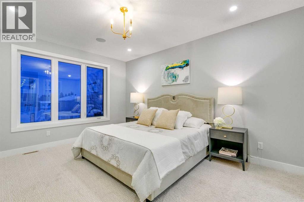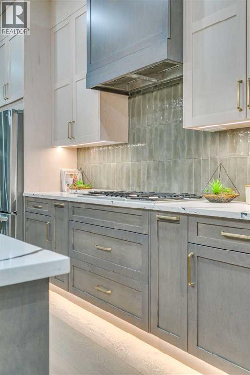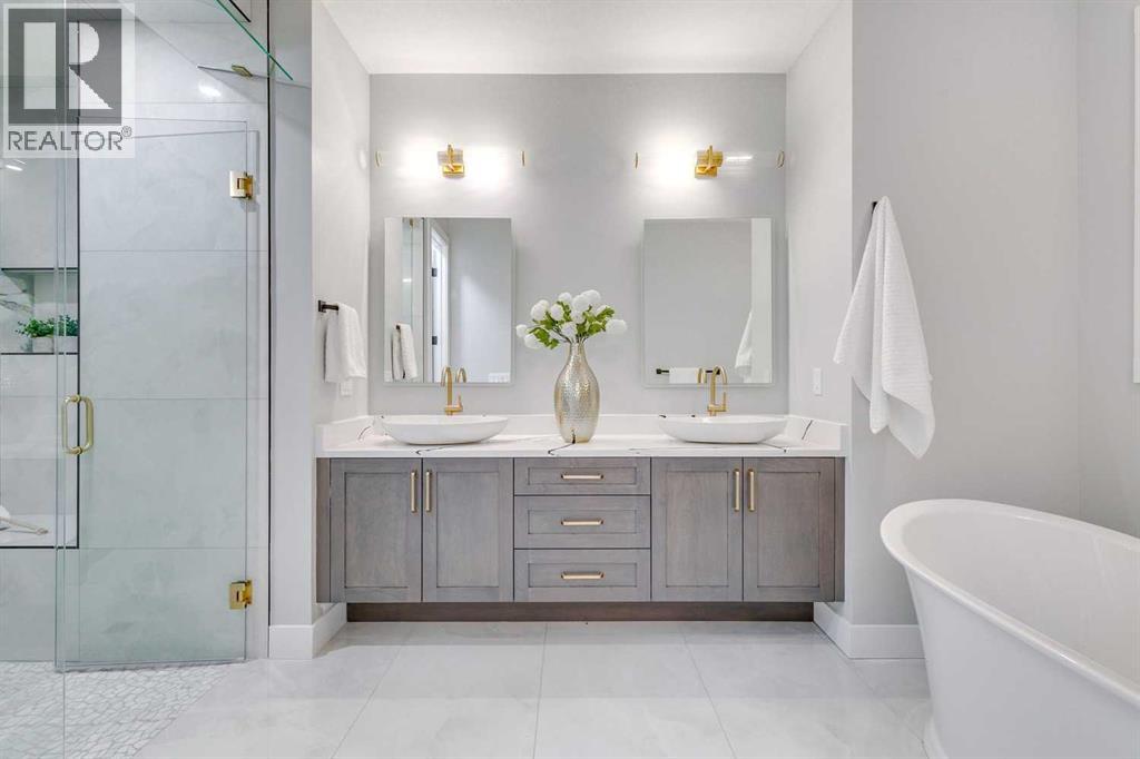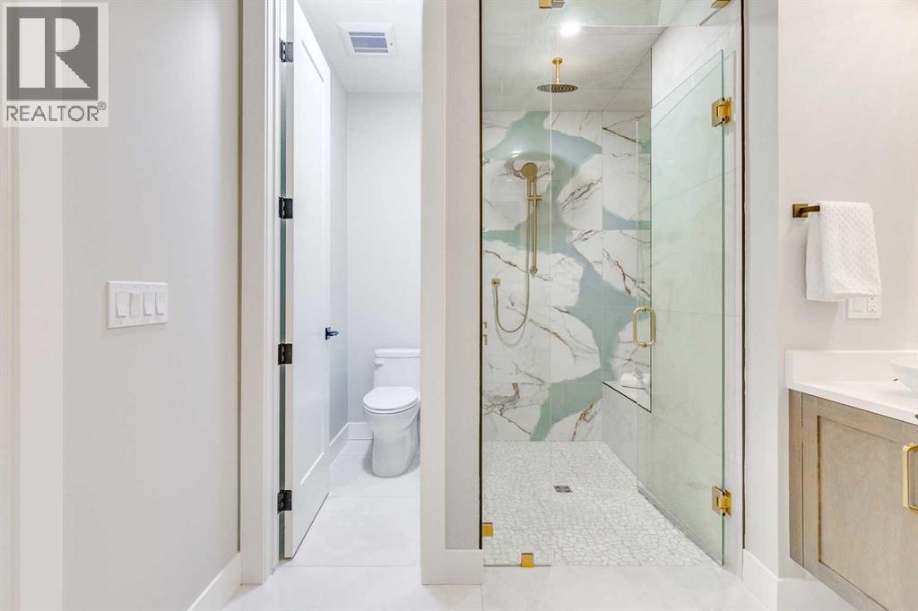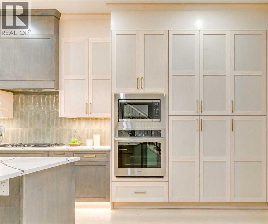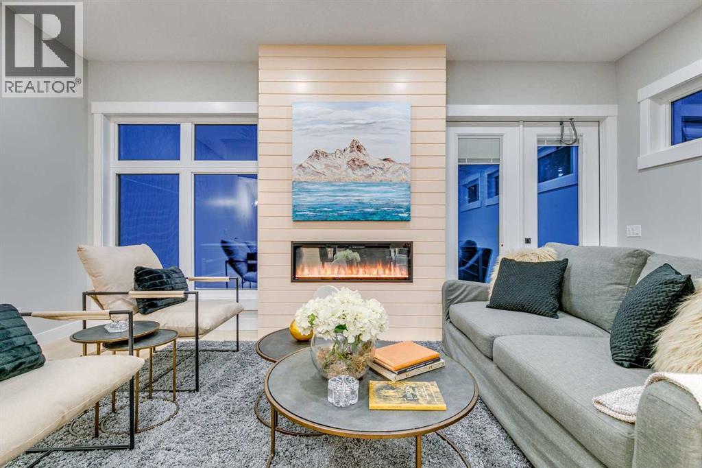 Experience refined inner-city living at 1413 27 Street SW. This meticulously crafted, never-lived-in modern residence offers over 3,000 sq ft of thoughtfully designed living space, blending high-end finishes, rare upgrades, and everyday functionality — all just minutes to Downtown, 17th Avenue, and Shaganappi Golf Course. Immediate possession available. The main floor impresses with soaring 10-foot ceilings, rich hardwood flooring, and expansive floor-to-ceiling windows that flood the space with natural light. A bright front den with oversized picture windows provides the perfect home office, study, or reading retreat. At the heart of the home, the gourmet kitchen is both striking and functional, featuring: Quartz countertops Shaker-style cabinetry with under-cabinet lighting Fireclay farmhouse sink Built-in spice racks Oversized island with concealed electrical outlets Premium built-in gas range and appliance package A rare and highly practical dumbwaiter elevator connects the garage and lower level directly to the kitchen — an exceptional feature seldom found in Calgary infills. The powder room is a true design statement, showcasing custom wallpaper accents, a gold-leaf ceiling, floating vanity, and backlit mirror — an unforgettable touch of luxury. Upstairs, the primary retreat offers a spa-inspired escape with floating dual vanities, ambient shelf lighting, oval mirrors, designer fixtures, a custom-tiled oversized shower, and a freestanding soaker tub. Two additional bedrooms, a versatile bonus lounge, and a full laundry room complete the upper level. The professionally finished basement is designed for entertaining, featuring a striking custom bar with black-and-gold detailing, a wine display wall, spacious recreation room, full bathroom, and additional storage. Outside, enjoy a private, low-maintenance yard and large patio — perfect for relaxing evenings or hosting guests. This is modern luxury without compromise — crafted for thos e who appreciate elevated design, thoughtful details, and unbeatable inner-city convenience. (id:63190)