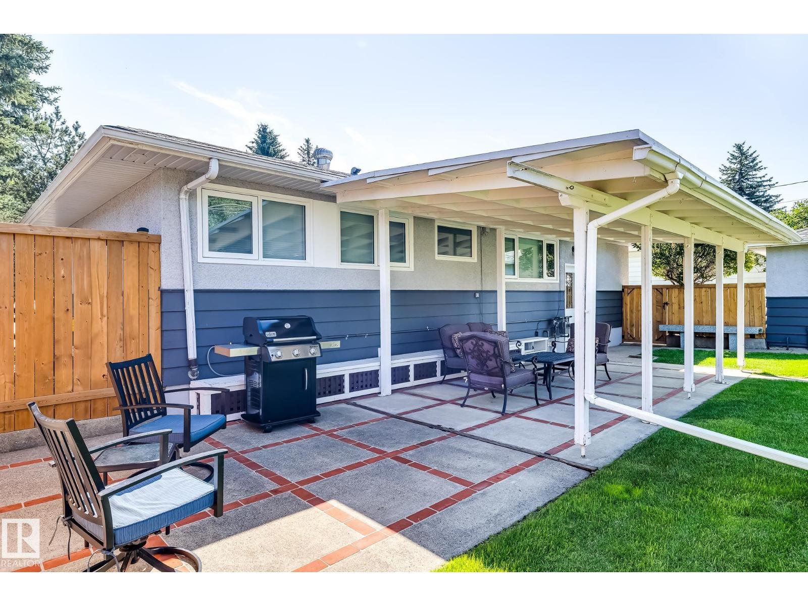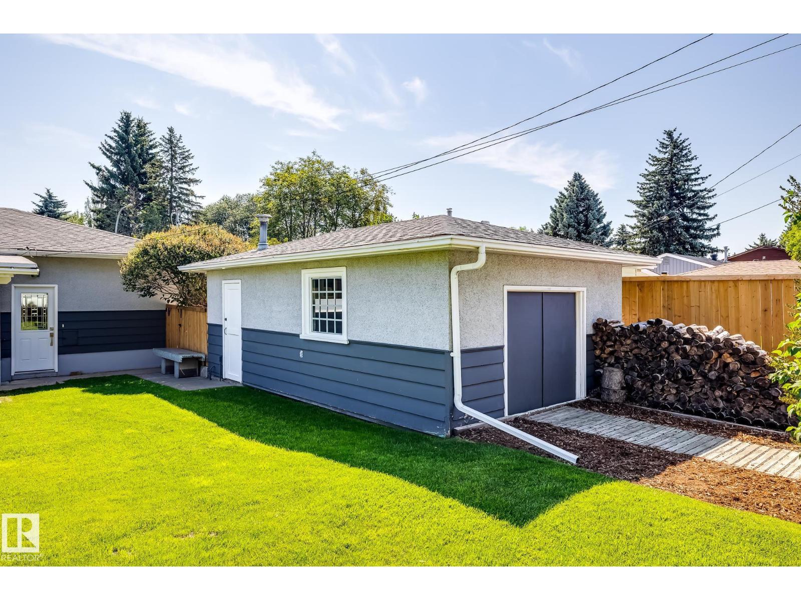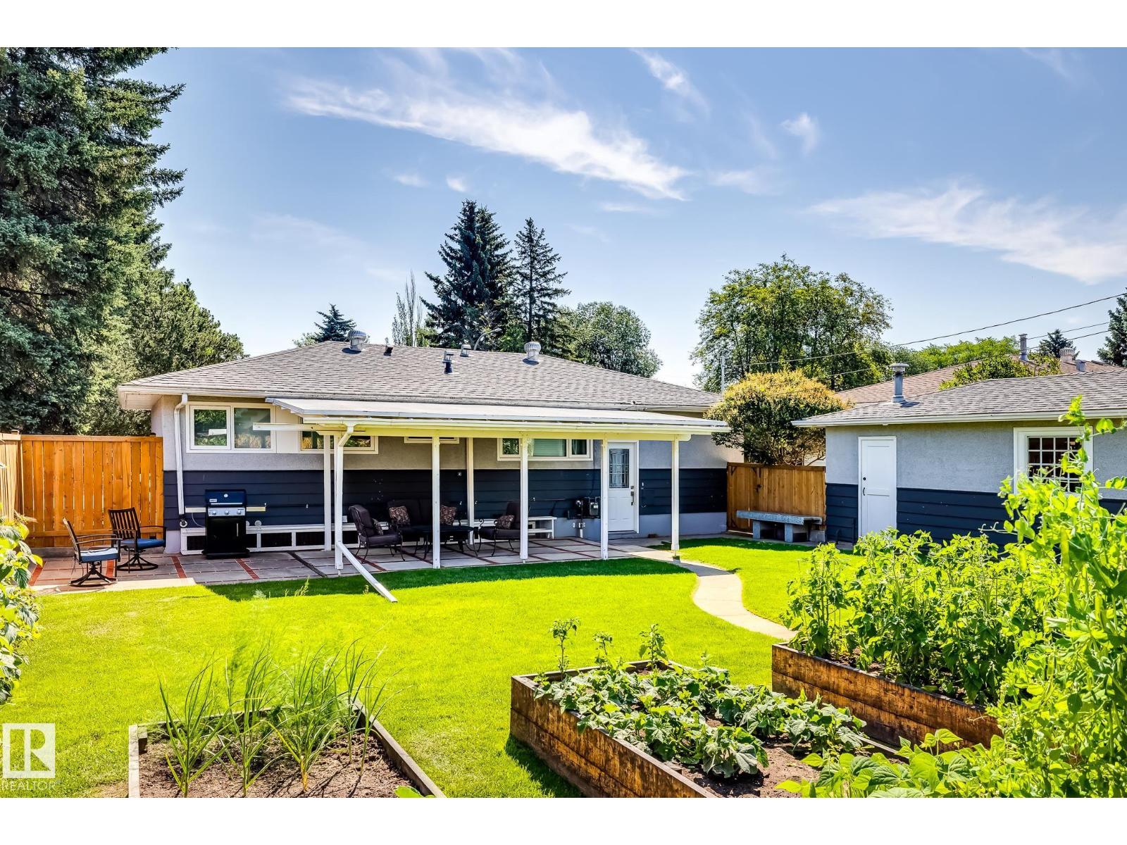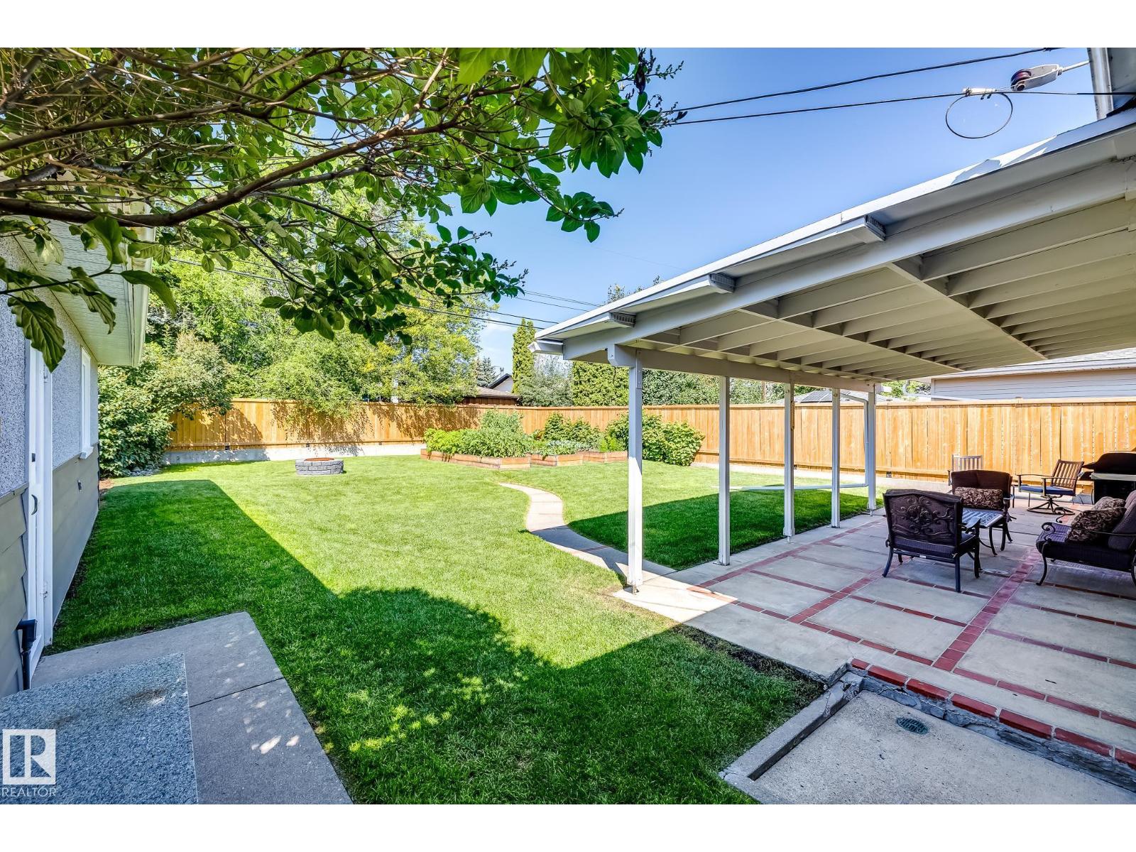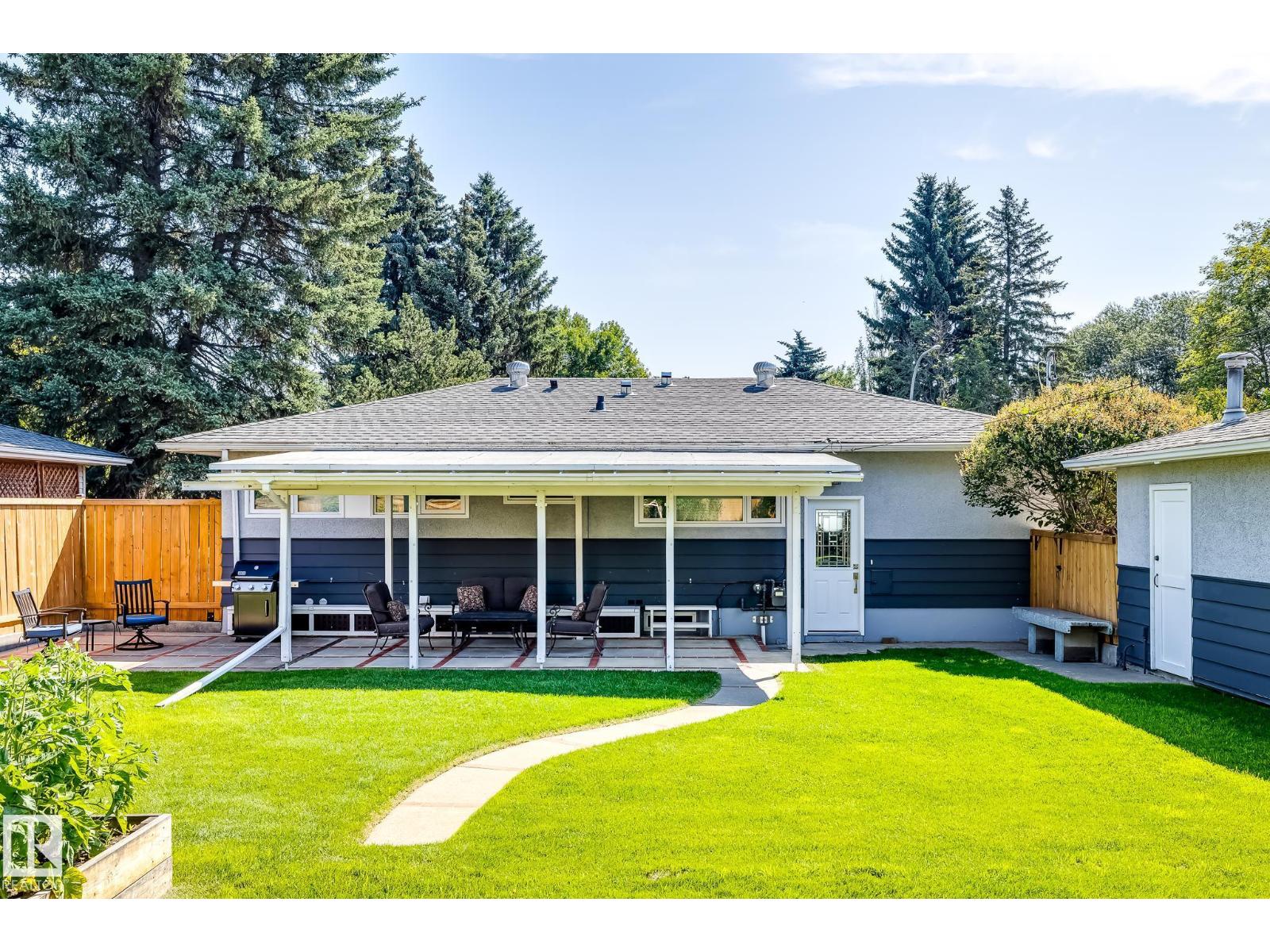 Welcome to Rio Terrace, one of Edmonton’s most sought-after west end communities, known for mature trees, oversized lots, top-rated schools, with quick access to Downtown & the UofA and direct access to the River Valley trail system. This stunning bungalow was renovated down to the studs with major upgrades including new plumbing, 150-amp electrical service, central A/C, triple pane windows and 50-year shingles. The bright open-concept main floor features engineered white oak hardwood, a designer kitchen with 8’ island, and fully updated bathrooms with heated floors. Outside, enjoy a heated garage, new fence and beautiful brick inlay patio overlooking a massive, private, park-like yard. Turnkey living on a quiet, family-friendly street in a premier Rio Terrace setting. (id:63190)