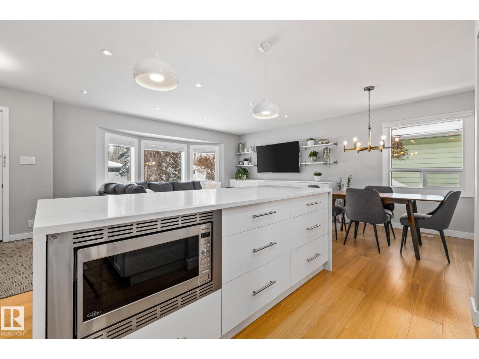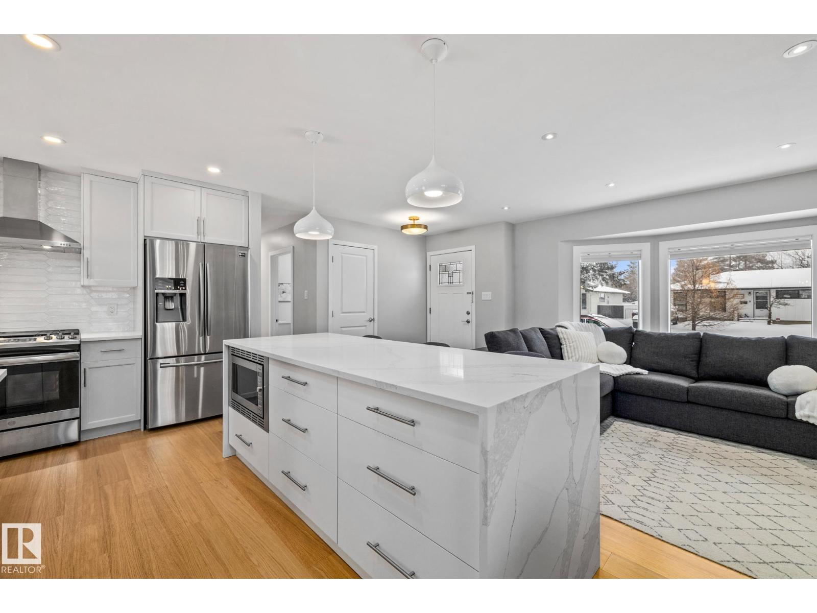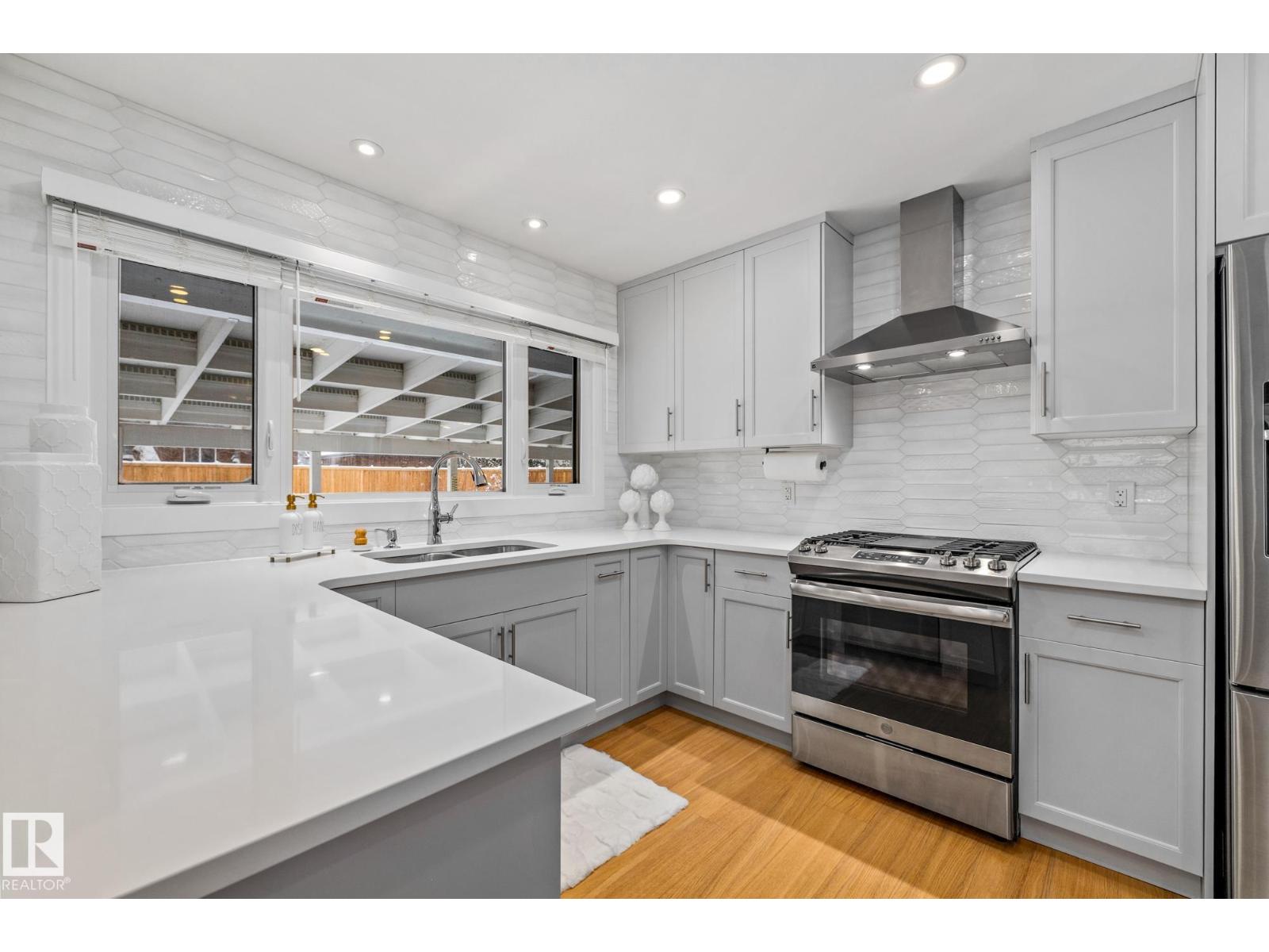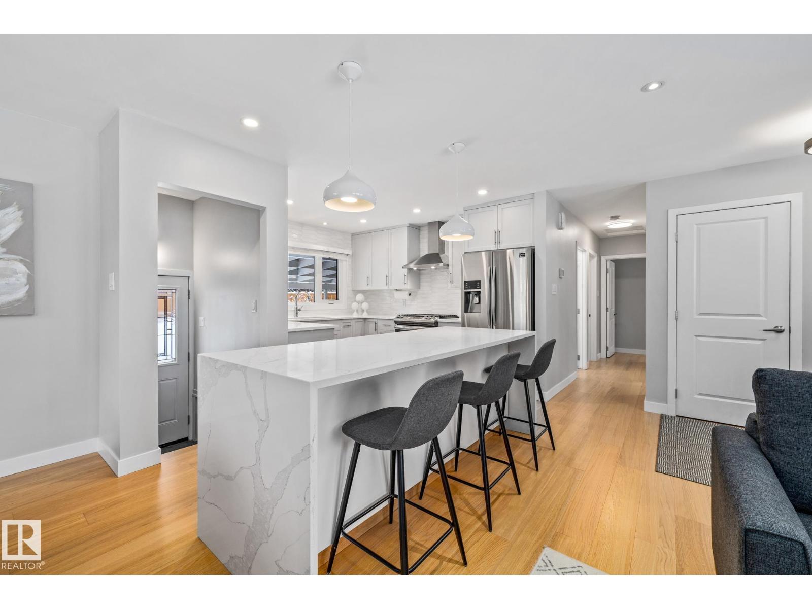 Welcome to Rio Terrace, one of Edmonton’s most sought-after west end communities, known for mature trees, oversized lots, top-rated schools, with quick access to Downtown & the UofA and direct access to the River Valley trail system. This stunning bungalow was renovated down to the studs with major upgrades including new plumbing, 150-amp electrical service, central A/C, triple pane windows and 50-year shingles. The bright open-concept main floor features engineered white oak hardwood, a designer kitchen with 8’ island, and fully updated bathrooms with heated floors. Outside, enjoy a heated garage, new fence and beautiful brick inlay patio overlooking a massive, private, park-like yard. Turnkey living on a quiet, family-friendly street in a premier Rio Terrace setting. (id:63190)