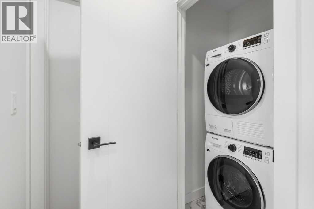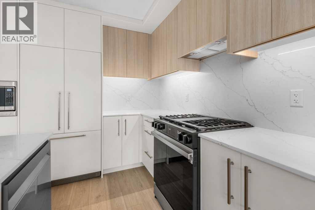 Experience sophisticated urban living at West Plaza. Brand new and never occupied, this beautifully appointed 2 bedroom, 2 bathroom condo showcases interiors curated by Truman’s award-winning design team.What truly sets this home apart is the huge balcony that lives like a private patio—an incredible outdoor extension of your living space, perfect for entertaining, summer BBQs, or creating your own outdoor lounge.Inside, comfort meets style with air conditioning, a smart Wi-Fi thermostat, and roller-shade window coverings throughout. The open-concept layout features 9-foot ceilings, abundant natural light, and custom contemporary LED fixtures that keep the space bright and inviting. You’ll also appreciate the dedicated office/flex area, ideal for working from home, a reading nook, or extra storage and organization.The kitchen is a showpiece, offering floor-to-ceiling ergonomic cabinetry, polished quartz countertops, deep drawers, a full-height contemporary backsplash, and a gas range—built for both daily living and hosting.The primary suite is a true retreat with a spa-inspired ensuite featuring quartz countertops, a sleek glass-enclosed shower, and environmentally conscious fixtures for a clean, elevated finish.The main 4-piece bathroom is finished with polished quartz countertops, a modern square-edge tub, and sleek contemporary fixtures for a clean, spa-inspired feel.Additional highlights include in-suite laundry, titled underground parking, and a dedicated storage locker. Residents also enjoy premium amenities including a fully equipped fitness centre, an inviting owners’ lounge, and a 5-star hotel-style lobby with designer-inspired common spaces.All of this, just steps to boutique shopping, some of Calgary’s best dining and cafés, and the greenery of Radio Park. ** Some images have been virtually/digitally staged to illustrate possible furnishings and layout. (id:63190)