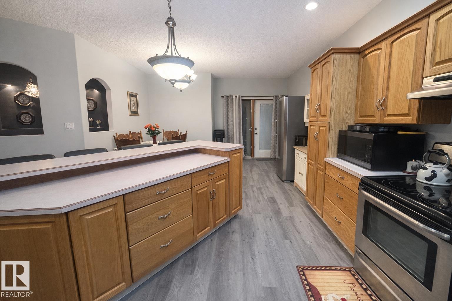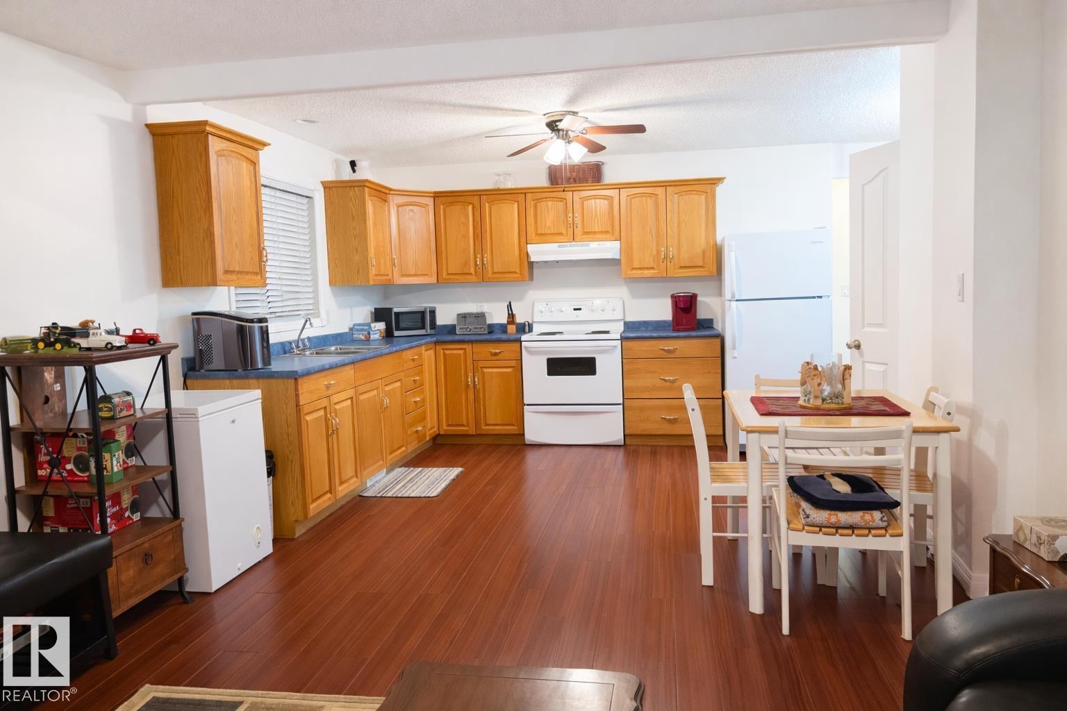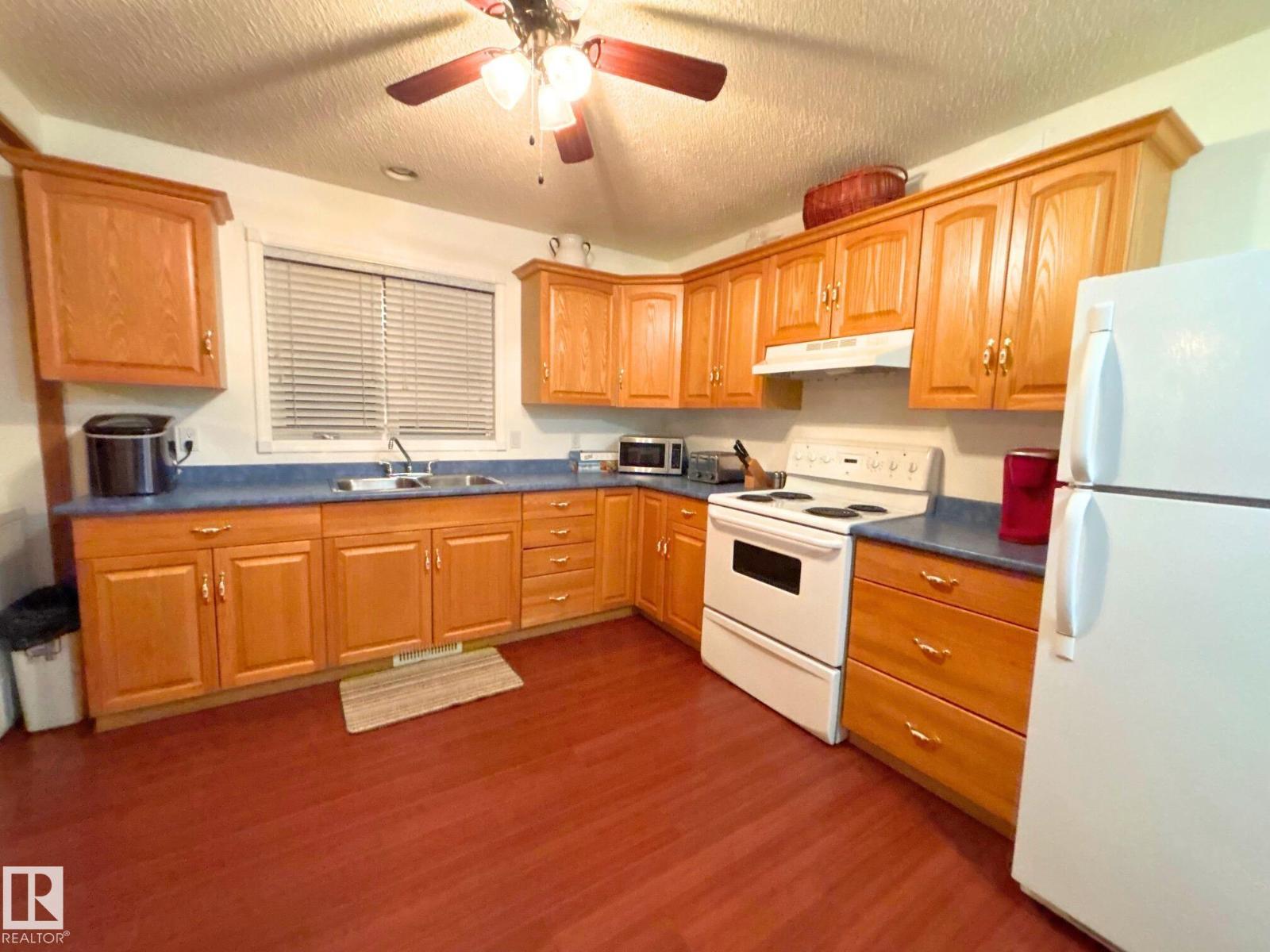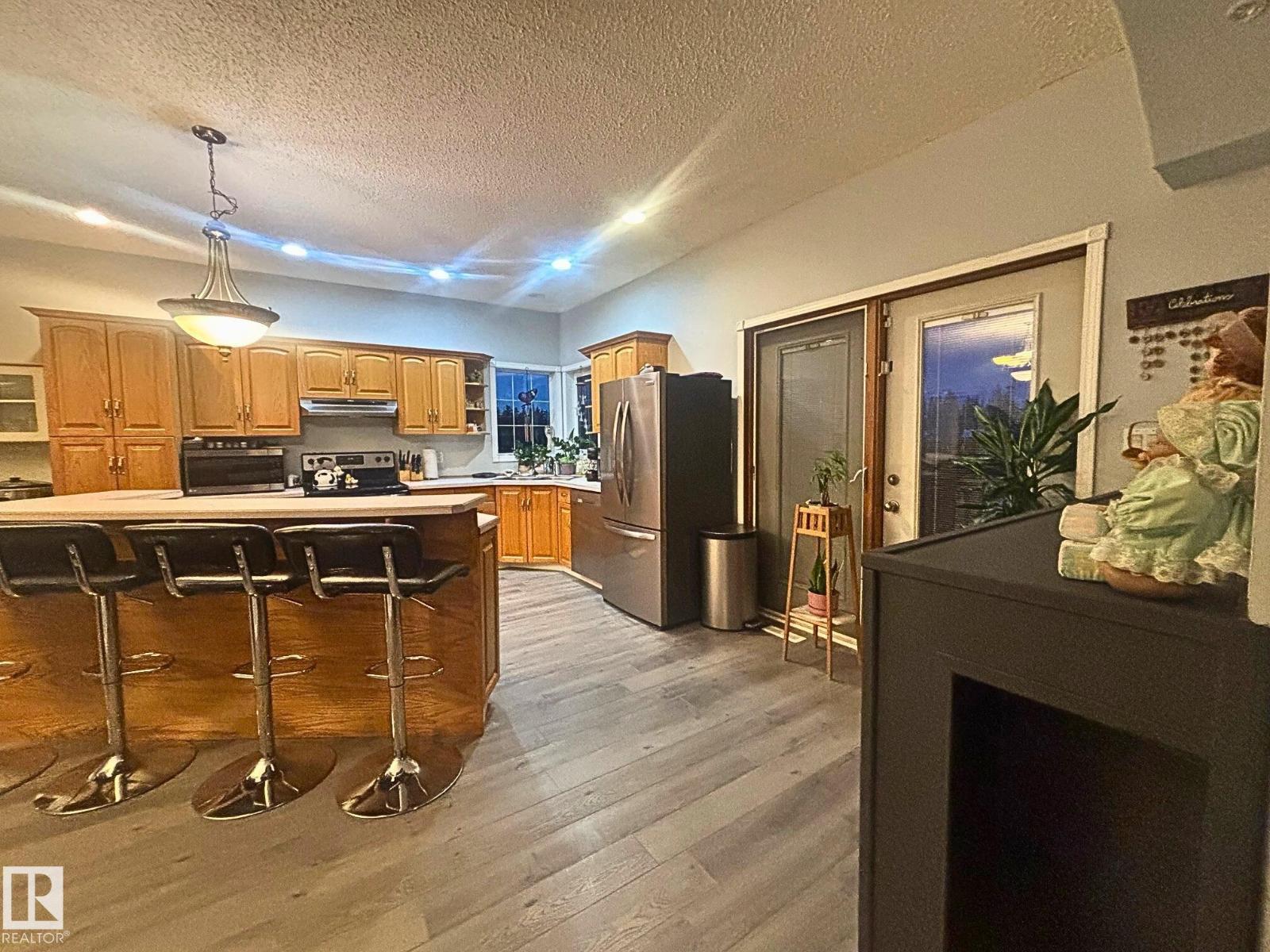 Tucked at the end of a quiet cul-de-sac in Mundare, this 2,600+ sq ft multi-generational gem offers space, warmth, and exceptional versatility. The upper level features 2 bedrooms, a den (could easily be used as a nursery or 3rd bedroom if a closet was added), full bath, and spa-inspired ensuite, plus a bright family room highlighted by a stunning wood-burning fireplace with rock surround. The kitchen opens to two private balcony decks, perfect for relaxing or entertaining. The main floor hosts a fully self-contained in-law suite with 2 bedrooms, full bath, living area, and separate kitchen. Downstairs adds 2 more large bedrooms and a bathroom rough-in. Enjoy the oversized garage, huge yard with alley access, and immaculate condition throughout. Ideally located just 45 minutes to Edmonton, 20 minutes to Vegreville, and 35 minutes to the Scotford Upgrader—this is a rare find for growing or extended families. (id:63190)