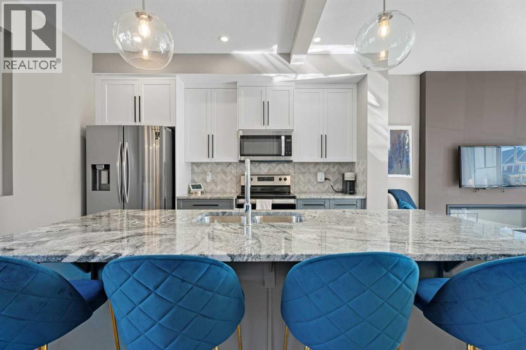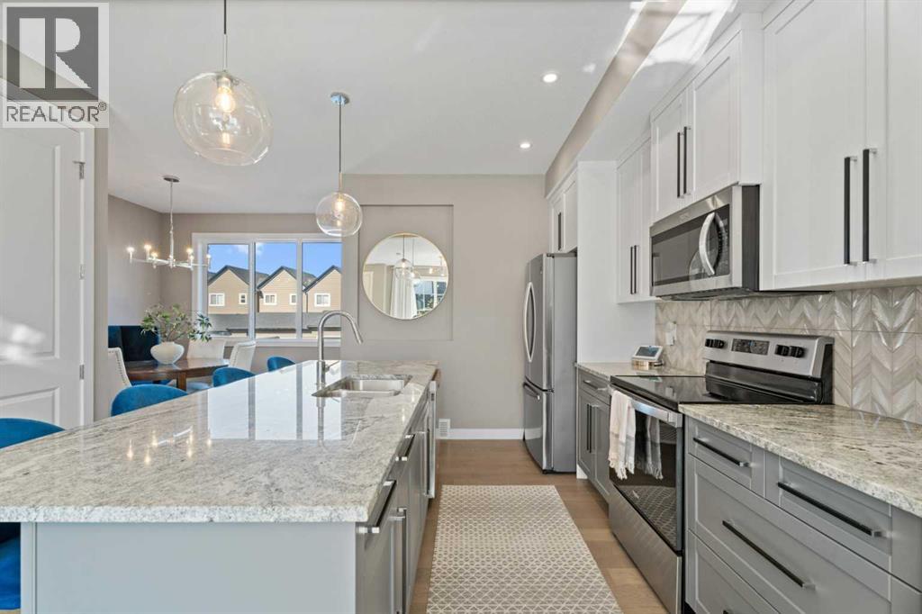 Welcome to this immaculate upgraded home in Lanark, one of Airdrie’s most family-friendly communities! This elegant, timeless home is perfectly situated directly across from a beautiful park, allowing you to watch your kids play right from your front porch. Just one block away, enjoy all the amenities of Lanark’s main community hub, including a pump track, soccer fields, outdoor hockey rink, and a community garden, an ideal setting for an active family lifestyle. Surrounded by kilometers of connected walking and bike paths through Lanark, Kings Heights, and Ravenswood, this home offers a gateway to outdoor adventure. Families will also appreciate the proximity to multiple schools, including French immersion and Catholic options, as well as being just minutes to Kingsview Market and Genesis Place for all your shopping and recreation needs. Inside, you're welcomed by grand 8-foot doors and an open-concept main floor that blends comfort and class. The upgraded flooring, kitchen cabinetry, and counters elevate the space, while the cozy, south-facing living room and fireplace fill the home with warmth and natural light. Upstairs, the spacious primary suite features a walk-in closet and upgraded 3-piece ensuite. Two additional bedrooms and a second full bathroom — also thoughtfully upgraded — complete the upper level. Step outside into your private landscaped backyard oasis, complete with paving stones and raised retaining walls, offering a flat and functional yard perfect for relaxing or entertaining. The key upgrades include and in-ground sprinkler system, complete landscaping, upgraded flooring and granite counters, water fixtures, window coverings, and more. This wonderful home's location adds lifestyle, and the perfect place to plant roots in one of Airdrie’s most sought-after family neighborhoods. (id:63190)