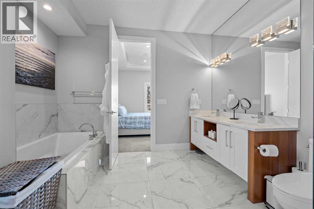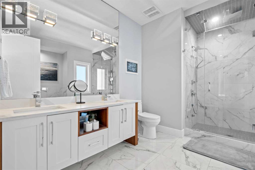 Welcome to 420 14 Avenue NE, an impeccably designed detached infill located on a quiet, tree-lined street in the heart of Renfrew, one of Calgary’s most sought-after inner-city communities. Boasting 3,100 sqft of luxuriously finished living space, this beautifully appointed 4 bedroom, 3.5 bathroom home combines elegant finishes with functional family-friendly design. The main floor features soaring 10’ ceilings, engineered hardwood flooring, custom lighting, and an open-concept layout ideal for entertaining. The chef-inspired kitchen is the centerpiece, complete with quartz countertops, a large island with eating bar, stainless steel appliances, walk-in pantry, and built-in buffet. A spacious living room showcases a floor-to-ceiling tile fireplace flanked by custom built-ins, and a formal dining area and tech center make daily life seamless. As you head upstairs you’ll immediately notice the high vaulted ceilings, 8ft doors, and abundance of natural light. The primary bedroom feels less like a bedroom and more like a retreat. It is a true sanctuary, easily accommodating a king-sized bed and nightstands, plus a separate sitting area, recessed lighted ceiling, large walk-in closet with built-ins, and a spa-style 5-piece ensuite with dual sinks, jetted tub, and oversized 10mm glass shower (roughed-in for steam). Two additional bedrooms, an upper laundry room, plus an additional full bath round out the upper level with thoughtful efficiency. The fully developed basement offers 9’ ceilings, a sprawling media/rec room with custom home theatre set up, wet bar, fourth bedroom, and a stylish 3-piece bathroom. The separate side entrance and wet bar layout create a fantastic opportunity for a future legal suite (subject to City approvals). Additional features include central air conditioning, glass-paneled staircase with wood accents, designer fixtures, built-in storage, and a double detached garage. Outside, the private backyard with deck offers a perfect spot to unwind. Situ ated just minutes to downtown Calgary and walking distance to Munro Park, Renfrew Athletic Park, top schools and beloved local gems like Boogie’s Burgers and Peter’s Drive-In. This is the perfect blend of upscale inner-city living and family comfort. (id:63190)