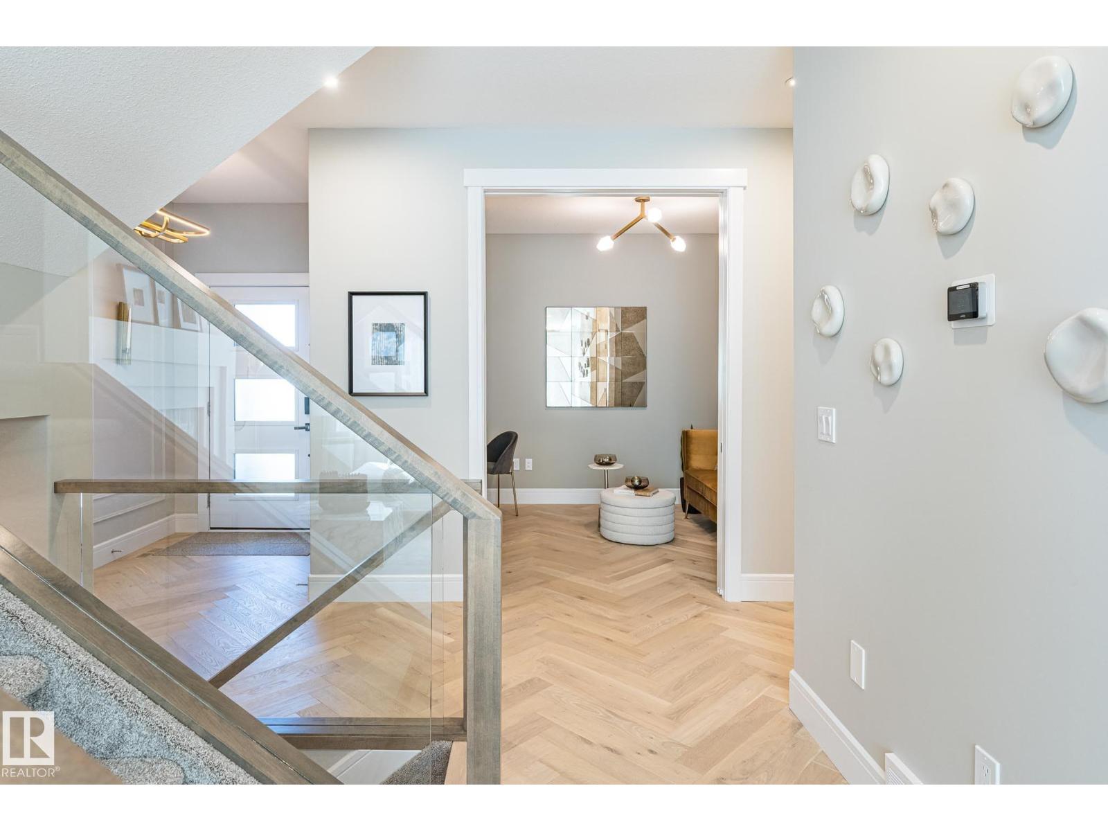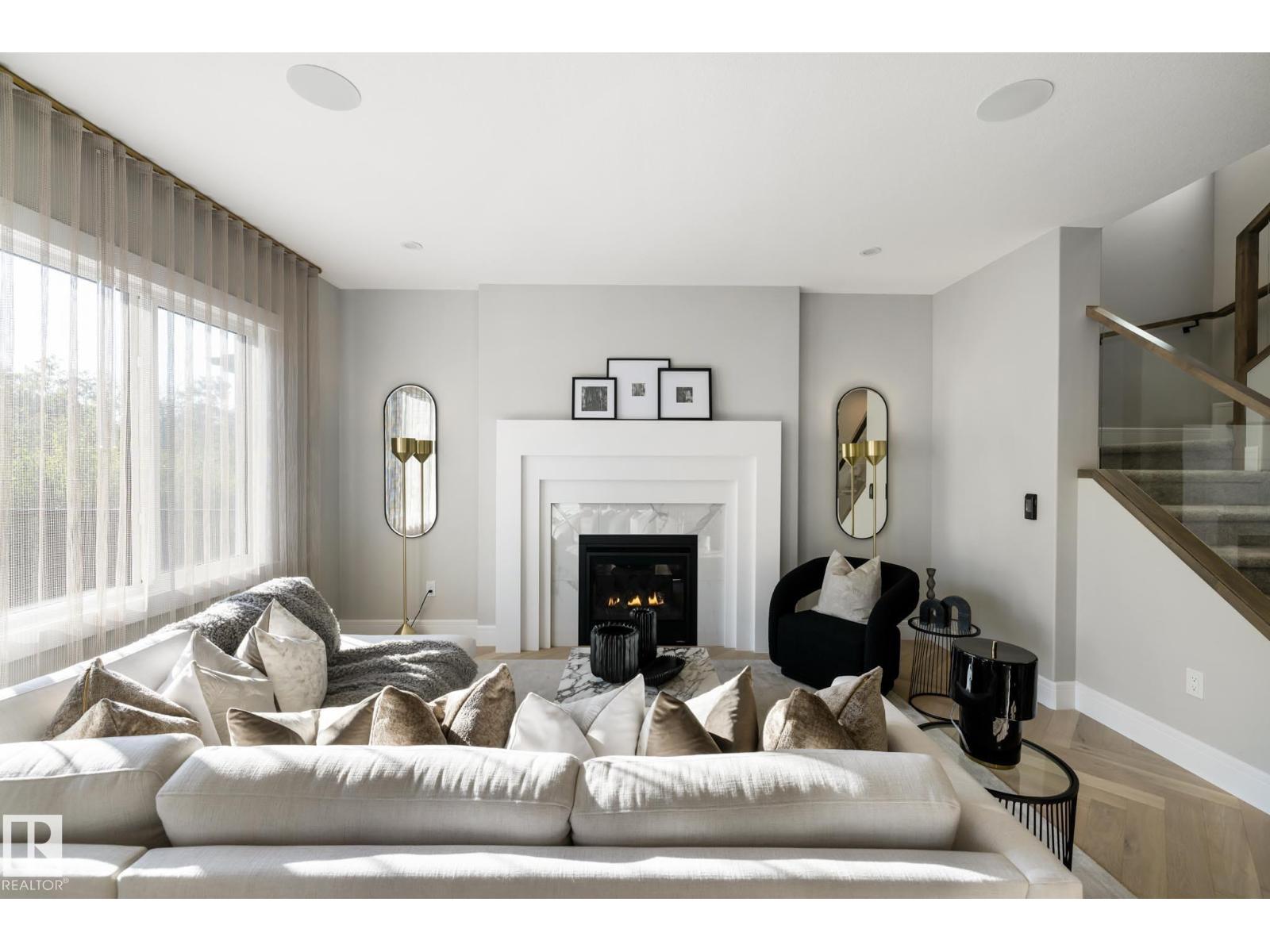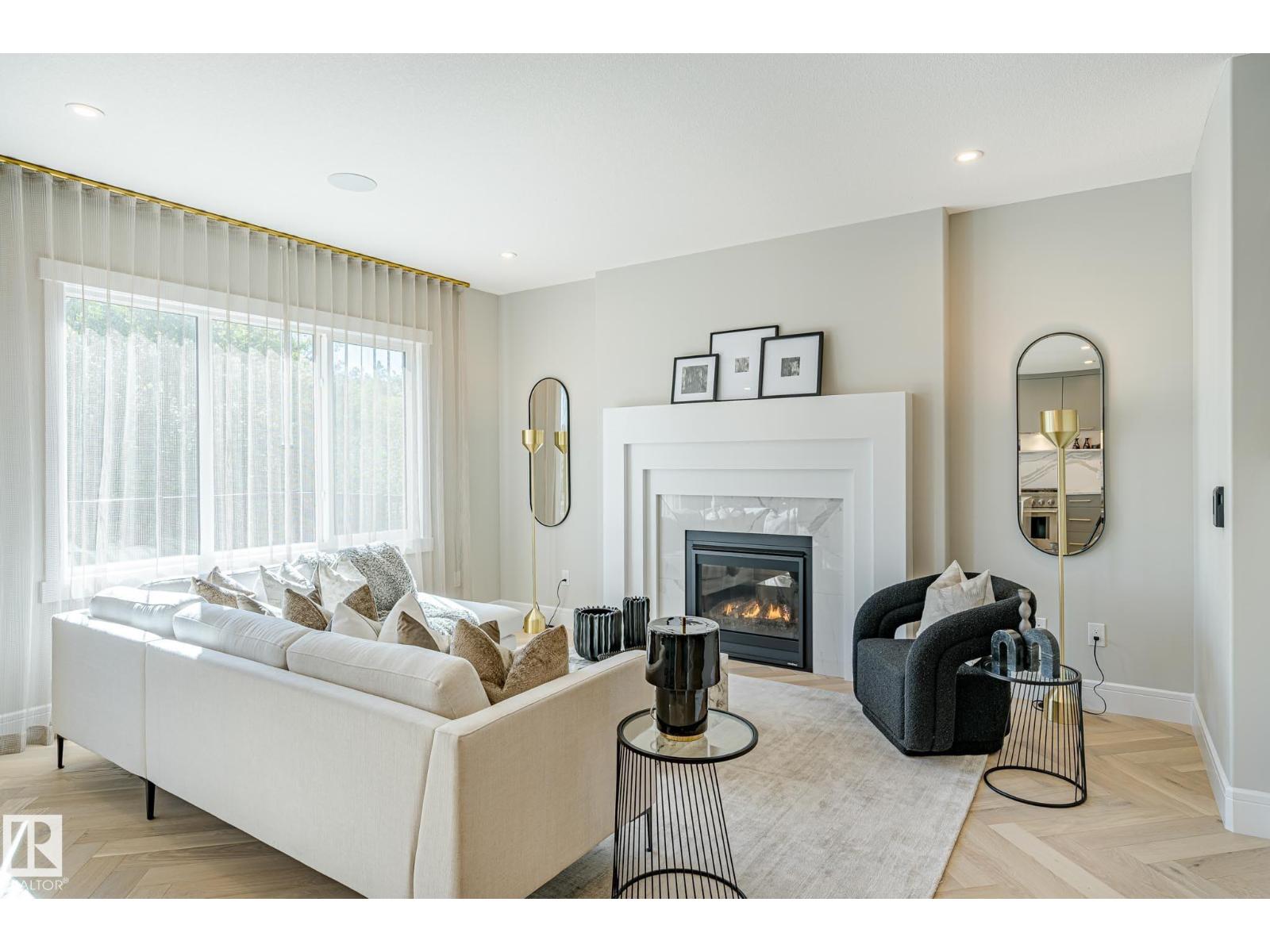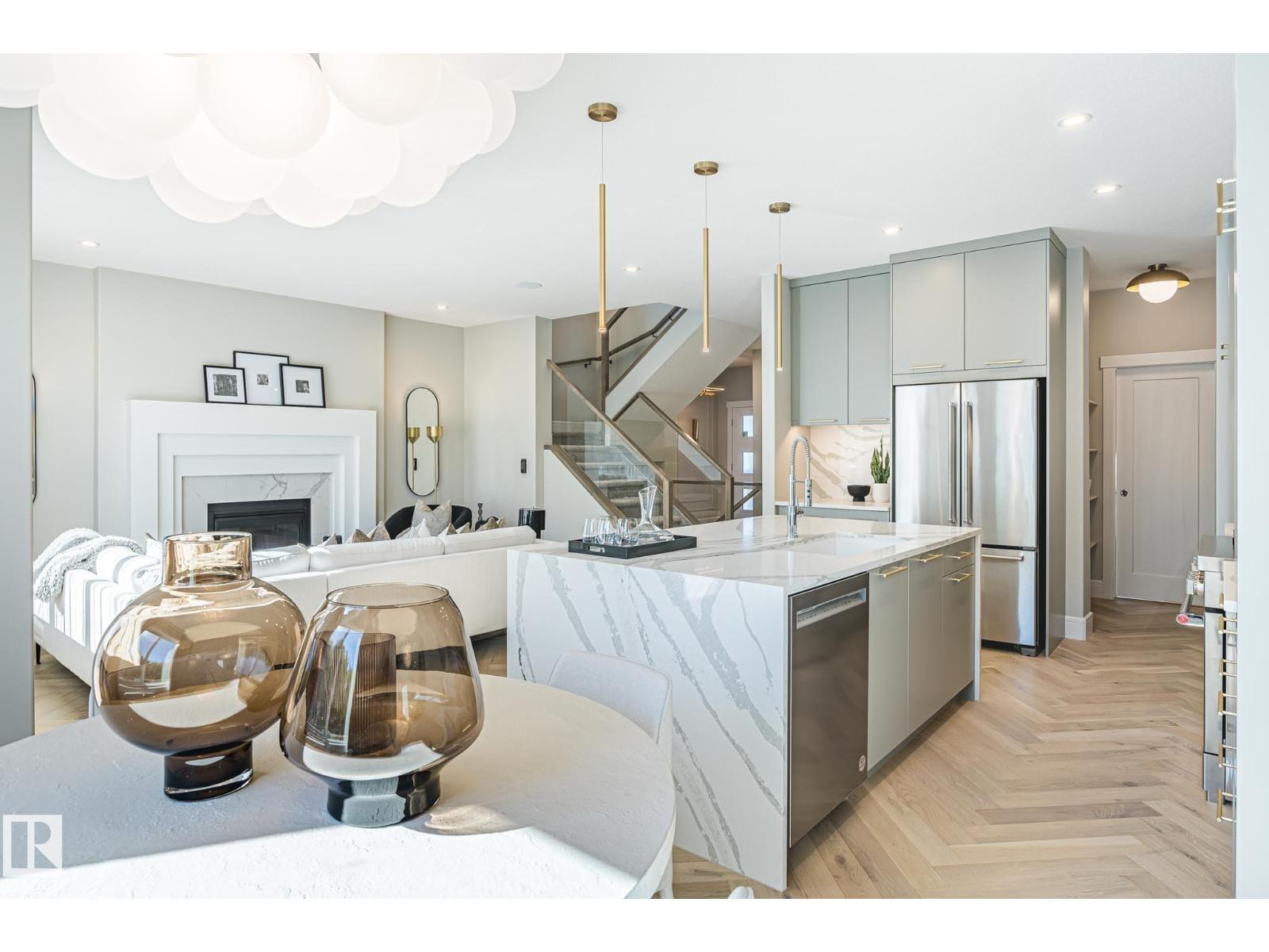 Designed to leave a lasting impression, this former Coventry Homes showhome captures the perfect balance of luxury and comfort. The main floor showcases 9’ ceilings (also in the basement), herringbone hardwood, and a showstopping kitchen w/ stainless steel appliances, gas stove, waterfall quartz island, full quartz backsplash, upgraded cabinetry, and walkthrough pantry. Gather in the inviting living room around the stunning mantel and gas fireplace, while a dining area, main floor den, mudroom, and half bath add everyday ease. Upstairs, the spacious primary suite offers a walk-in closet and spa-like ensuite w/ freestanding tub, tiled glass shower, and dual sinks, plus a bonus room, 2 bedrooms, full bath, and laundry. The finished basement features a 2-sided fireplace, wet bar, rec space, 4th bedroom, games area, and full bath. Landscaped yard, deck, and double attached garage complete this exceptional home. (id:63190)