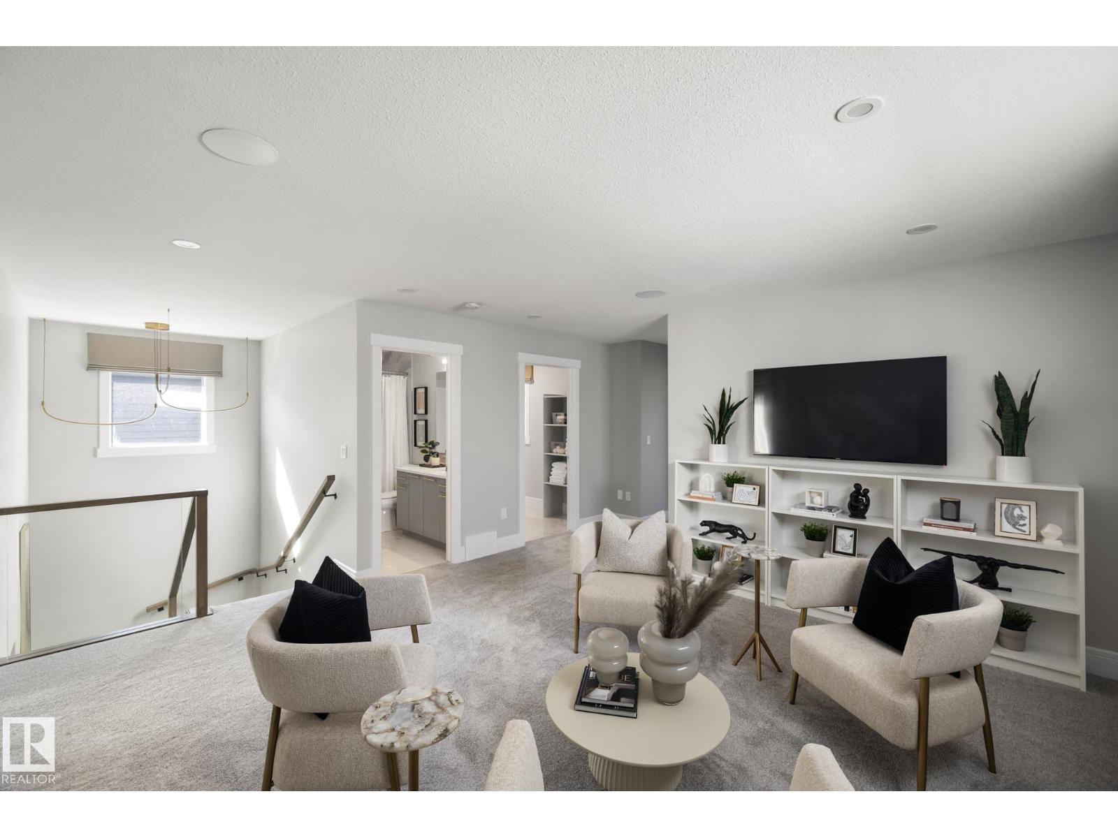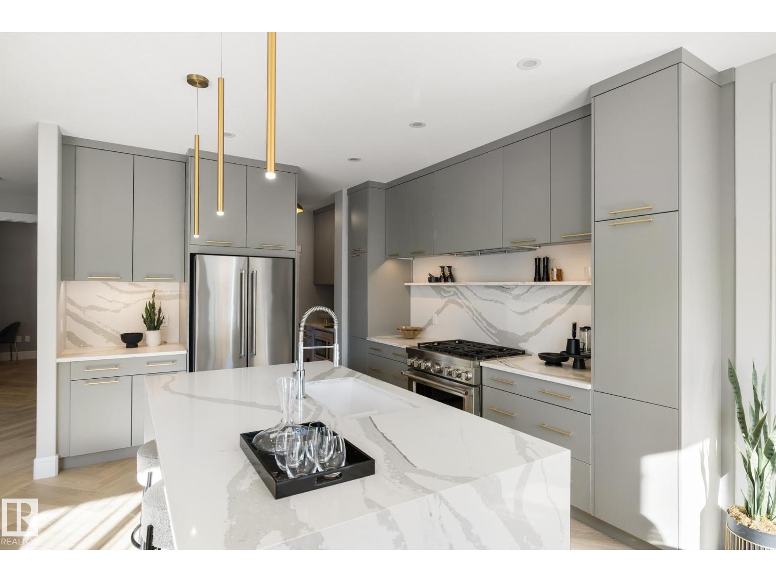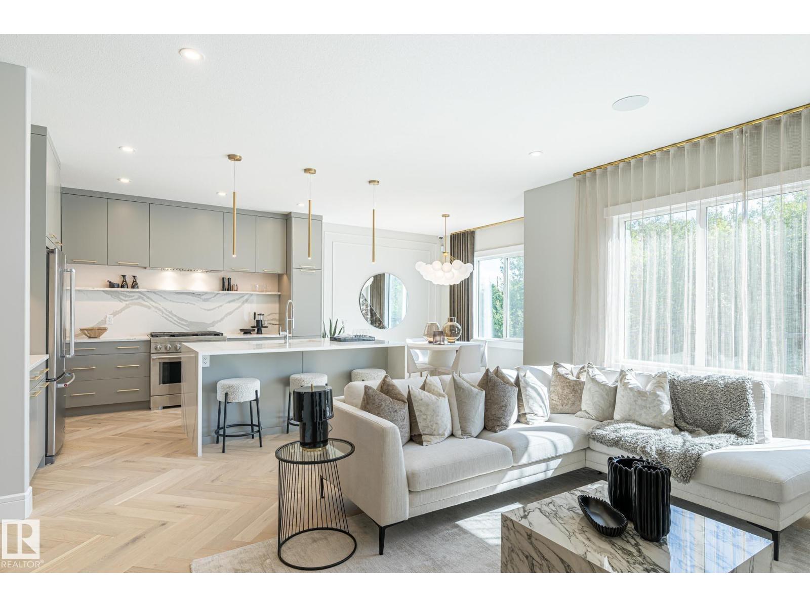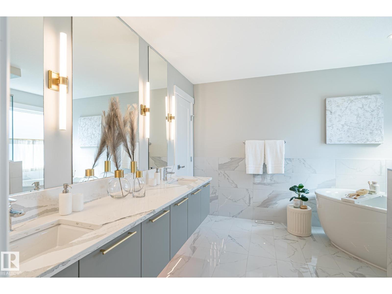 Designed to leave a lasting impression, this former Coventry Homes showhome captures the perfect balance of luxury and comfort. The main floor showcases 9’ ceilings (also in the basement), herringbone hardwood, and a showstopping kitchen w/ stainless steel appliances, gas stove, waterfall quartz island, full quartz backsplash, upgraded cabinetry, and walkthrough pantry. Gather in the inviting living room around the stunning mantel and gas fireplace, while a dining area, main floor den, mudroom, and half bath add everyday ease. Upstairs, the spacious primary suite offers a walk-in closet and spa-like ensuite w/ freestanding tub, tiled glass shower, and dual sinks, plus a bonus room, 2 bedrooms, full bath, and laundry. The finished basement features a 2-sided fireplace, wet bar, rec space, 4th bedroom, games area, and full bath. Landscaped yard, deck, and double attached garage complete this exceptional home. (id:63190)