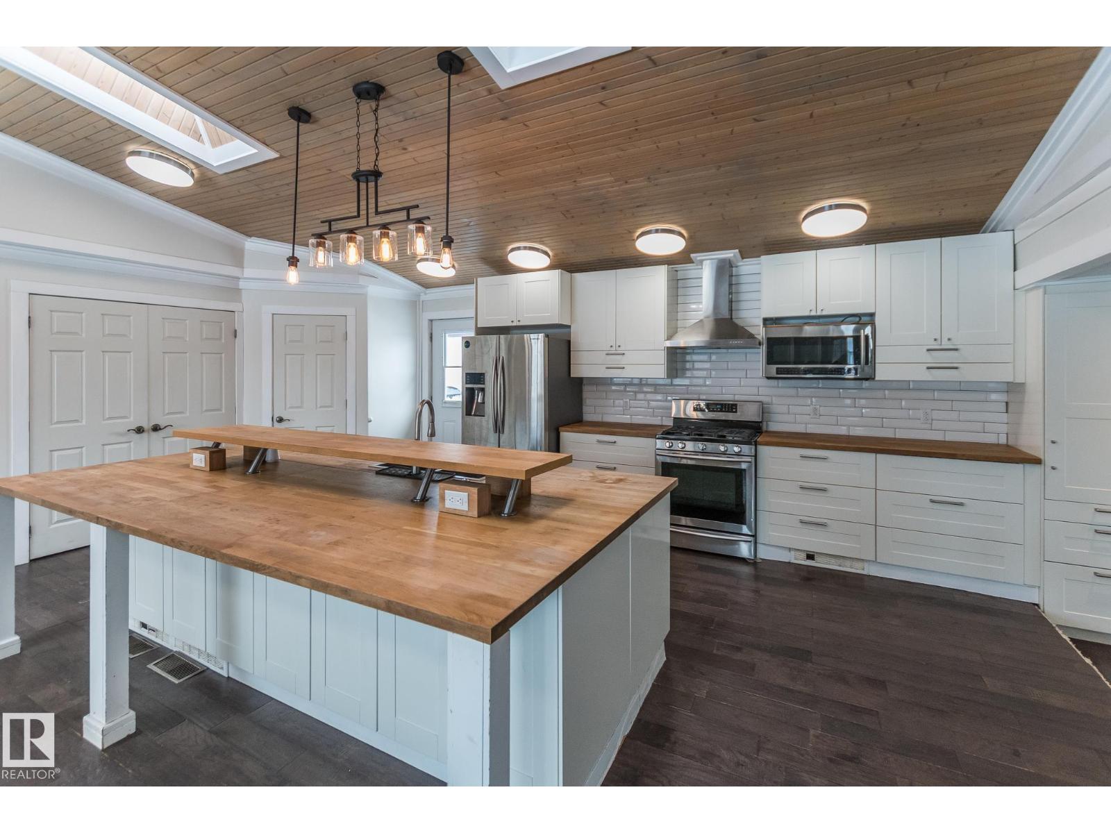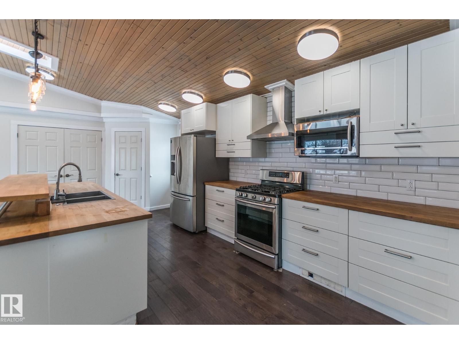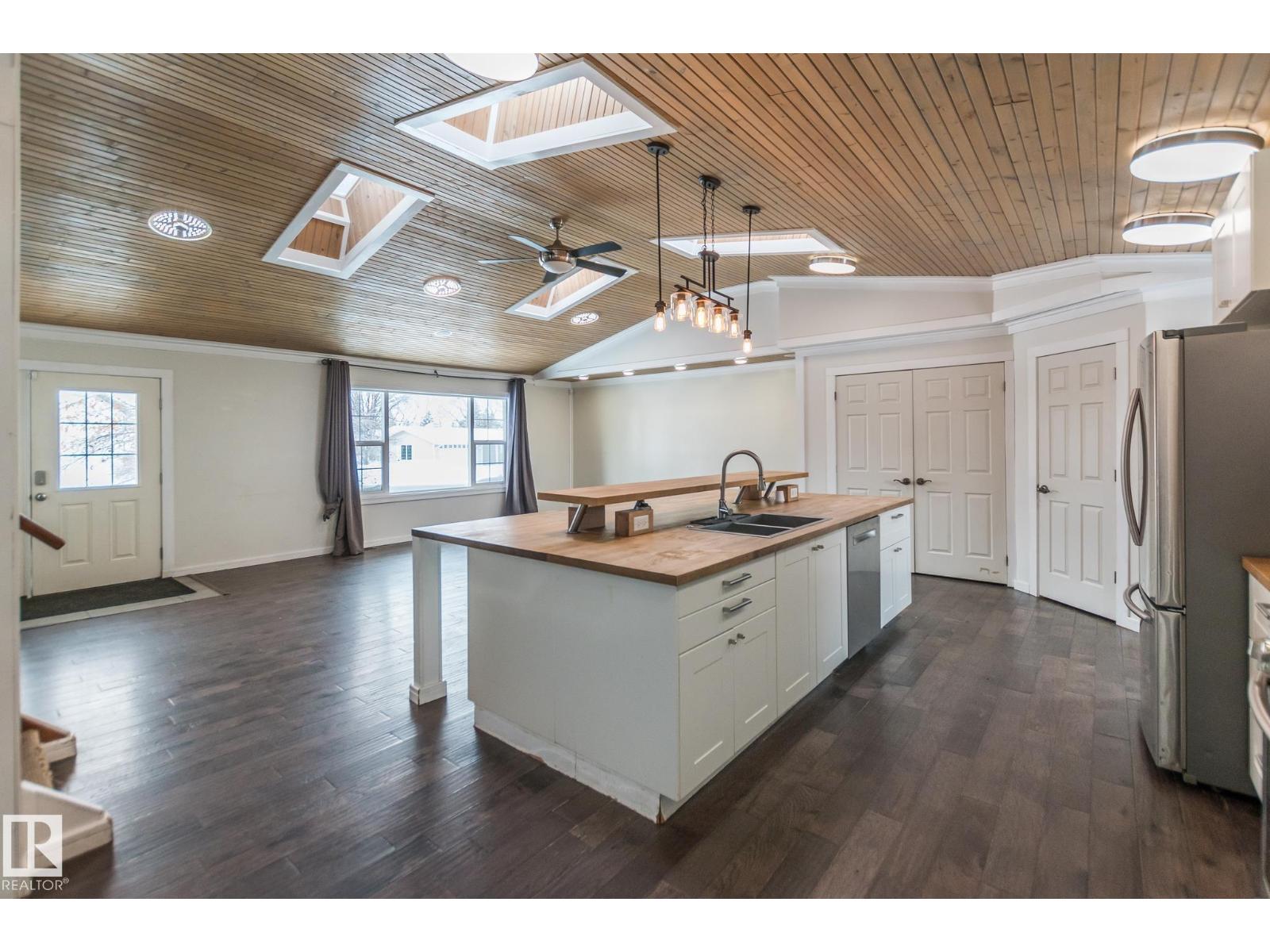 Welcome to this beautifully updated 3-level split offering 2,026 sq ft of living space, thoughtfully designed for comfort and function. This home features 4 bedrooms and 4 bathrooms, including a stylish 4-piece ensuite. The bright and open kitchen is a true showstopper—complete with white cabinetry, butcher block counters, stainless steel appliances, a large island with seating, and stunning wood ceilings with skylights that fill the space with natural light. Enjoy relaxing in the hot tub room, perfect for year-round use, or unwind in the fully fenced backyard, ideal for family gatherings and outdoor living. The oversized double detached heated garage provides plenty of space for vehicles, storage, or a workshop. Nestled in a quiet cul-de-sac and close to schools, this home is perfect for families seeking space, privacy, and convenience. (id:63190)