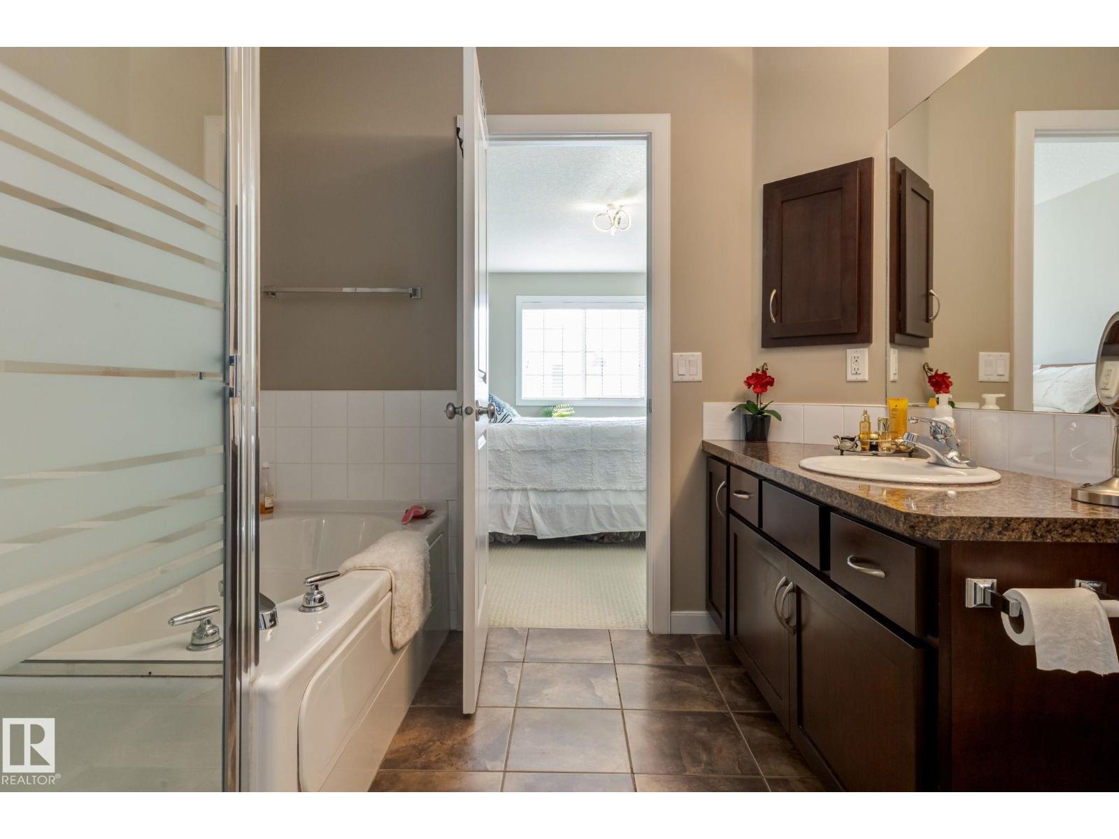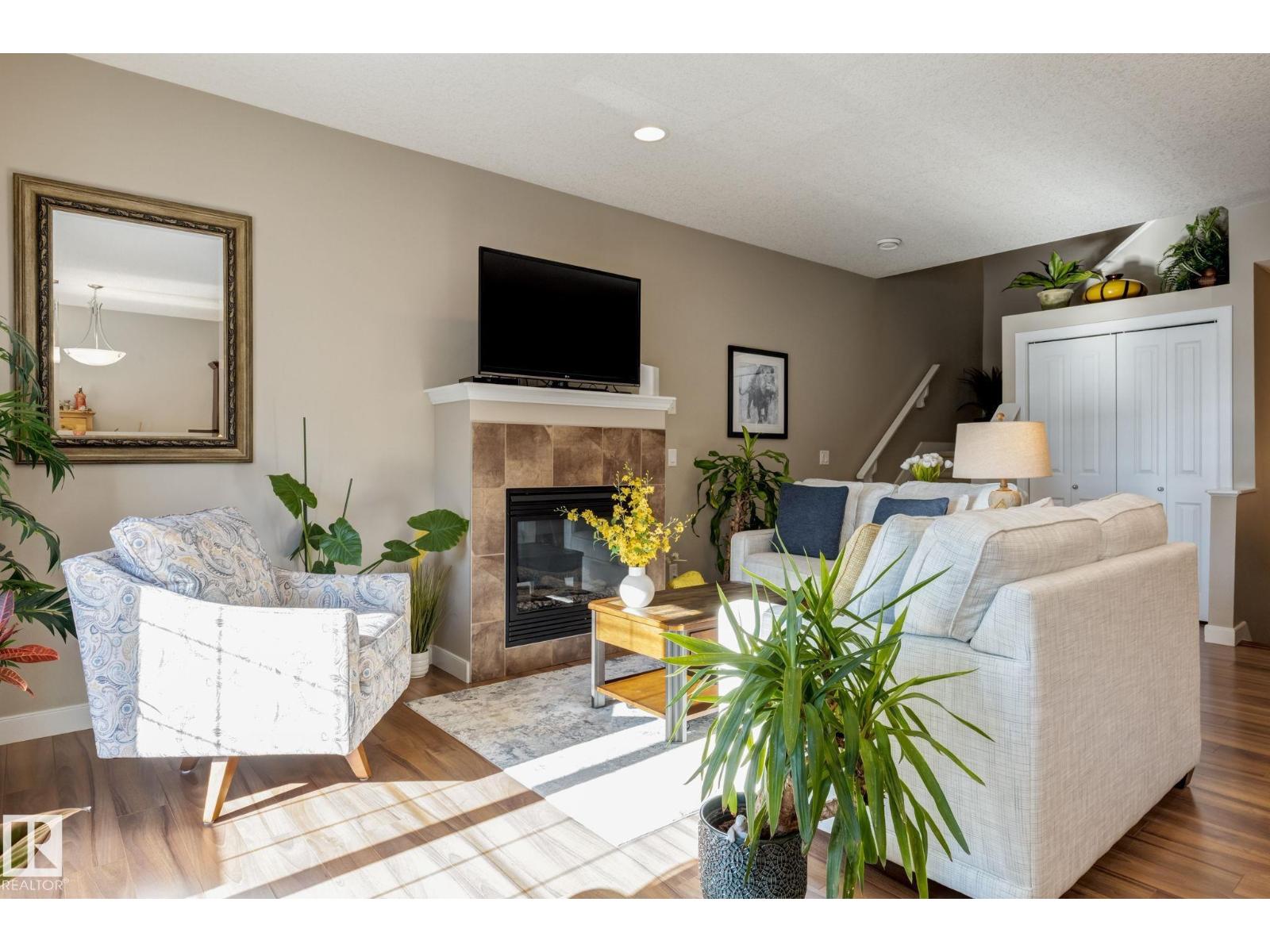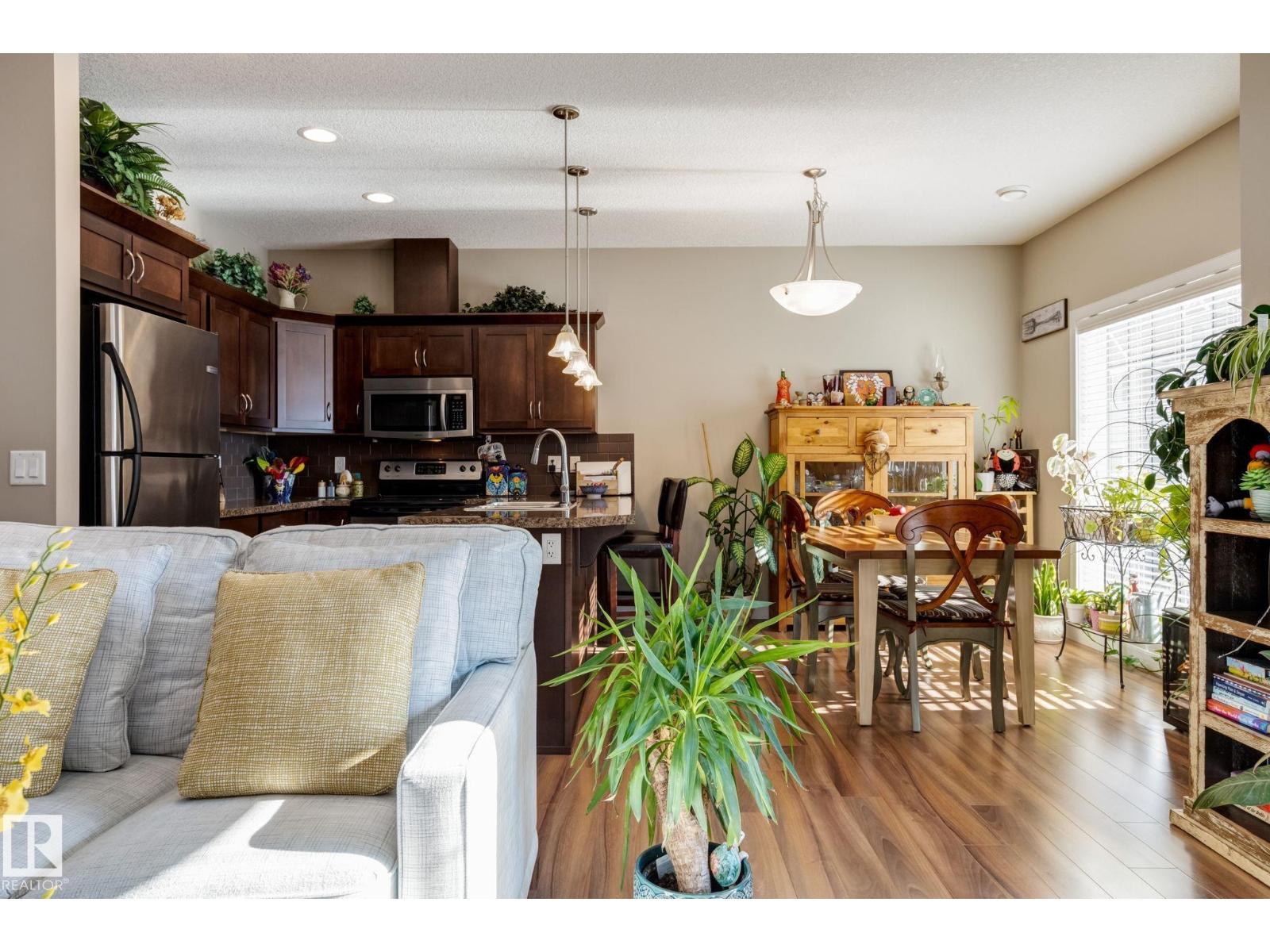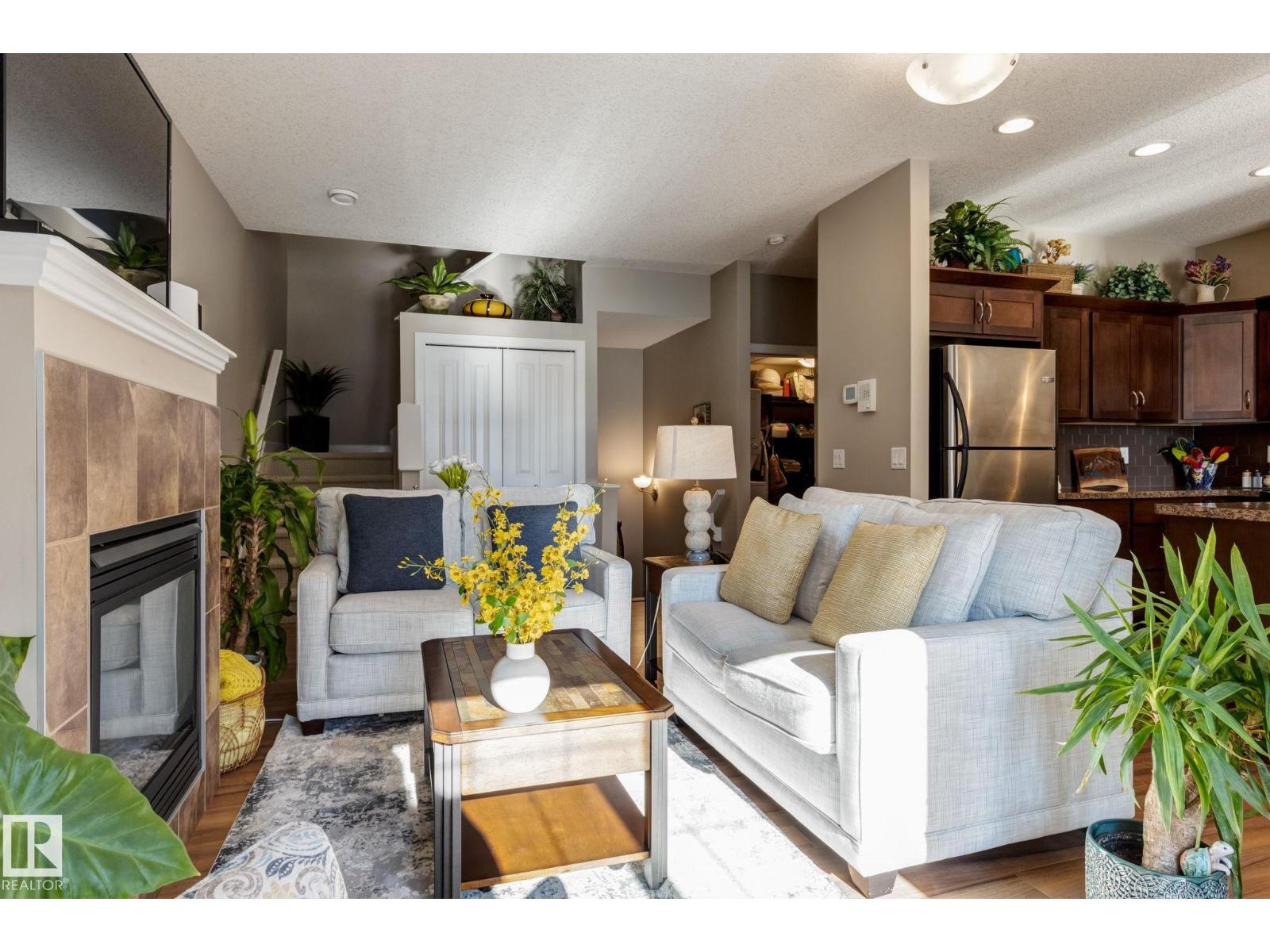 Immaculate and move-in ready, this unit offers outstanding value with all appliances included. Positioned near the front entrance for easy access, it’s also tucked away from building traffic, giving you a quiet, private setting. The home features rich espresso cabinetry, an open-concept kitchen overlooking the family room with a gas fireplace, six appliances, and attractive walnut-style laminate flooring in wide planks. Enjoy 9' ceilings, French doors leading to the deck with a gas BBQ hookup, and the convenience of main-floor laundry and an attached garage. Window coverings are already in place, and the home feels better than new. Both bedrooms are generously sized, and the primary suite includes a spa-inspired ensuite with a soaker tub, separate shower, and a large walk-in closet. With two full baths plus a half bath, this home delivers comfortable executive living at an attainable price. The location provides quick access to Anthony Henday Drive, transit, and nearby essentials. (id:63190)