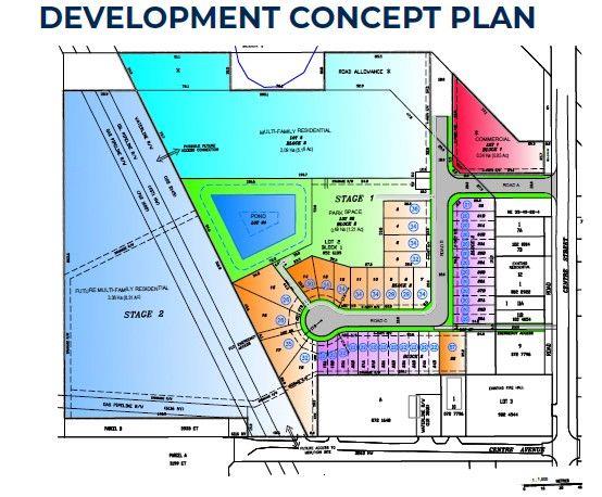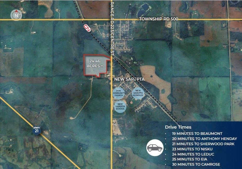 Visit the Listing Brokerage (and/or listing REALTOR®) website to obtain additional information. 24.46 acres ± of fully serviced, development-ready land located within the Town of New Sarepta, governed by Leduc County. Immediate access to Highway 21 in established community with schools, recreation, and amenities. Engineering may proceed once the purchaser customizes the site layout. The construction can be staged with minimal offsite improvements required. Approved zoning allows for Commercial, Single-family, Duplex, and Multi-family residential development with strong opportunity for aging-in-place or seniors housing, particularly on the high-density, multi-family parcels. (id:63190)