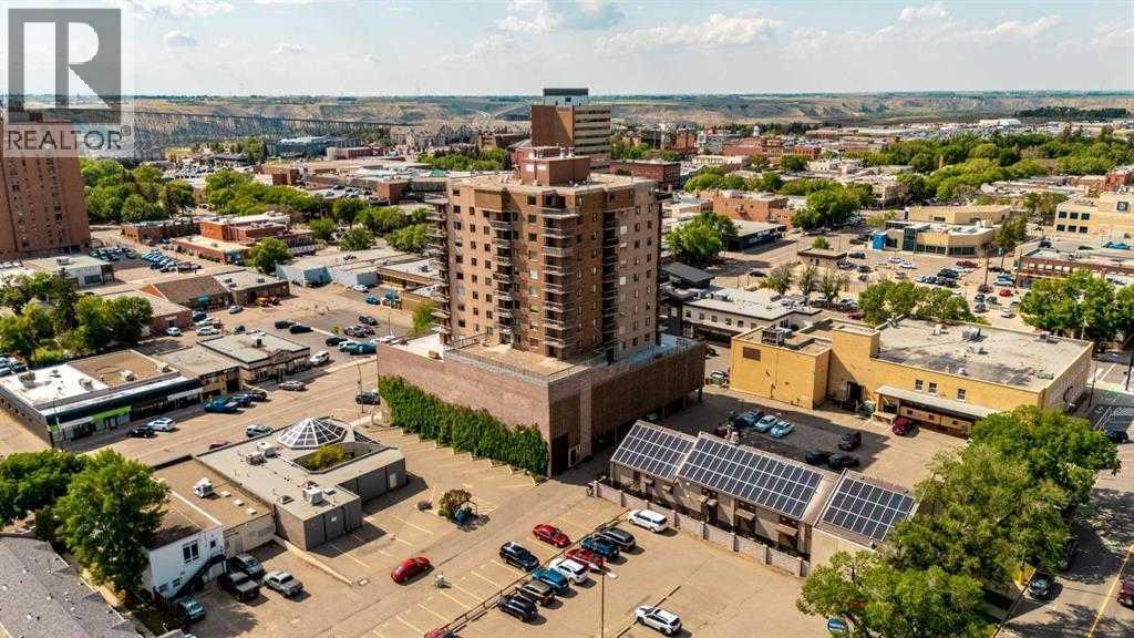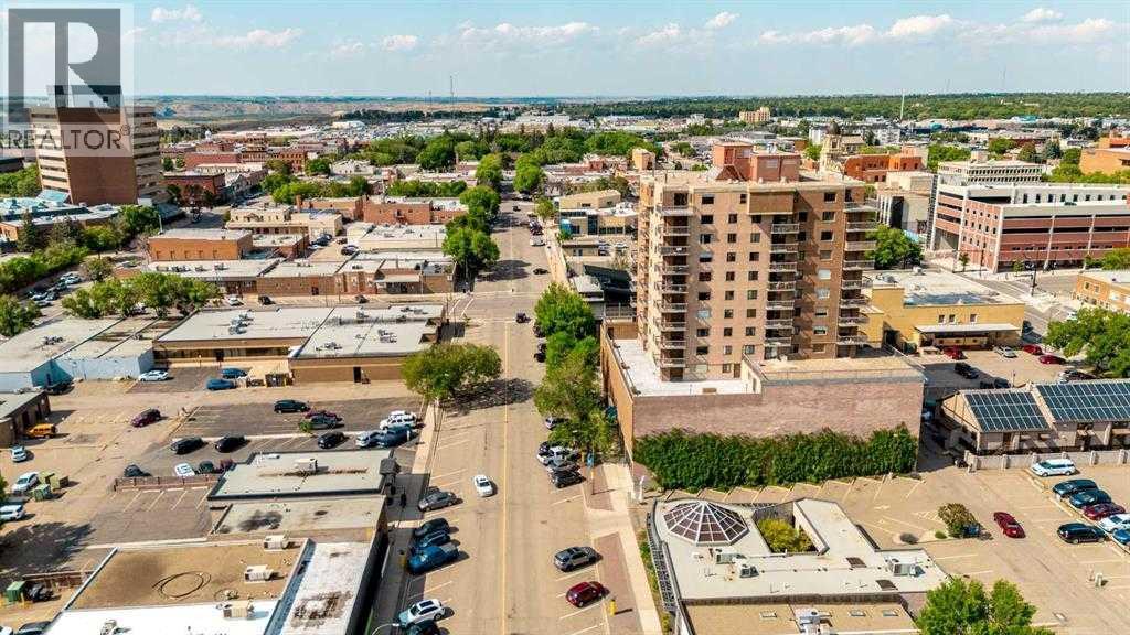 Experience easy downtown living in this inviting 1-bedroom condo overlooking the heart of Lethbridge. Located on the desirable second floor of The Landmark, this unit enjoys access to the sought-after “Promenade” deck—an expansive wraparound patio that spans much of the building, offering exceptional outdoor space to relax and take in the panoramic city views.The well-planned interior features a functional kitchen, spacious dining area, and a bright living room that opens onto the wraparound balcony. The generous primary bedroom is complemented by a full 4-piece bathroom and convenient in-suite storage, creating a comfortable and practical layout. Constructed with concrete, the building provides enhanced durability, sound insulation, and long-term value—offering a quieter, more solid living experience. The unit is also equipped with pre-existing air conditioning system, ensuring year-round comfort.This secure building offers outstanding amenities, including two elevators, an exercise room and sauna, a social/games room with pool table, shuffleboard, and ping pong, on-site laundry facilities, and bike storage. Enjoy true downtown convenience with shops, restaurants, and services just steps away, plus the added benefit of being right on the bus line for the university and college—making it an excellent option for students, professionals, or investors alike.Condo fees cover all utilities except cable and internet . A secure parkade parking stall is included. Perfect for low-maintenance urban living! (id:63190)