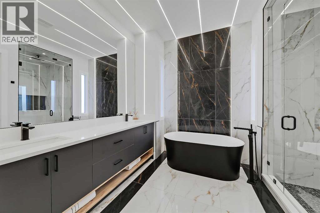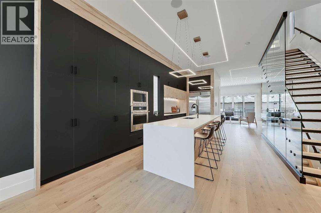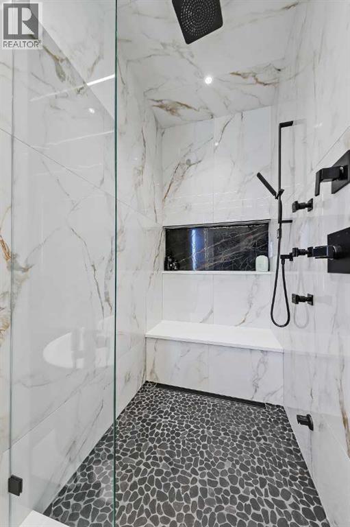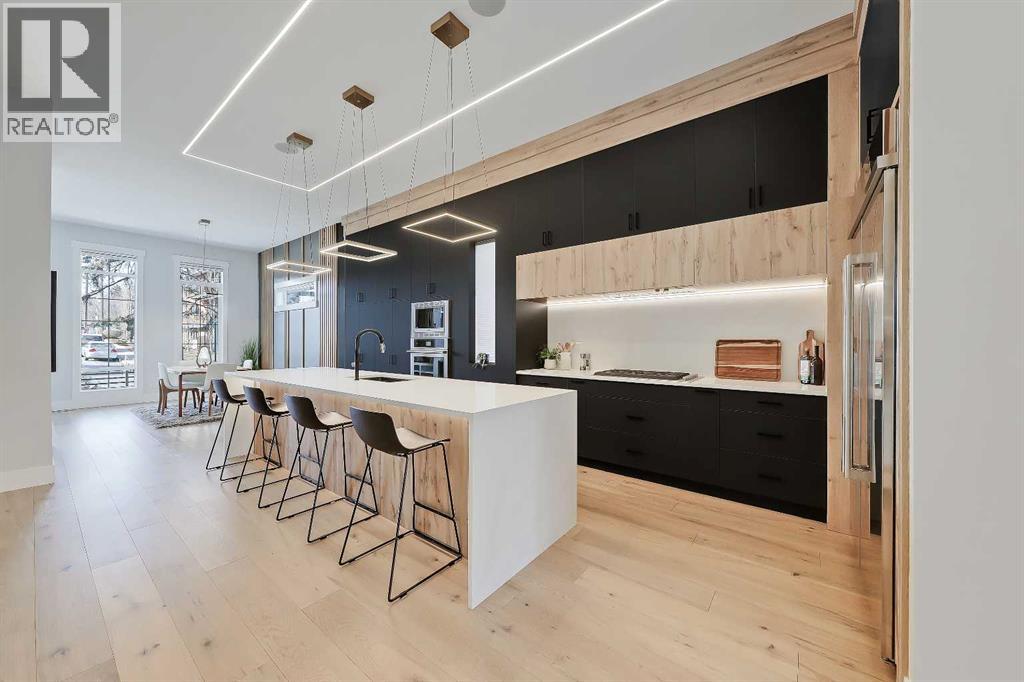 PRICED TO SELL! Save $85,000 on this modern, updated DETACHED home! Welcome to life in Upper Mount Royal, one of Calgary’s most established and prestigious inner-city communities. Quiet, tree-lined streets, timeless character homes, and just steps from the energy of 17th Ave SW.This 4-bed, 3.5-bath luxury infill pairs elevated design with everyday livability. The brick exterior, artificial turf, and integrated landscape lighting deliver standout curb appeal with minimal maintenance. Inside, soaring ceilings and wide-plank hardwood floors set a refined tone. The foyer features a custom built-in bench with a wood slat feature wall that blends warmth with modern detail. The open-concept main floor is built for connection. Host in the bright dining area and gather around the oversized waterfall quartz island. The kitchen showcases full-height flat-panel cabinetry, premium appliances, under-cabinet lighting, and statement pendants. Black and natural wood finishes feel contemporary yet enduring.In the living room, a dramatic floor-to-ceiling black marble fireplace with gold veining creates a bold focal point. Large sliding glass doors open to the rear deck for seamless indoor-outdoor entertaining. The landscaped backyard offers privacy screens, underground sprinklers, and ambient lighting, creating a low-maintenance retreat in the heart of the city.A stylish powder room and functional mudroom with built-in storage complete the main level.Upstairs, a glass-enclosed staircase with open risers and LED lighting leads to a stunning primary suite. Arched windows flood the space with natural light, while the spa-inspired ensuite features heated floors, a freestanding tub, a STEAM SHOWER with rainfall head, and striking marble finishes that feel straight out of a boutique hotel.Two additional bedrooms, a modern 4-piece bath with heated floors, and a well-designed laundry room with sink and extra storage complete the upper level.The fully finished basement expands your liv ing space with a large media room, built-in media unit, sleek wet bar with wine storage, and a dedicated exercise area with rubber flooring and mirrored wall. A fourth bedroom and full bath make this level ideal for guests, teens, or a private office.Smart home technology allows control of heating, cooling, lighting, security, and the fireplace from your phone. Built-in speakers, Hunter Douglas automated blinds, central A/C, security cameras, and an insulated double garage roughed-in for a gas heater complete the package.From your front door walk to the cafés, restaurants, and boutiques that define the Red Mile. Morning coffee at Analog or Deville. Dinner at Model Milk, Lulu Bar, or Una. Pick up wine, flowers, or groceries without starting your car. Western Canada High School, Mount Royal School, and nearby green spaces are all within easy reach, while downtown is just minutes away by car, bike, or transit. (id:63190)