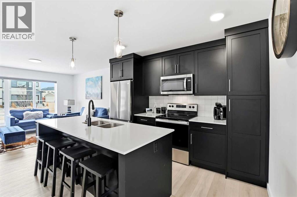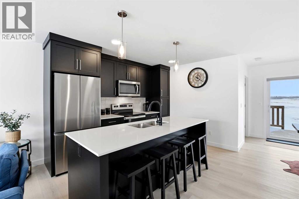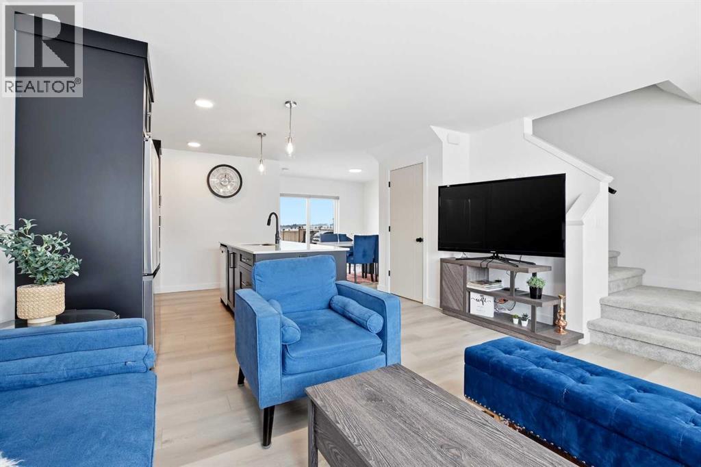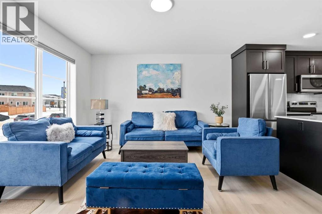 Welcome to this beautifully crafted Falcon Homes townhouse in the desirable community of Liberty Landing. Offered FULLY FURNISHED and completely move-in ready, this professionally styled home is a rare opportunity to enjoy turnkey living with every detail already complete.Ideally located just minutes from Gasoline Alley, you’ll appreciate quick access to shopping, restaurants, markets, and Highway 2, along with nearby wetlands and green space that make this growing community so attractive.The thoughtfully designed two-storey layout features a bright open-concept main floor with luxury vinyl plank flooring and large windows that flood the space with natural light. The kitchen showcases elegant cabinetry, quartz countertops, full tile backsplash, stainless steel appliances, and a spacious sit-up island perfect for entertaining. The main level also offers a generous dining area, 2-piece powder room, main floor laundry, and access to the back deck.Upstairs you’ll find three bedrooms, including a serene primary retreat with a private 3-piece ensuite featuring a tiled glass shower. A stylish 4-piece bathroom serves the additional bedrooms.The fully finished basement adds valuable living space with a large recreation room, fourth bedroom, and 4-piece bathroom.Enjoy the low maintenance landscaped, partially fenced yard with RV parking and additional off-street parking. With NO condo fees and the remaining new home warranty transferable to the new owner, this home offers exceptional value, comfort, and convenience in one of the area’s most sought-after communities. (id:63190)