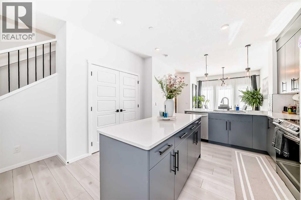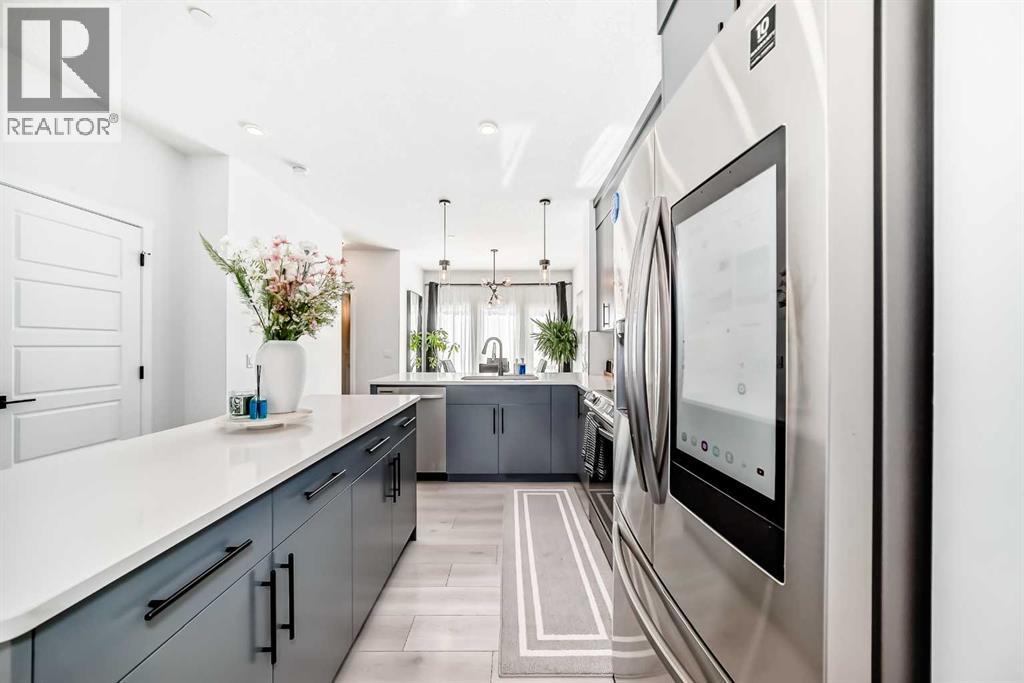 Modern & Bright 3-Bedroom Home in Desirable Livingston Welcome to contemporary living in the heart of the sought-after Livingston community! This stunning 3-bedroom home offers a modern design, stylish finishes, and a fantastic layout, perfect for a family or anyone looking for a move-in ready property with an exciting backyard space. Interior Highlights Step inside to a bright, open-concept main floor flooded with natural light. The inviting living room features a chic, neutral colour palette, beautiful flooring, and an elegant staircase, creating a sophisticated and comfortable space. The gourmet kitchen is a chef's dream, boasting striking blue-grey cabinetry, pristine white quartz countertops, sleek stainless steel appliances (including a modern fridge with a smart display), and a large central island perfect for meal prep and entertaining. Adjacent to the kitchen, the dining room offers a stylish space for family dinners with an eye-catching light fixture and large windows overlooking the yard. A convenient and beautifully appointed powder room is also located on the main floor. Upstairs, you'll find three generously sized bedrooms. The master suite is a true retreat, featuring a spacious layout, a large window with community views, a walk-in closet, and a private 3-piece ensuite bath. The two additional spacious bedrooms and a full main bathroom ensure comfort for everyone. For ultimate convenience, the laundry is also included on this level. Exterior & Community Features The home's exterior boasts attractive curb appeal with its modern architecture and striking siding. The private backyard is an oasis for relaxation and fun, featuring a well-maintained lawn, a back lane for easy access, and charming raised garden beds—perfect for a home gardener! A dedicated fire pit area makes it ideal for cool Calgary evenings and entertaining guests. The Livingston community offers exceptional amenities, parks, and easy access to major routes, making it a highly desirable place to call home. Don't miss the chance to own this exceptional property. Book your private showing today! (id:63190)