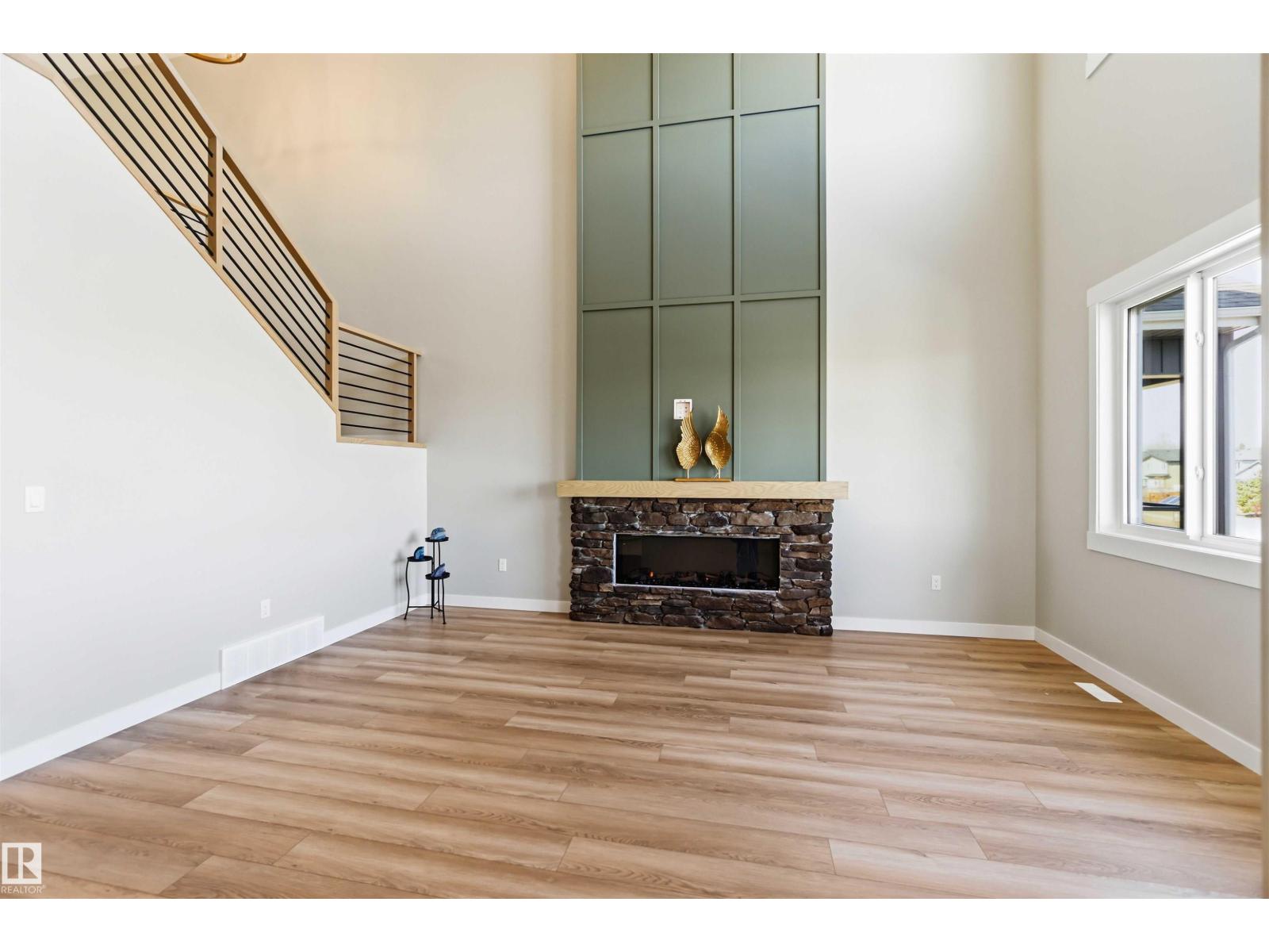 BRAND NEW! High-Quality Craftsman-Style WALKOUT Home by local builder LCM Construction, located in the Hilldowns neighborhood of Spruce Grove! This stunning walkout 2-storey home offers views of the community pond.This home features exceptional curb appeal w/Cypress & Tan vinyl exterior, white window & door trim, tan triple garage doors, & accent stone on the front.The main floor offers a modern floor plan w/9 ft ceilings, luxury vinyl plank flooring, flex/office room, mudroom w/ built-in bench, 20 ft open-to-below living room w/ feature wall & fireplace, & kitchen w/ 4 ft wide quartz island, walkthrough pantry, SS appliances, & modern black fixtures & hardware. Upstairs offers an open bonus room, carpet flooring, laundry room w/ quartz countertop, two large bedrooms, & spacious primary bedroom w/ 5-piece ensuite, modern soaker tub, tiled shower, enclosed toilet, & walk-in closet. Enjoy the oversized covered deck w/ stairs leading down to the backyard. The walkout basement offers additional living space. (id:63190)