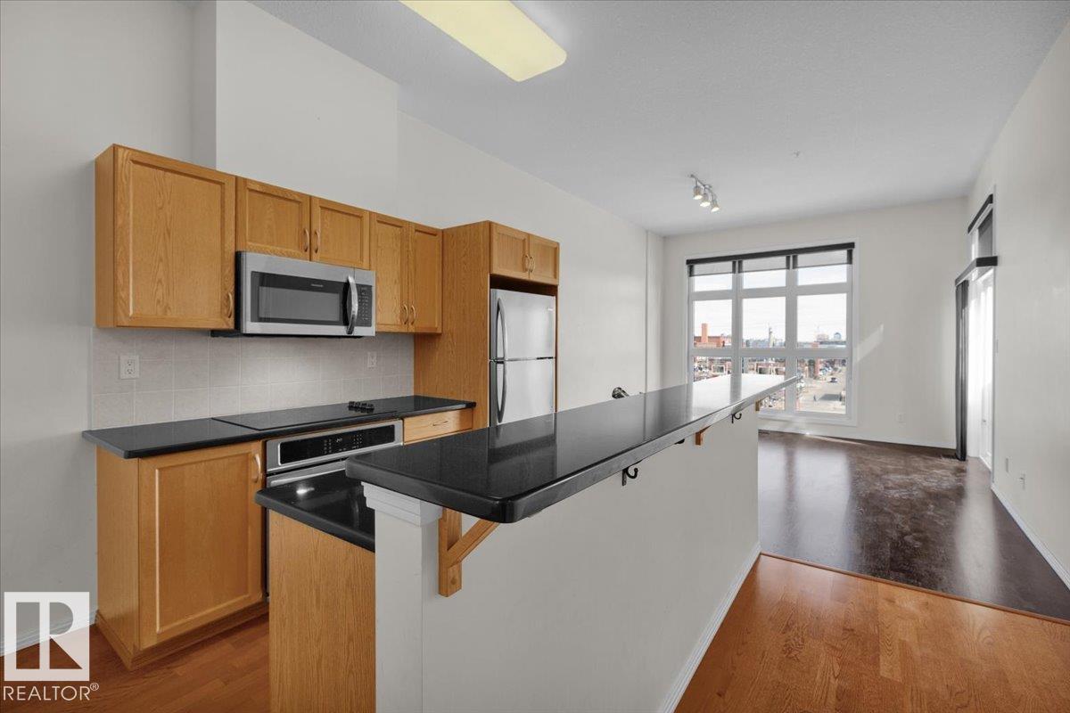 Top-floor condo at Glenora Gates with unobstructed downtown views in the heart of Edmonton — Low condo fees and Pet-friendly building, it's perfect for first-time buyers, students, or investors! This bright unit features soaring 10-foot ceilings with large East-facing windows, equipped with modern blinds, that fill the space with natural light. Unbeatable location just steps from 124th Street, Manchester Square, Brewery District, Roger's place, MacEwan, and more — Great access to local shops, restaurants, gyms...etc. The upcoming Valley West LRT station is less than a block away for quick access to anywhere in the city. Everything you need right at your doorstep! Multiple River Valley trails are just blocks away. Upgrades include a newer carpet in the Bedroom, engineered hardwood, quartz countertops in the kitchen with a breakfast bar, newer SS appliances, Central A/C for the HOT summer months, & HWT replaced in 2018. Comes with a secure Underground parking stall and private storage cage. Don't Miss Out! (id:63190)