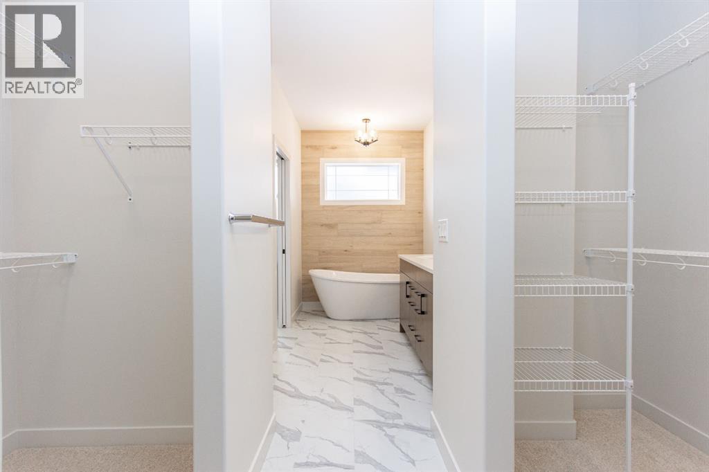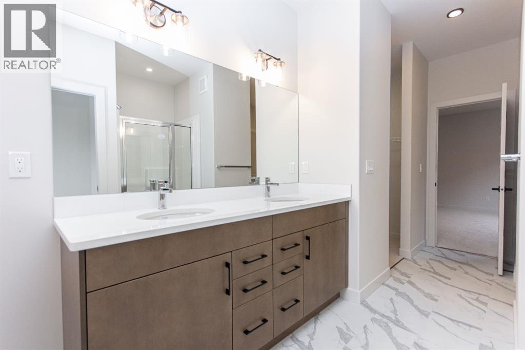 Executive living in one of Red Deer's best communities! The Timbers is an executive community of beautiful detached homes with fully fenced, private yards where your lawn maintenance and snow removal is all looked after for you, and there’s no restrictions on age or pets! This beautiful, brand new, fully finished bungalow offers a wide open plan with 9' ceilings and large windows that fill the space with natural light. The kitchen features raised two tone cabinetry, quartz counter tops, upgraded stainless steel appliances including an induction range, and a convenient corner pantry. The dining room provides access to the yard and composite deck through sliding patio doors, and you'll love relaxing in the large living room space. The primary bedroom enjoys a spa like ensuite with a freestanding tub, oversized shower, dual sinks, private water closet, and dual walk in closets. The main floor office provides a place to work or read, and main floor laundry just off the primary bedroom is an added convenience. The basement is fully finished with a massive family room and rec room area with plenty of space for a pool table and home theatre. Two bedrooms share a 4 pce bath and in-floor heat is roughed in for future use. The garage is insulated, drywalled, taped, and roughed in for a heater, and there’s a floor sump to help keep things clean in the winter months. Condo fees of $192.81/mo cover mowing and landscape maintenance, snow shovelling and street clearing in winter, and maintenance of common property including green spaces and walking trails. The builder can provide and install Central A/C and a garage heater if desired, and allowances for a washer and dryer or blinds through the builders suppliers at an added cost. GST is already included in the purchase price, and 1 year builder warranty and balance of 10 year Alberta New Home Warranty are included. Taxes have yet to be assessed. Immediate possession is available! (id:63190)