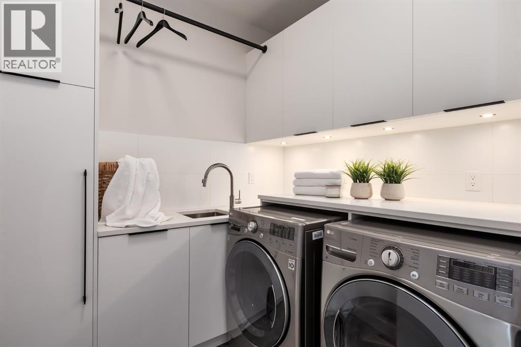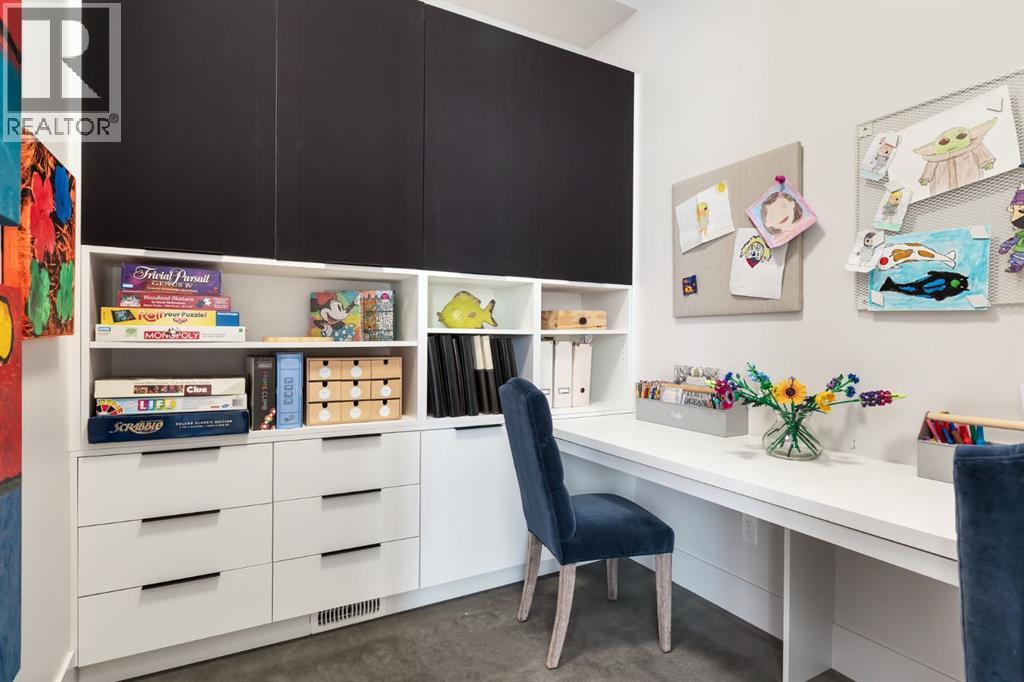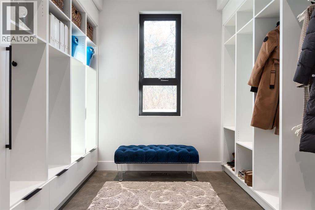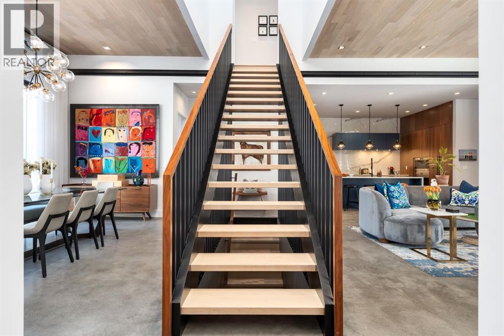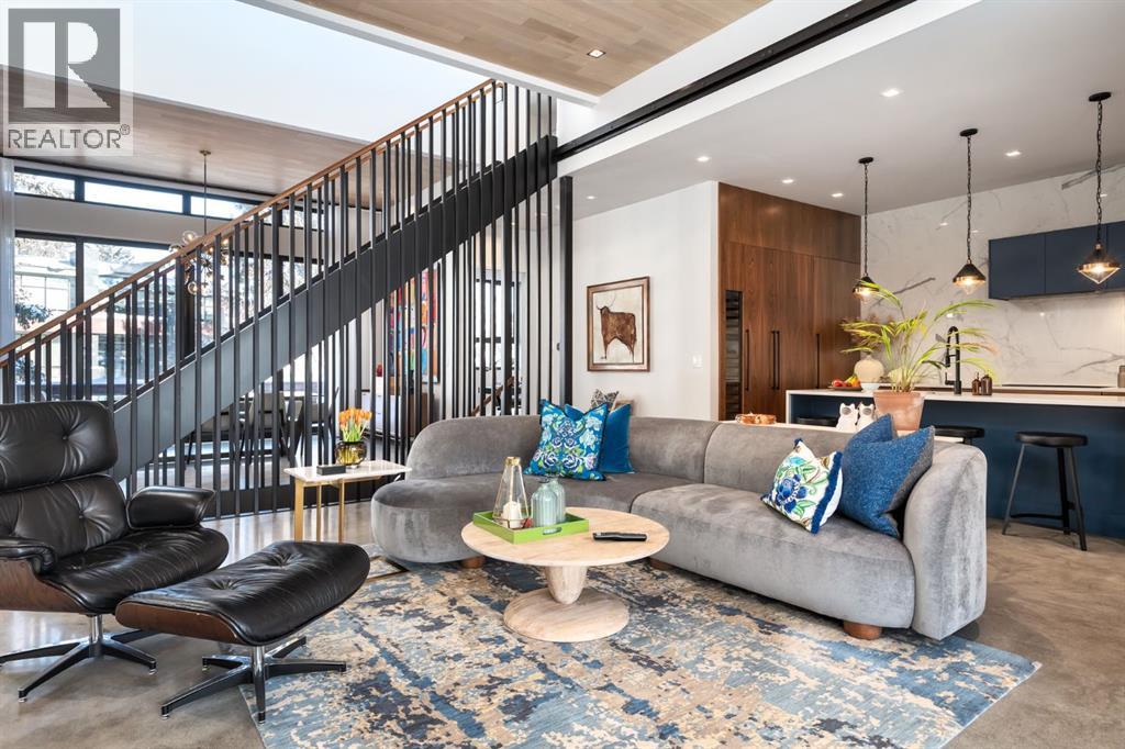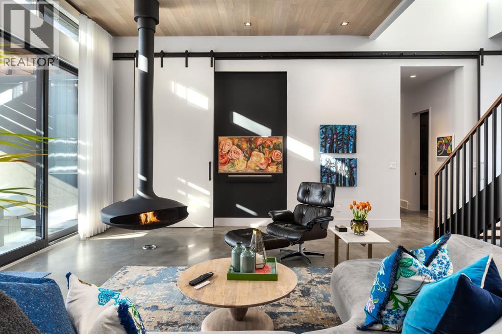 Set within one of Calgary’s most sought after inner city pockets, this architecturally driven residence blends scale, design & everyday livability. Situated on a south facing lot just over ¼ acre, a rare inner city offering, this custom Homes by Avi build with interiors by Connie Young Design balances striking architecture with functional living & exceptional craftsmanship. Featured in a design magazine & recognized with multiple awards, the home reflects a level of design rarely seen within inner city living. The thoughtfully designed 1.5 storey layout places the primary suite, additional bedroom, den, and flex room on the main level, with two upper bedrooms, each with an ensuite, plus a bonus room. Well suited for downsizers, families, and executive living, it offers main level convenience with independent upper living. Architectural features include polished concrete floors with in floor radiant heat, brushed oak engineered hardwood ceilings, recessed LED lighting, triple pane windows, & an open riser staircase beneath soaring 20 foot ceilings enhancing light & volume. The main living area features 12 foot ceilings, a suspended Scandinavian inspired gas fireplace, & two steel barn doors that open for flow or close for privacy from the bedroom wing. Oversized sliding glass doors connect the dining area to the front patio, while the mudroom offers built in storage & organization. Designed for everyday living & entertaining, the kitchen features book matched walnut inspired cabinetry, floating cabinets, porcelain tile backsplash, & a premium appliance package with Wolf built in wall oven, steam convection oven, Sub Zero integrated refrigeration, vertical freezer, & oversized wine fridge. The primary retreat offers patio access, a walk in closet, & a spa inspired ensuite with 14 foot ceilings, oversized steam shower & soaker tub, bidet toilet, & custom wood feature wallpaper for a five star hotel feel. Mechanical highlights include a high efficiency boiler, two furna ces, two central A/C units, HRV, water softener, sump pump, main floor mechanical room, & heated attached garage with epoxy floors & integrated wall storage. Oversized sliding glass doors open to a pergola covered patio with hot tub & gas fire table for effortless indoor outdoor living. The south facing backyard overlooks the outdoor skating rink, playgrounds, baseball diamond, & green space with direct access to the Elbow River, pathways, Stanley Park Outdoor Pool, Lawn Bowling Club, tennis courts, plus nearby amenities including the Saddledome & MNP Community & Sport Centre. Minutes to downtown, top rated schools, the Glencoe Club, & Calgary Golf & Country Club. The unfinished basement offers a blank canvas with nearly 10 foot ceilings, ready to customize. With protected sight lines, no direct rear neighbours, & seamless access to green space, this home offers privacy & architectural elegance. Architecturally stunning & designed for everyday living, a rare inner city opportunity. (id:63190)