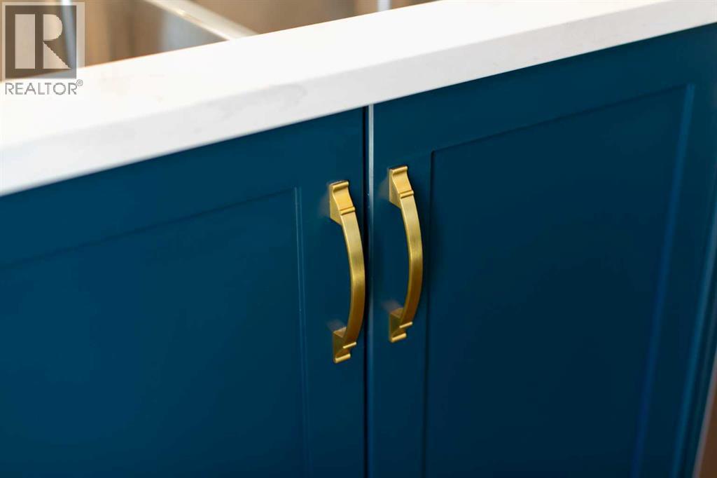 Enjoy the perfect blend of luxury with these gold and blue cabinets