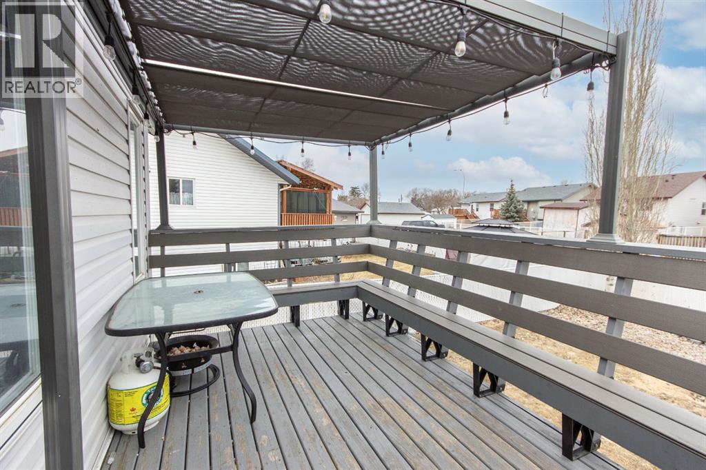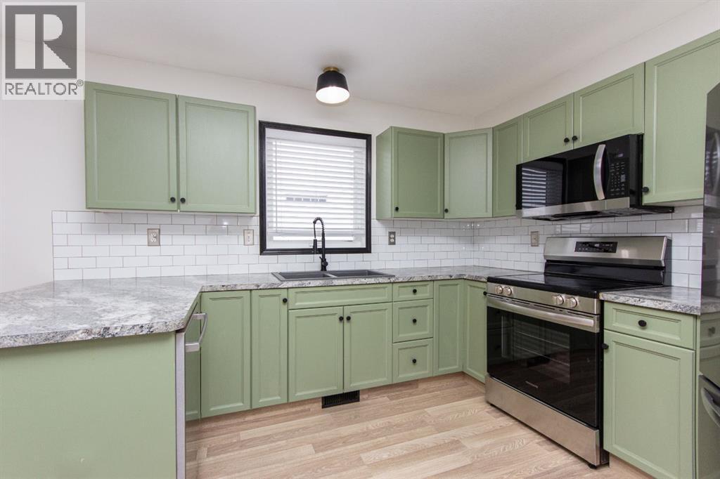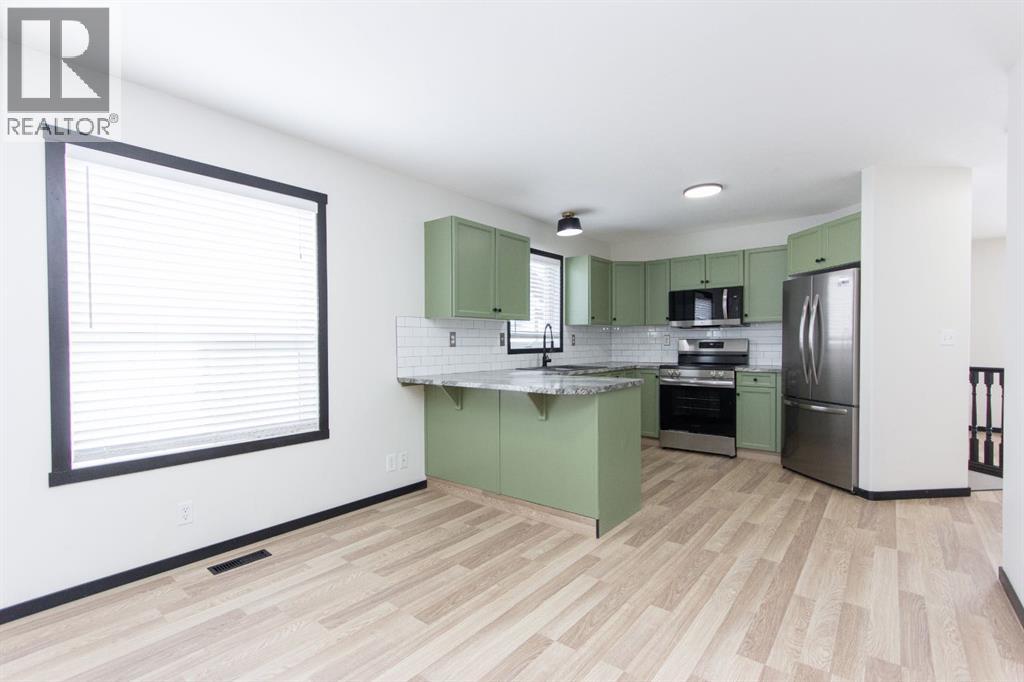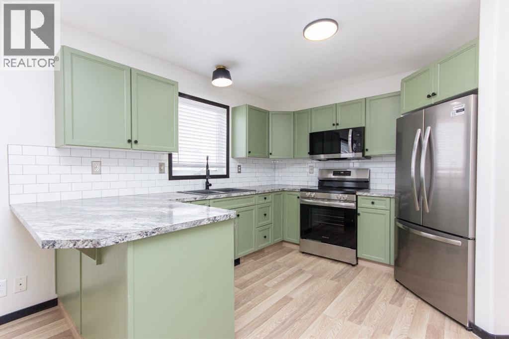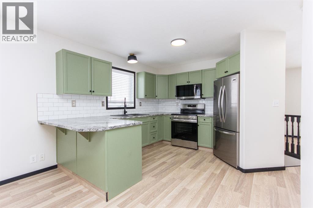 Welcome to this beautifully updated five bedroom, two bathroom bilevel nestled on a quiet close in the charming town of Penhold. From the moment you step inside, you’ll notice the care that has gone into this home, featuring new vinyl flooring on the main level, fresh paint throughout, and updated light fixtures.As you head upstairs, the space opens into a bright and inviting living room. Just off the living room, the kitchen is sure to impress with stunning green cabinetry, newer stainless steel appliances, and a breakfast bar perfect for casual dining. A dedicated dining area completes this wonderful space for entertaining.Down the hall you’ll find two bedrooms, including a versatile room ideal for a guest bedroom or home office, and a generous master bedroom overlooking the yard, bathed in natural light. The crown jewel of this floor is the stunning renovated bathroom, complete with a spa-like soaker tub, beautiful tile floors, and a new vanity.The main floor also features a large laundry room and mudroom leading out to the backyard, where a covered deck with a built-in bench awaits. Tucked beneath the deck is a fenced storage area, perfect for bikes and outdoor toys.The large heated double garage offers ample parking and two ceiling-mounted storage areas to keep everything organized.Downstairs, the basement provides a spacious TV room, three additional bedrooms, and a three-piece bathroom, offering plenty of room for the whole family.Additional updates include a newer hot water tank, A/C and shingles replaced around 2020, giving you peace of mind for years to come. This home is truly move-in ready. (id:63190)