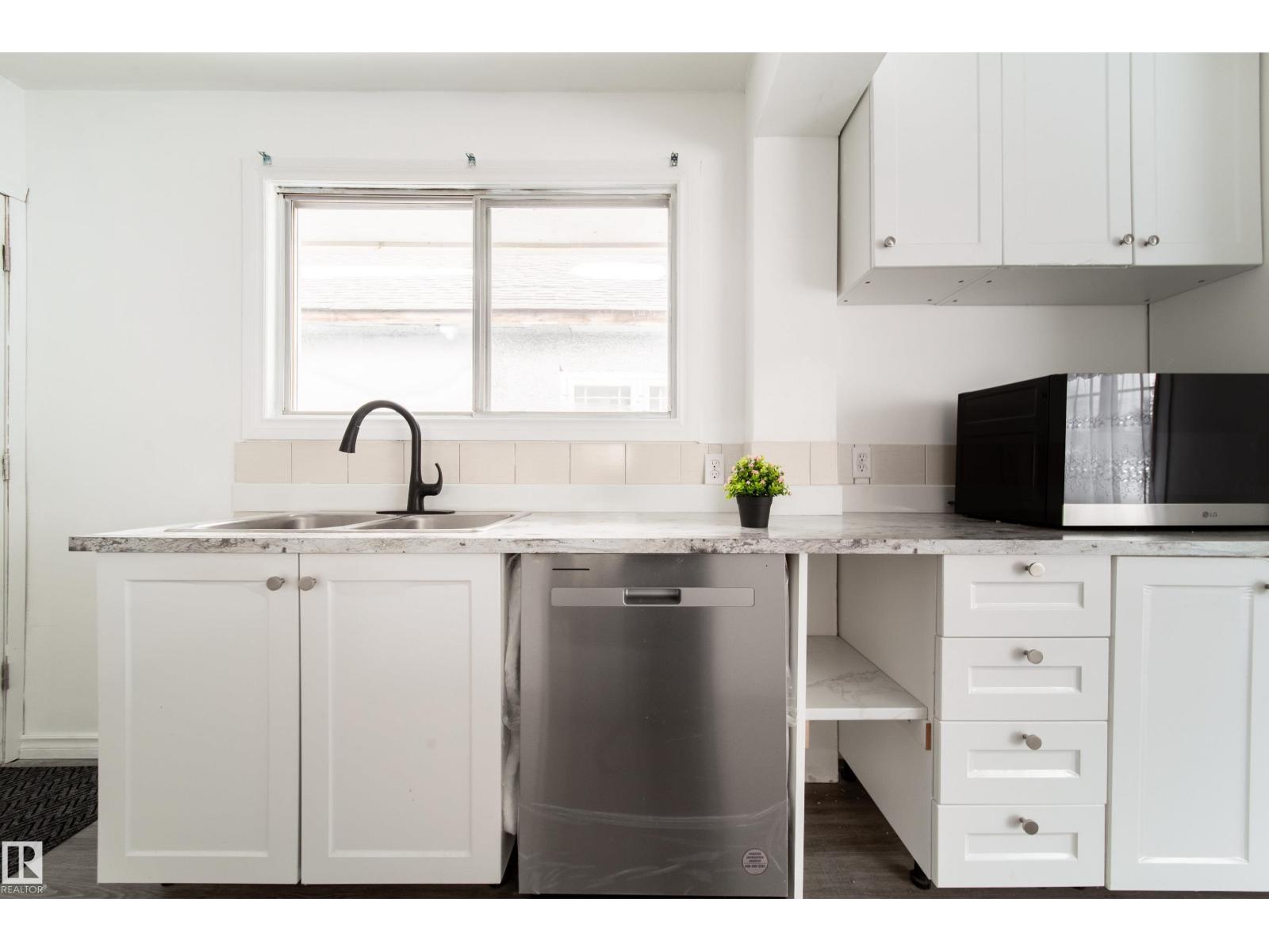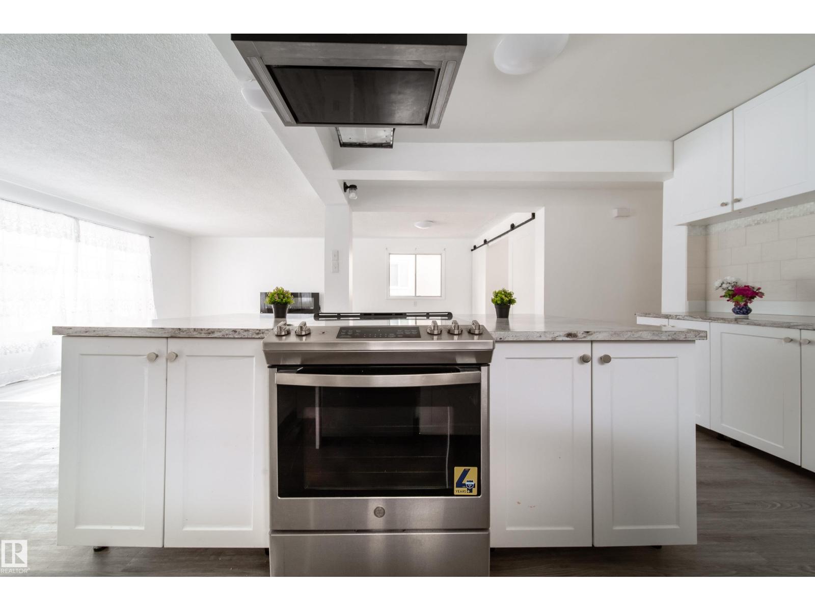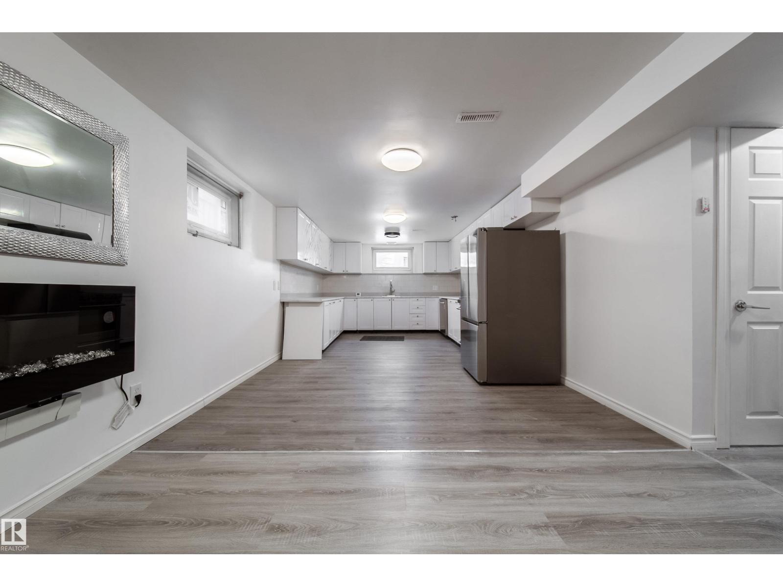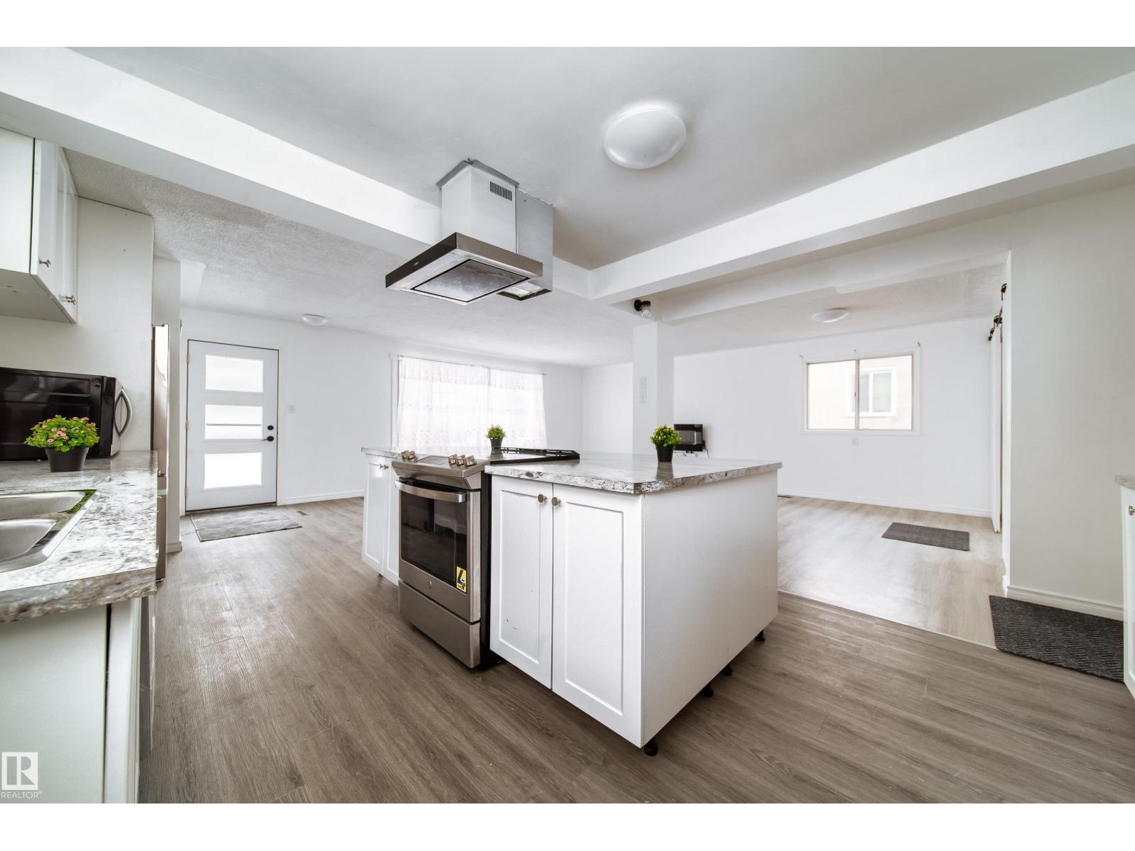 Updated bungalow on a large 459 sq m lot in Parkdale with back lane access and a separate side entrance to the fully finished basement. The main floor features an open-concept layout with a kitchen island, white cabinetry, stainless steel appliances, tile backsplash, and vented hood fan. Vinyl plank in the kitchen and entry, laminate throughout the living and bedroom areas. Three bedrooms on the main plus a 4-piece bathroom with stacked laundry. The basement offers a second full kitchen with stainless appliances, two oversized bedrooms, a 4-piece bathroom with walk-in tile shower, barn doors, and electric fireplace. Two sets of laundry, two fridges, two stoves, two dishwashers. Detached single garage with insulated walls, new garage door and opener, plus a large gravel pad for extra parking and RV storage off the back lane. Newer high-efficiency furnace. Close to schools, shopping, transit, and the Yellowhead. (id:63190)