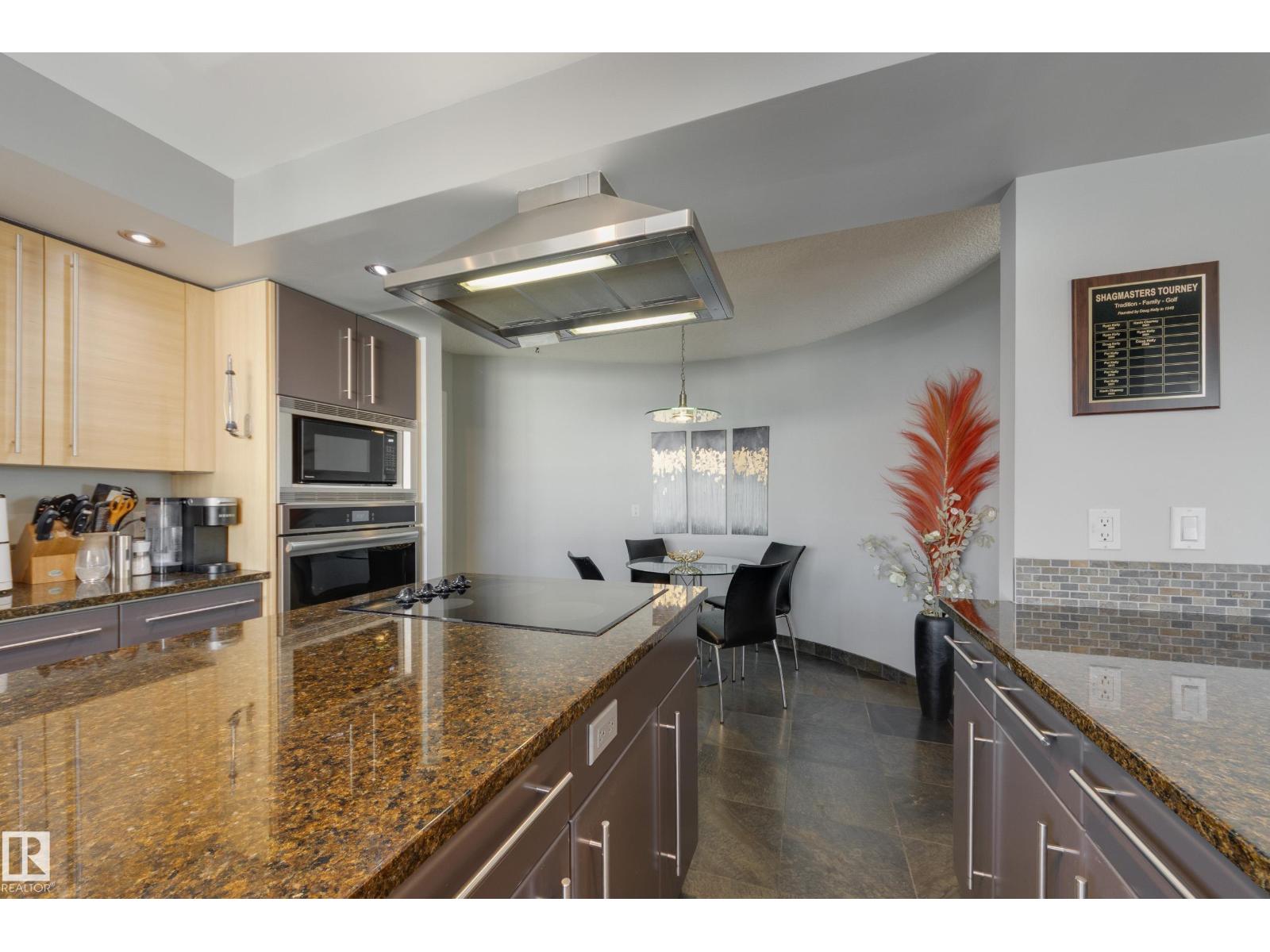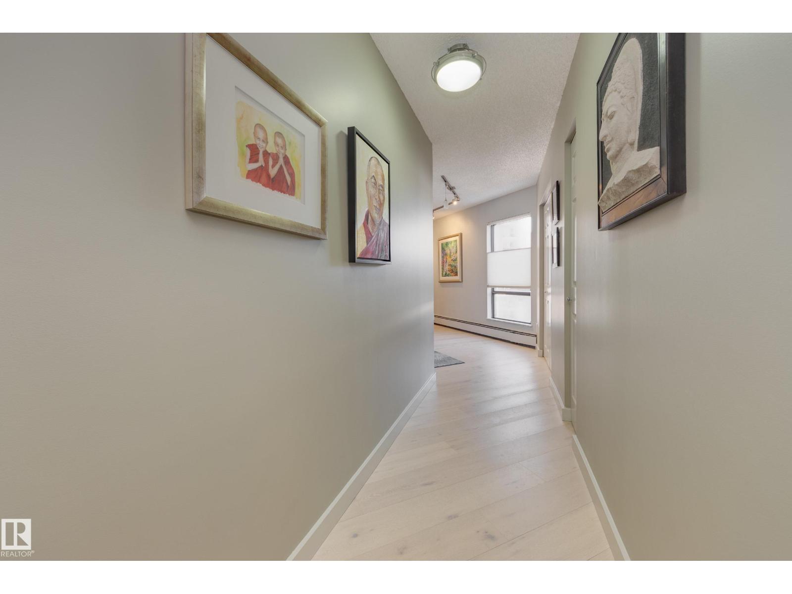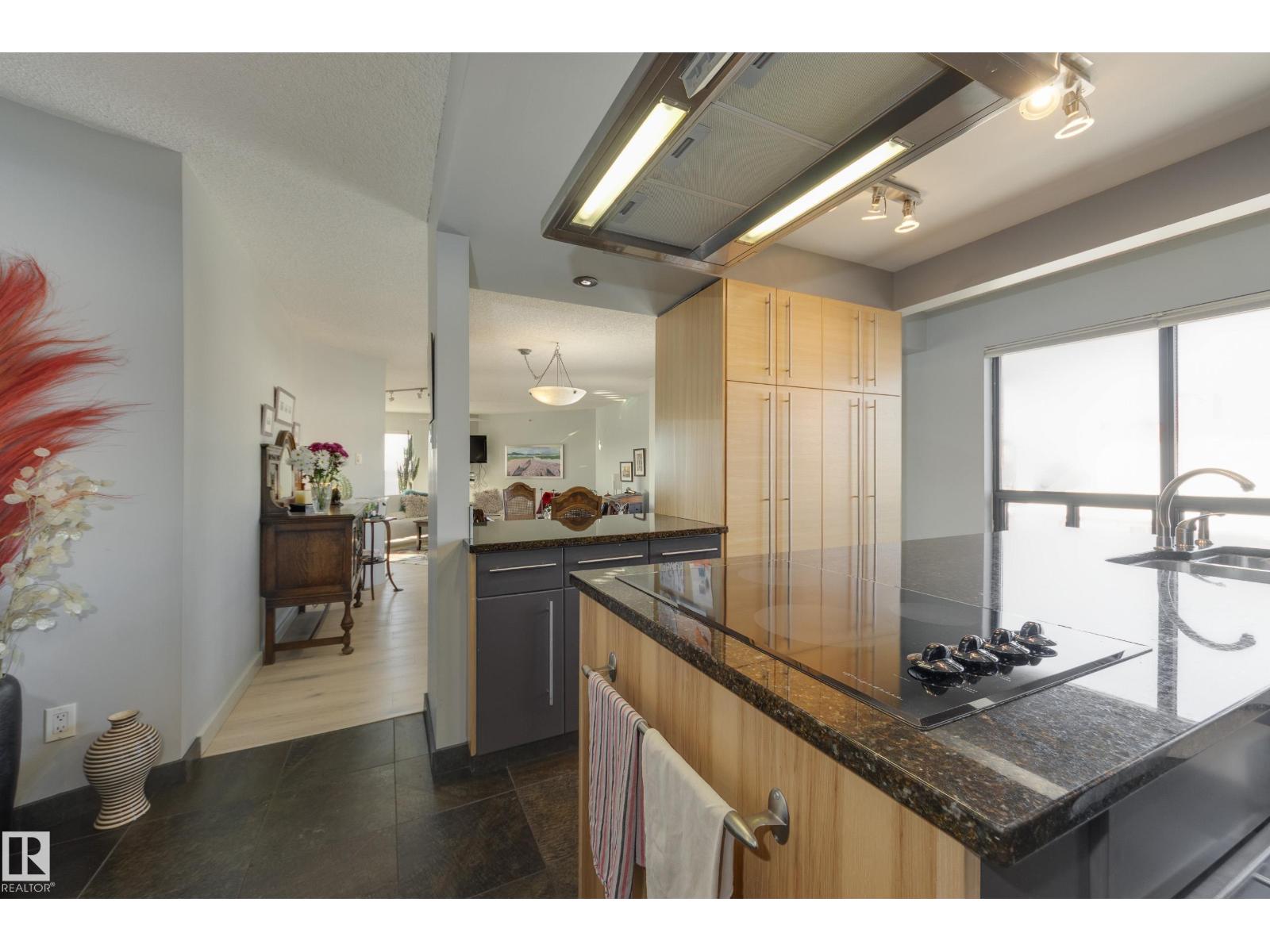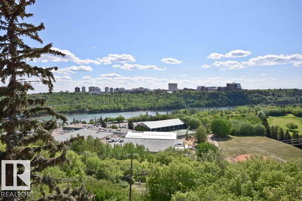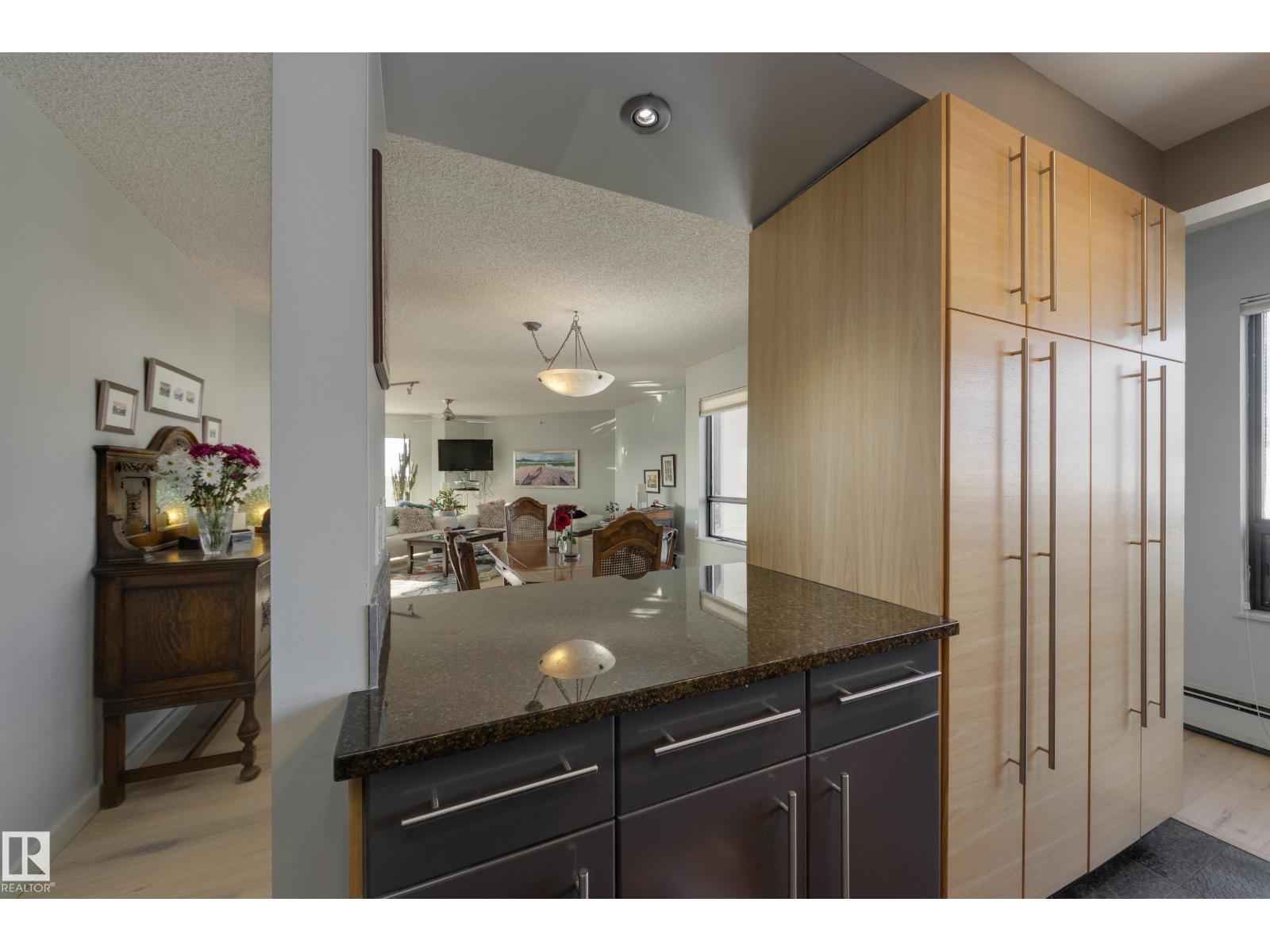 Spectacular RIVER VALLEY and GOLF COURSE views, paired with true UNIQUENESS put this 2 bed, 2 bath condo on the MOST WANTED LIST! Grandin House stands apart with only 10 units and a maximum of 2 suites per floor. The kitchen, open to the living and dining areas features ample hickory and grey lacquer cabinets, granite countertops, newer s/s appliances, ceramic cooktop, built-in oven and microwave, perfect for the chef in the family. New vinyl plank flooring runs throughout, adding a fresh, modern touch. Entertain or simply sit in the spacious living room with stunning year-round views from the balcony or cozy up to the wood-burning fireplace on snowy winter evenings. Down the hall, the primary retreat features a walk-through closet, shower, and vanity that leads into the bedroom with an additional 2pc ensuite. A second bedroom and partially upgraded 4pc bath with jetted tub complete this amazing unit. Can't forget the underground parking, building updates and a new rooftop patio. Just steps to the LRT! (id:63190)
