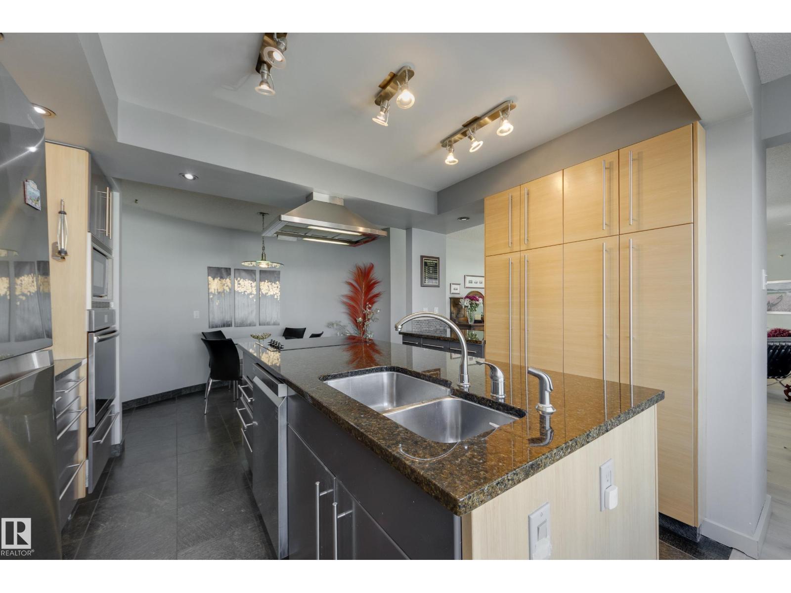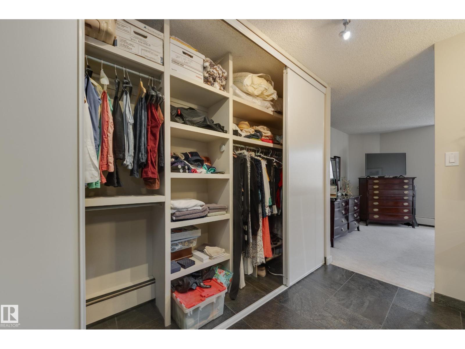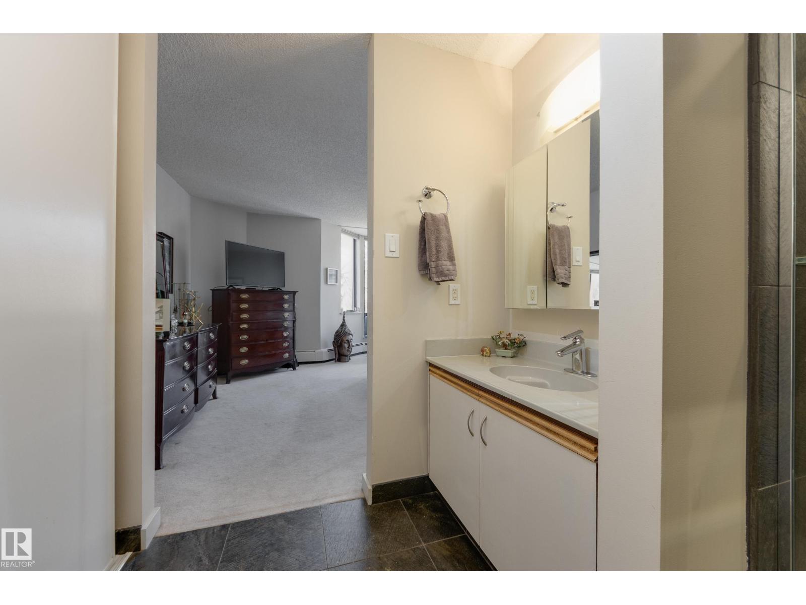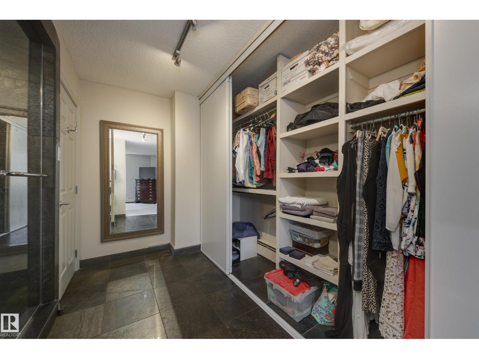 Spectacular RIVER VALLEY and GOLF COURSE views, paired with true UNIQUENESS put this 2 bed, 2 bath condo on the MOST WANTED LIST! Grandin House stands apart with only 10 units and a maximum of 2 suites per floor. The kitchen, open to the living and dining areas features ample hickory and grey lacquer cabinets, granite countertops, newer s/s appliances, ceramic cooktop, built-in oven and microwave, perfect for the chef in the family. New vinyl plank flooring runs throughout, adding a fresh, modern touch. Entertain or simply sit in the spacious living room with stunning year-round views from the balcony or cozy up to the wood-burning fireplace on snowy winter evenings. Down the hall, the primary retreat features a walk-through closet, shower, and vanity that leads into the bedroom with an additional 2pc ensuite. A second bedroom and partially upgraded 4pc bath with jetted tub complete this amazing unit. Can't forget the underground parking, building updates and a new rooftop patio. Just steps to the LRT! (id:63190)