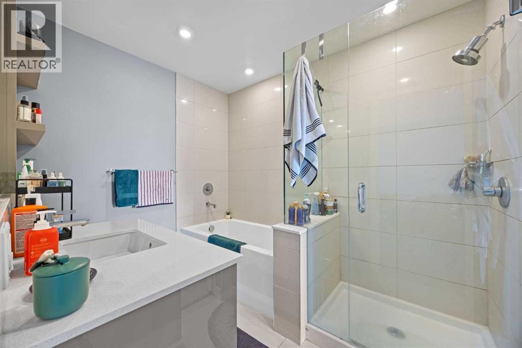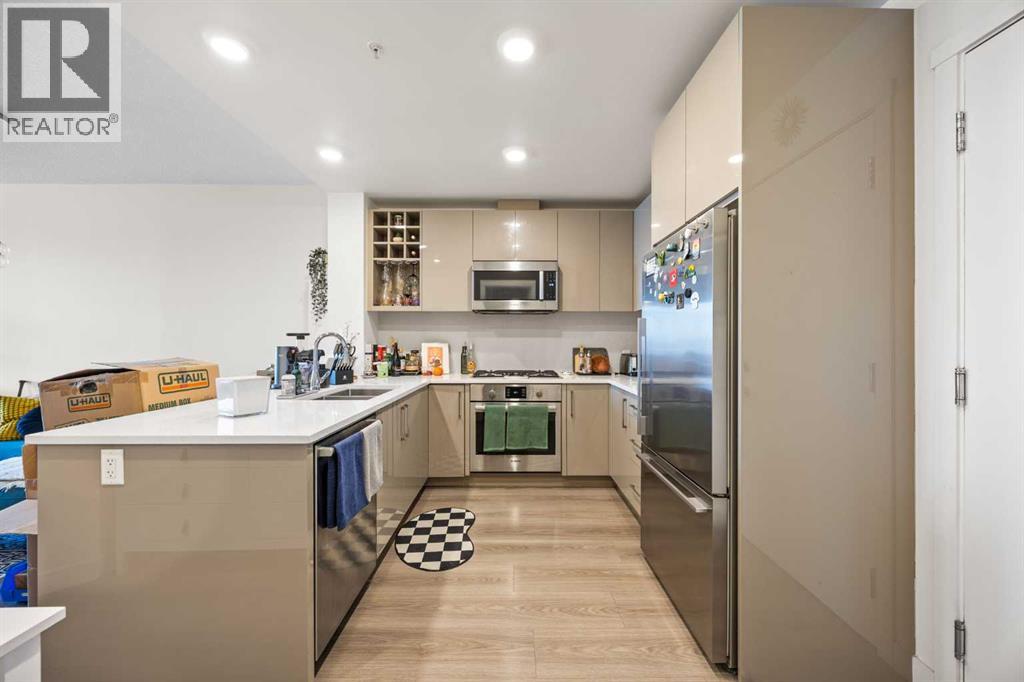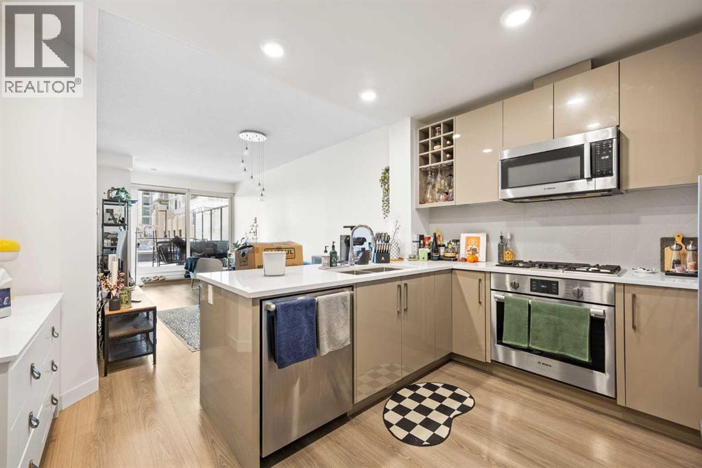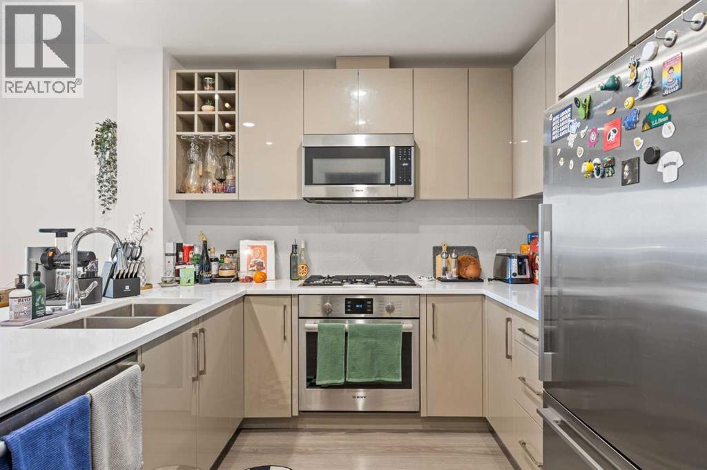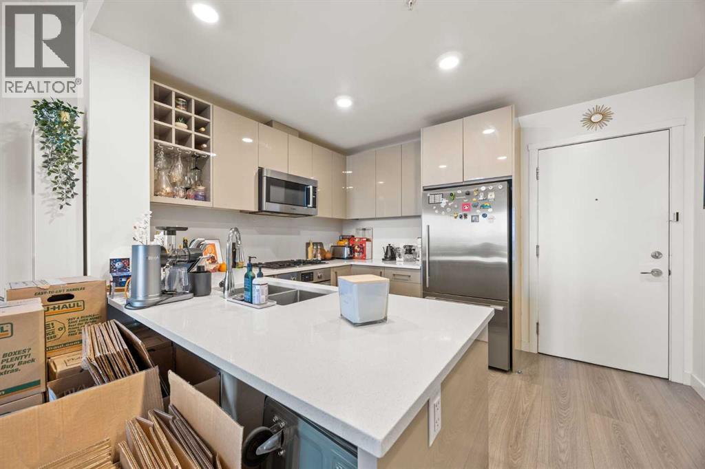 Welcome to urban living at its finest in The Kensington, ideally located in the vibrant community of Hillhurst. This beautifully appointed 1-bedroom, 1-bathroom unit showcases modern finishes and an open-concept layout designed for both comfort and functionality. The stunning U-shaped kitchen features high-gloss cabinetry, excellent counter space, a built-in wine rack, and premium stainless steel Bosch appliances, including a gas stove, perfect for those who love to cook and entertain. The kitchen seamlessly opens to the bright living/dining area, offering flexibility for adding a home office setup or a sunny reading nook. Step outside to your spacious private south facing balcony, complete with a convenient BBQ gas line, ideal for entertaining or relaxing evenings at home. The generous primary bedroom offers a large walk-through closet with thoughtfully designed shelving for maximum organization and direct access to the elegant 4-piece bathroom. Enjoy luxury touches including a deep soaker tub, glass surround stand up shower, large vanity with ample storage, built-in shelving, and a cheater door providing convenient access from the main living space. Additional highlights include a dedicated laundry room near the entrance with side by side washer and dryer with extra storage space and an additional front closet area. Central air conditioning ensures year round comfort and this unit also comes with one TITLED underground parking stall and an assigned storage locker, an added bonus that is priceless with condo living. Additionally the building also offers a residents car wash and bike storage! Residents will love the unbeatable location with retail amenities right on the main floor, including Orange Theory Fitness and a café, plus just a 5-minute walk to Sunnyside LRT station. Enjoy quick access to the Bow River pathways, downtown core, and the countless shops and restaurants that make Kensington one of Calgary’s most sought-after neighbourhoods. This is a rare oppor tunity to own a sophisticated home that perfectly blends luxury, convenience, and that unbeatable inner city lifestyle. (id:63190)