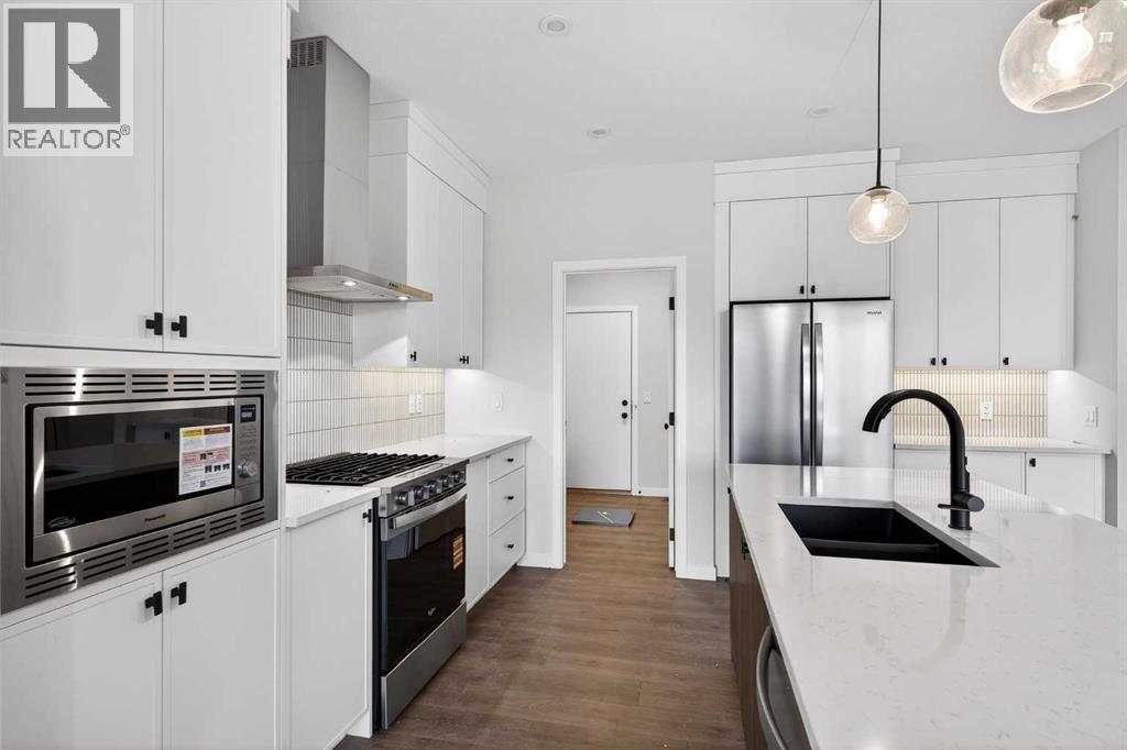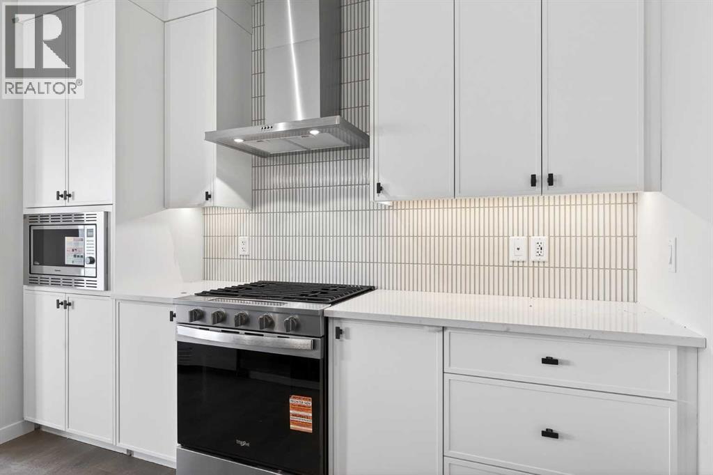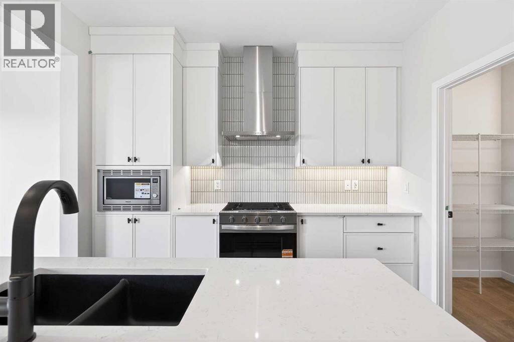 The appliances include a built-in microwave, gas range with chimney hood fan, whisper quiet dishwasher and a fridge with french doors and ice maker