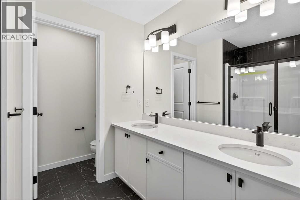 This image shows the spa like ensuite with double sinks and bold tile. This image shows the actual finishes of the bathroom in 533 Sawgrass Green