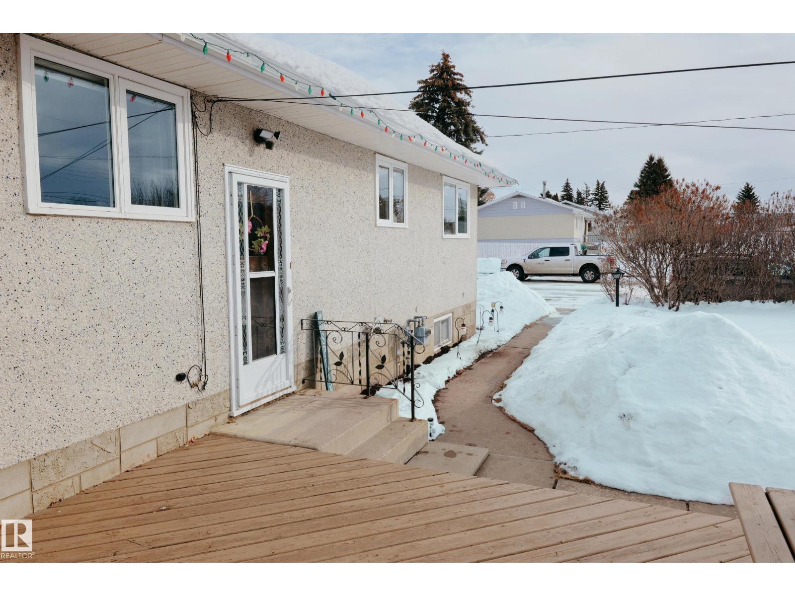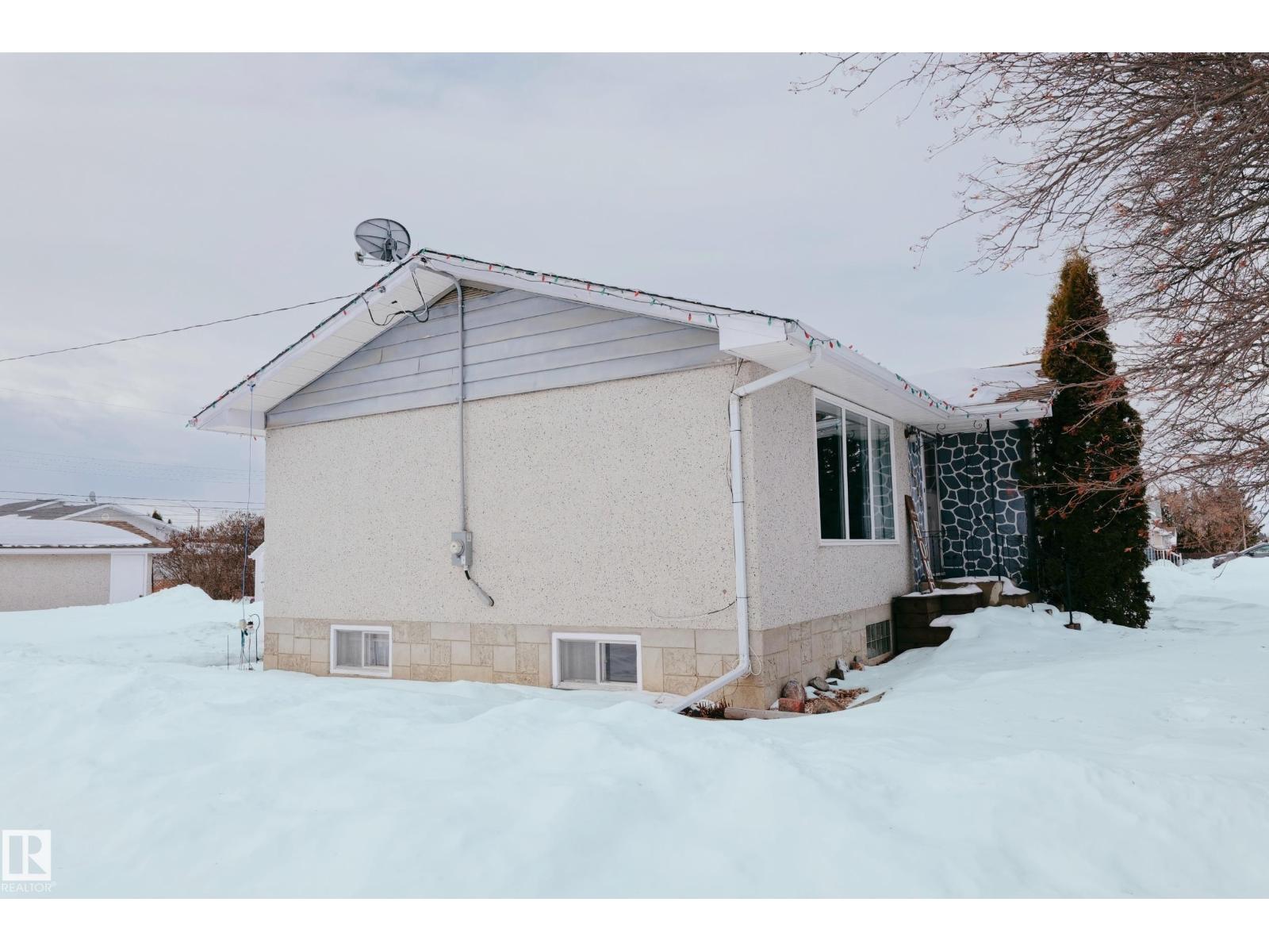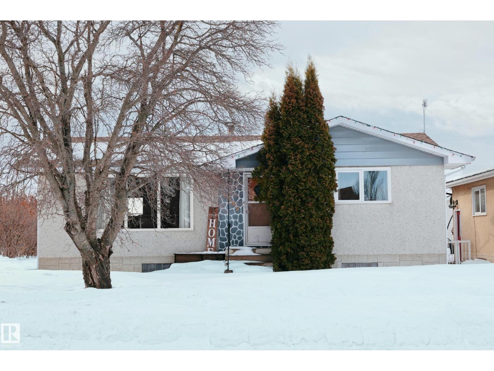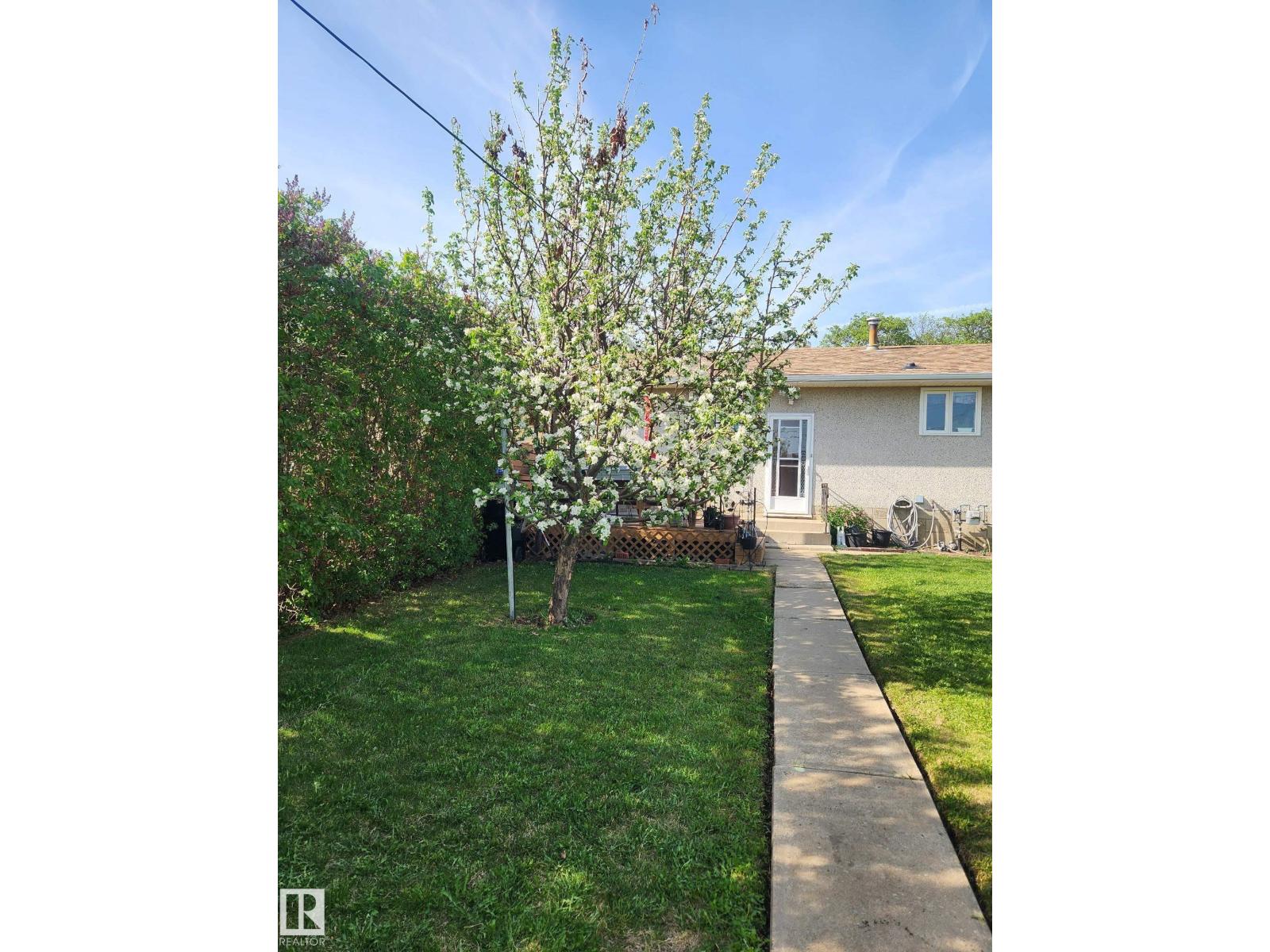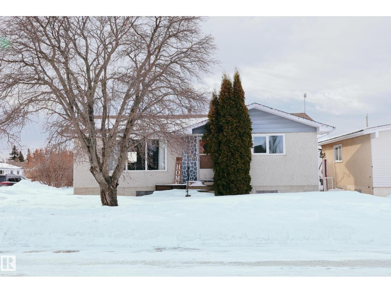 Gorgeously unique corner lot Bungalow located only a half block from the Sports & Rodeo grounds in the high & dry North East side of Barrhead. Well cared for inside & out w/ inviting open concept entrance which provides amazing open feel & great light throughout the main floor. Plentiful kitchen cabinetry featuring an upgraded look. Good dining room table space w/ open flow to the original hardwood floor covered main living room. 2 main floor bedrooms w/ options for 2 additional downstairs along w/ excellent storage. Stylish 4 pc bathroom along w/ spacious 3 pc shower bathroom down. Dedicated laundry area w/ space for freezer & side pantry. Beautiful yard features a central firepit area as well as upgraded flower bed displays plus decorative rock accenting. South sun catching garden space. Detached garage/ workshop. Extra on street & off street parking includes additional rear gravel pad not pictured. Add your own personal touches to make your own. Ready & awaiting you. (id:63190)