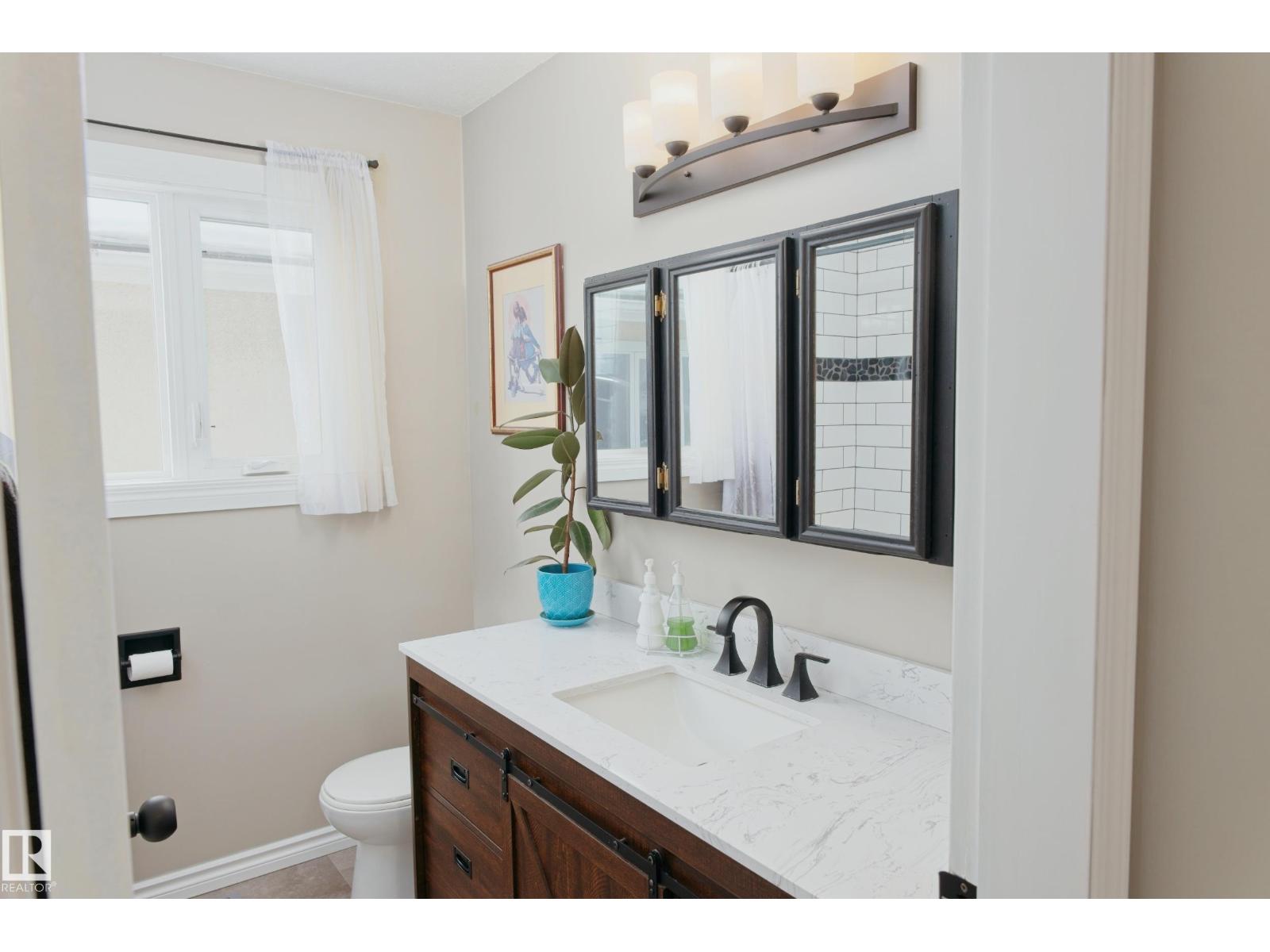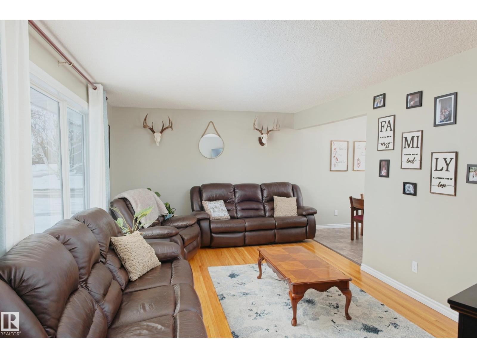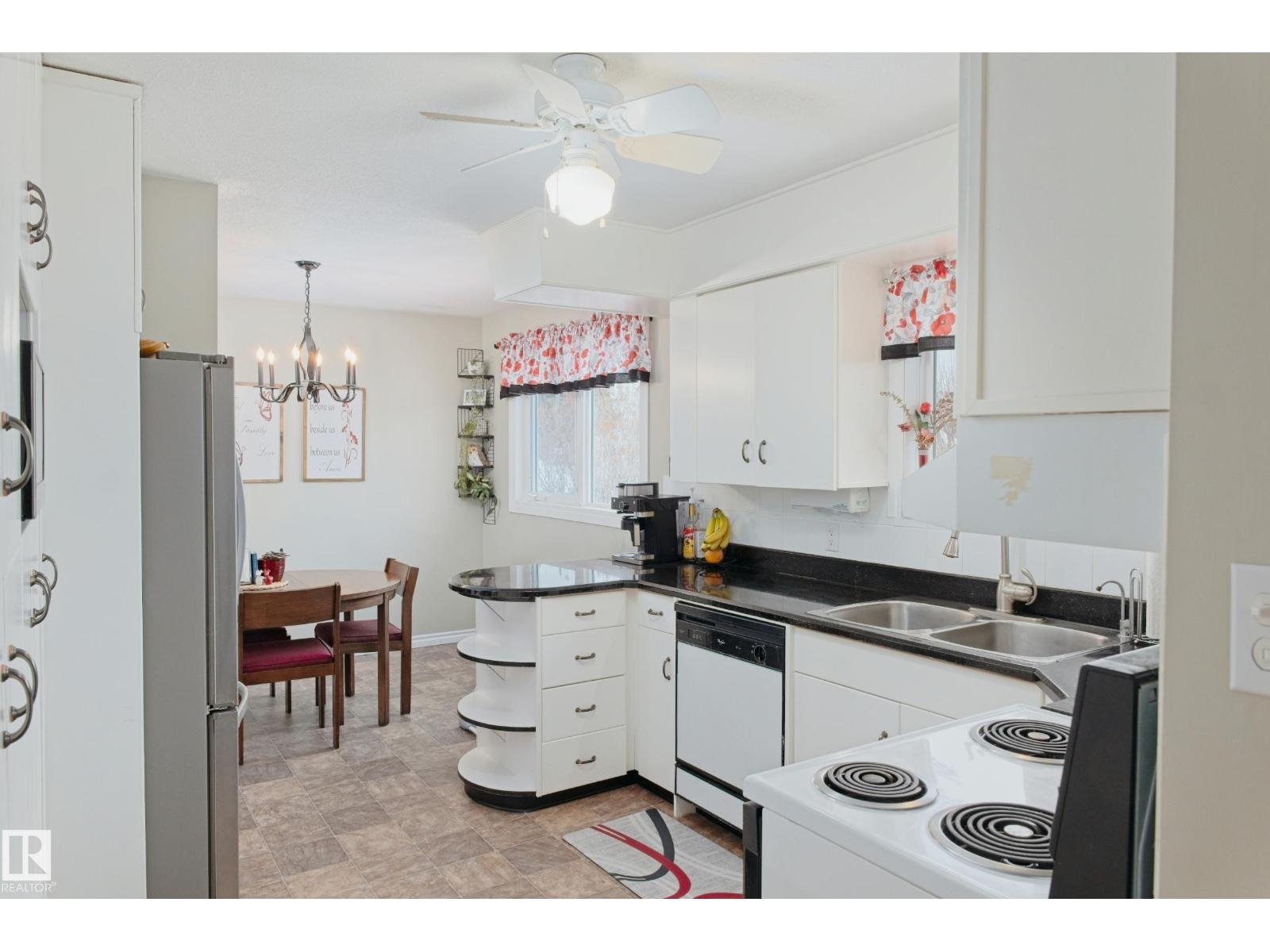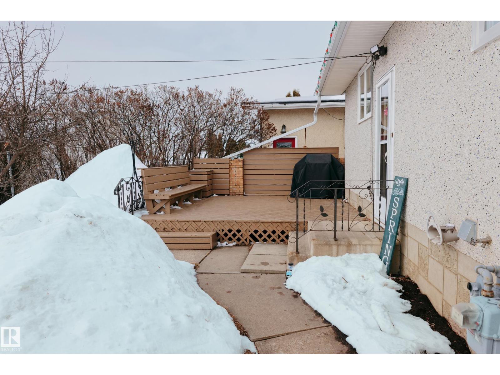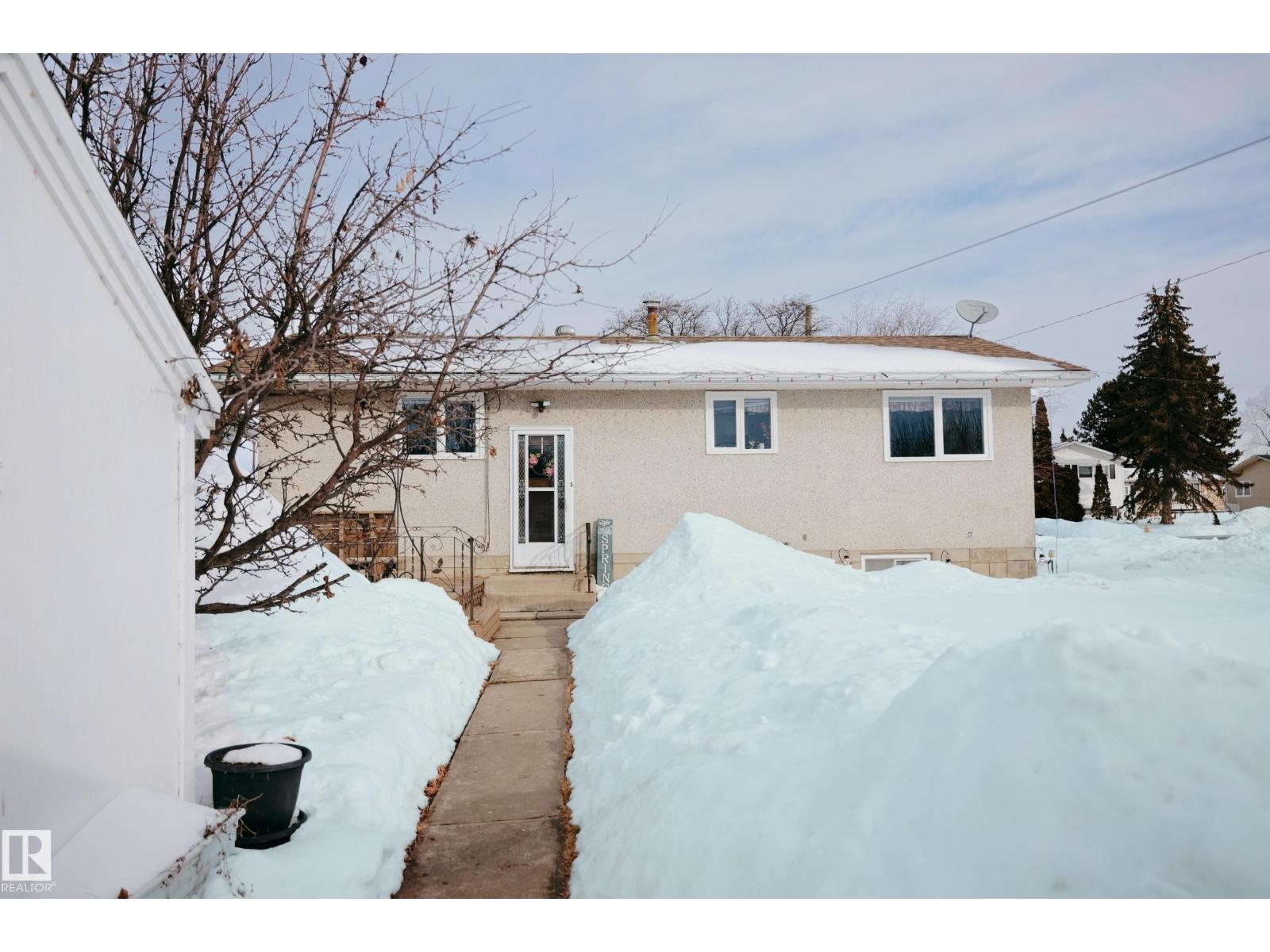 Gorgeously unique corner lot Bungalow located only a half block from the Sports & Rodeo grounds in the high & dry North East side of Barrhead. Well cared for inside & out w/ inviting open concept entrance which provides amazing open feel & great light throughout the main floor. Plentiful kitchen cabinetry featuring an upgraded look. Good dining room table space w/ open flow to the original hardwood floor covered main living room. 2 main floor bedrooms w/ options for 2 additional downstairs along w/ excellent storage. Stylish 4 pc bathroom along w/ spacious 3 pc shower bathroom down. Dedicated laundry area w/ space for freezer & side pantry. Beautiful yard features a central firepit area as well as upgraded flower bed displays plus decorative rock accenting. South sun catching garden space. Detached garage/ workshop. Extra on street & off street parking includes additional rear gravel pad not pictured. Add your own personal touches to make your own. Ready & awaiting you. (id:63190)