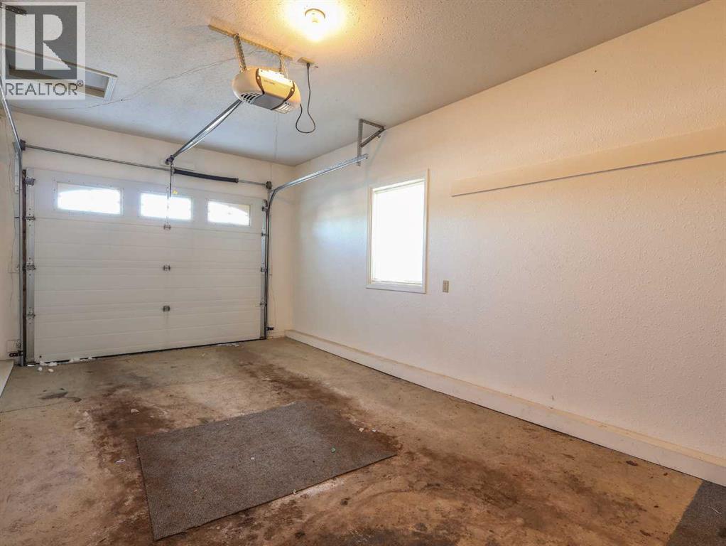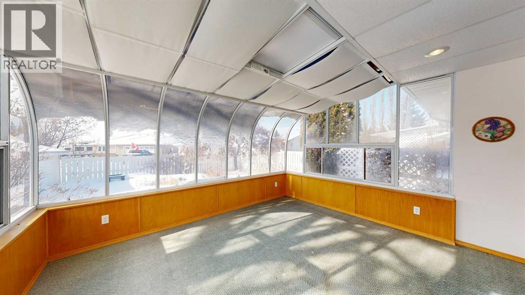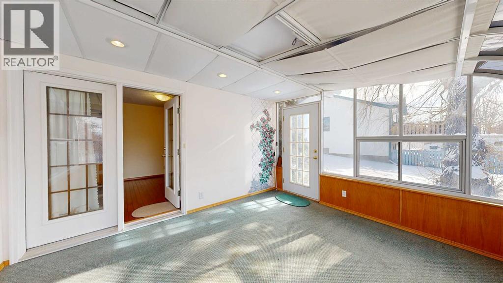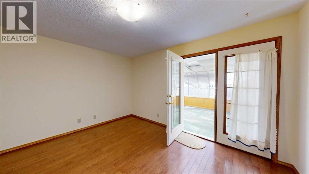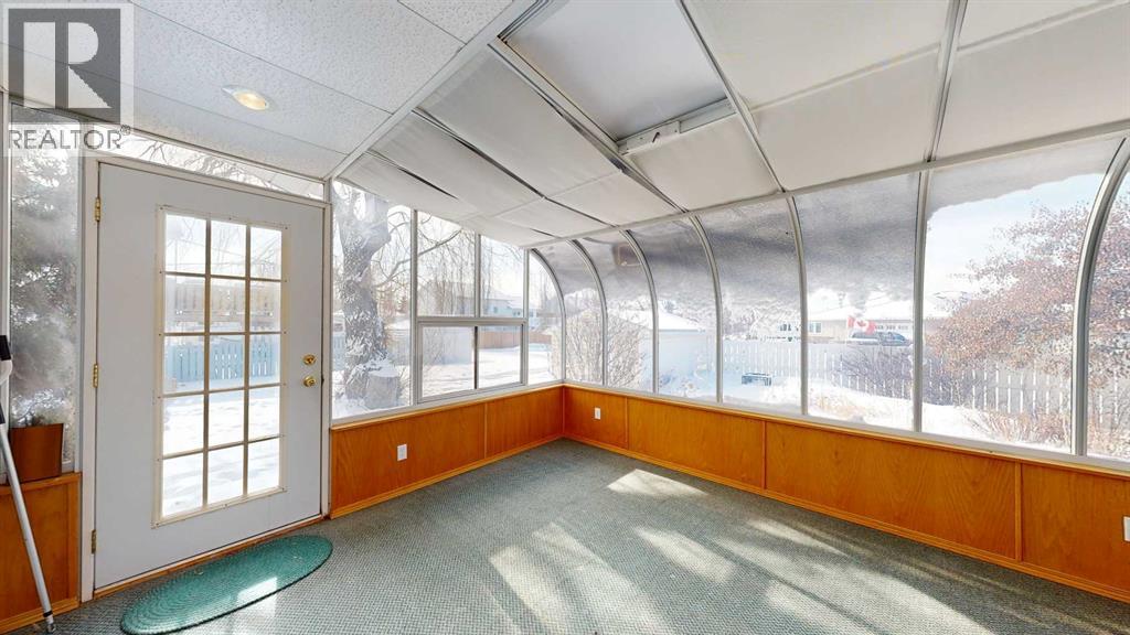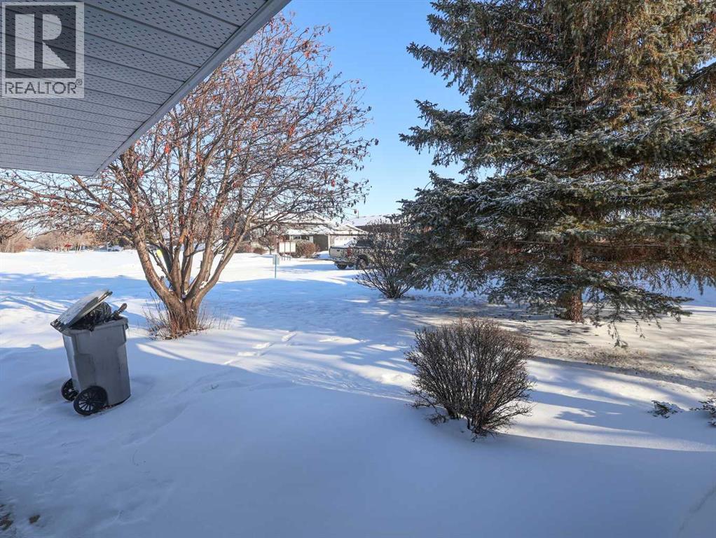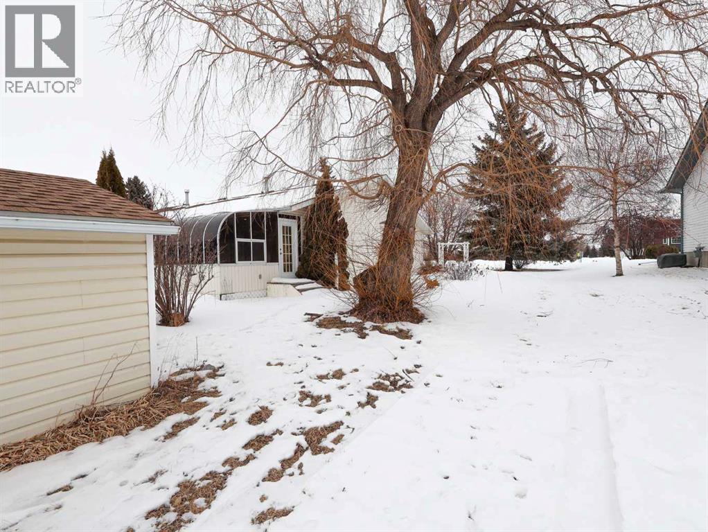 Welcome to this bright and inviting half duplex, featuring beautiful oak hardwood flooring along with matching oak baseboards and trim throughout the main level. The spacious living room greets you with charming bay windows and flows seamlessly into the open-concept kitchen, complete with white cabinetry, a convenient pantry, and ample space for a dining table. The large primary bedroom offers a private 2-piece ensuite, while the second bedroom provides access to a west-facing sunroom with shades and a door leading to the backyard — the perfect spot to enjoy afternoon sunshine. A bright 4-piece bathroom and a dedicated main floor laundry room with built-in cabinetry add everyday convenience. Downstairs, the fully developed basement is bright and welcoming, featuring a generous family room with a unique wall niche at the base of the stairs. This level also includes an additional bedroom, a den with French doors, a 3-piece bathroom with shower, and a spacious utility room with shelving and plenty of storage space. Additional highlights include central vacuum, central air, and a single attached garage. Outside, the front yard features a mature shade tree and faces a large greenspace, offering an open and pleasant view. The partially fenced backyard includes a garden shed and is enhanced by trees and shrubs that provide privacy and shade. Ideally located on a quiet street just a few blocks from the south edge of Stettler, this home also offers the added convenience of a nearby playground. A wonderful opportunity offering comfort, functionality, and a great location! (id:63190)