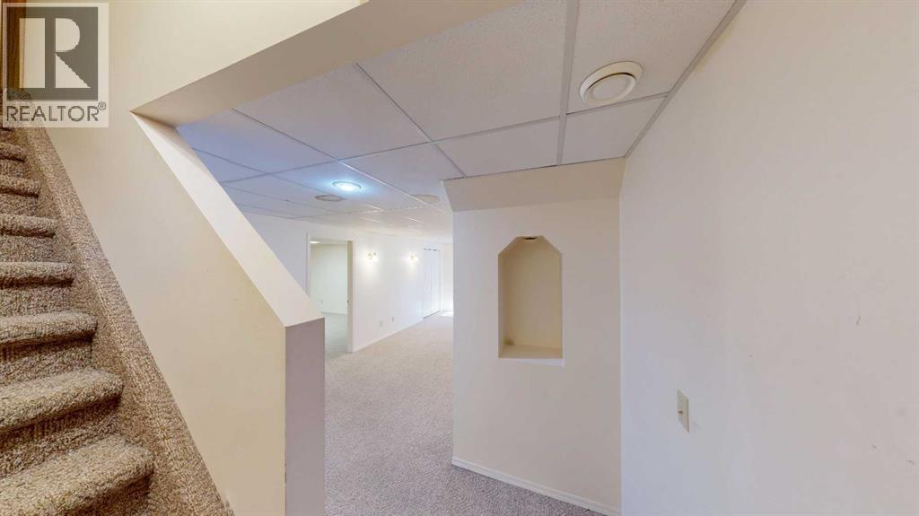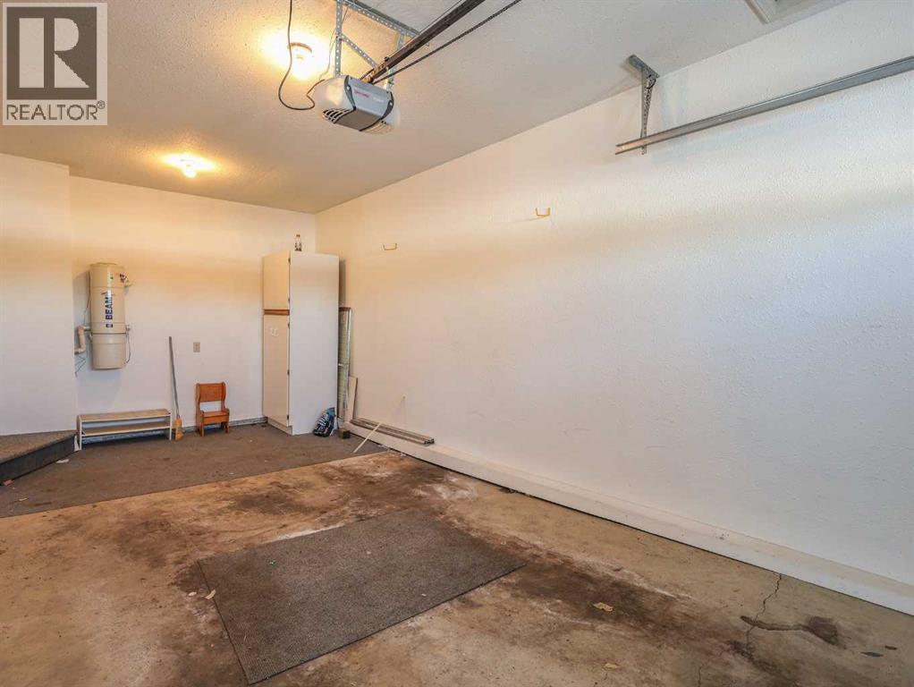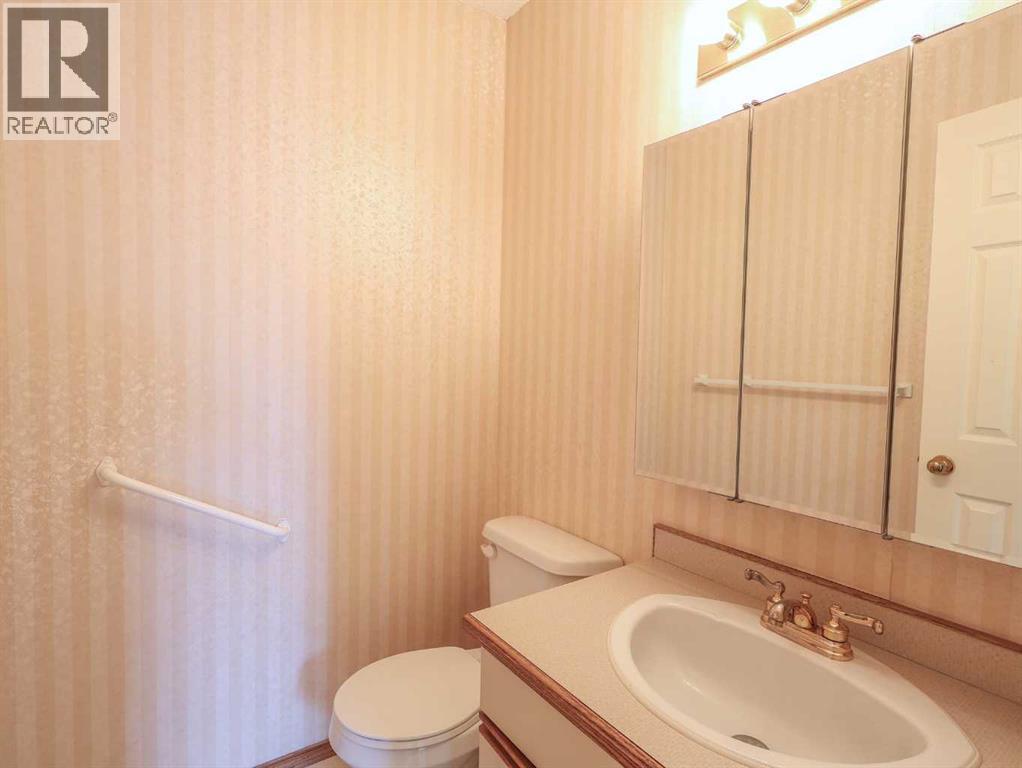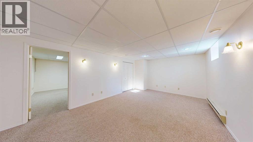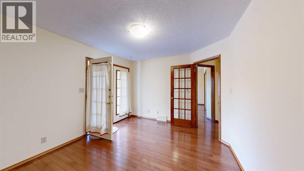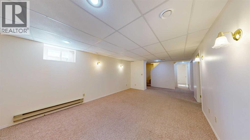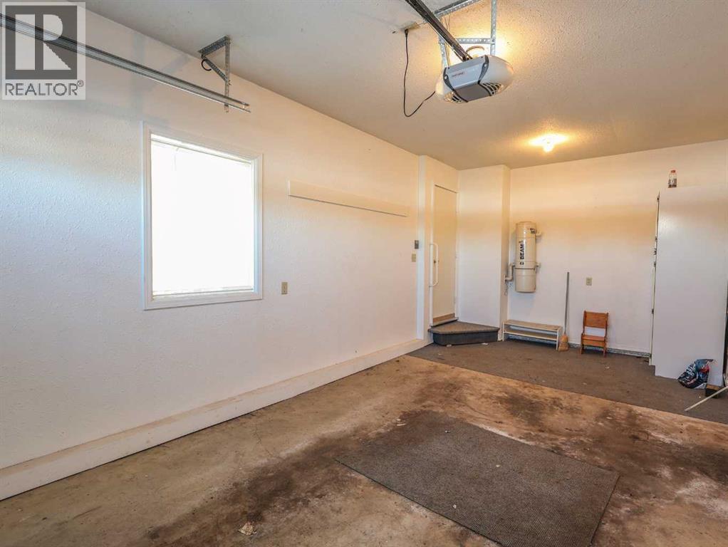 Welcome to this bright and inviting half duplex, featuring beautiful oak hardwood flooring along with matching oak baseboards and trim throughout the main level. The spacious living room greets you with charming bay windows and flows seamlessly into the open-concept kitchen, complete with white cabinetry, a convenient pantry, and ample space for a dining table. The large primary bedroom offers a private 2-piece ensuite, while the second bedroom provides access to a west-facing sunroom with shades and a door leading to the backyard — the perfect spot to enjoy afternoon sunshine. A bright 4-piece bathroom and a dedicated main floor laundry room with built-in cabinetry add everyday convenience. Downstairs, the fully developed basement is bright and welcoming, featuring a generous family room with a unique wall niche at the base of the stairs. This level also includes an additional bedroom, a den with French doors, a 3-piece bathroom with shower, and a spacious utility room with shelving and plenty of storage space. Additional highlights include central vacuum, central air, and a single attached garage. Outside, the front yard features a mature shade tree and faces a large greenspace, offering an open and pleasant view. The partially fenced backyard includes a garden shed and is enhanced by trees and shrubs that provide privacy and shade. Ideally located on a quiet street just a few blocks from the south edge of Stettler, this home also offers the added convenience of a nearby playground. A wonderful opportunity offering comfort, functionality, and a great location! (id:63190)